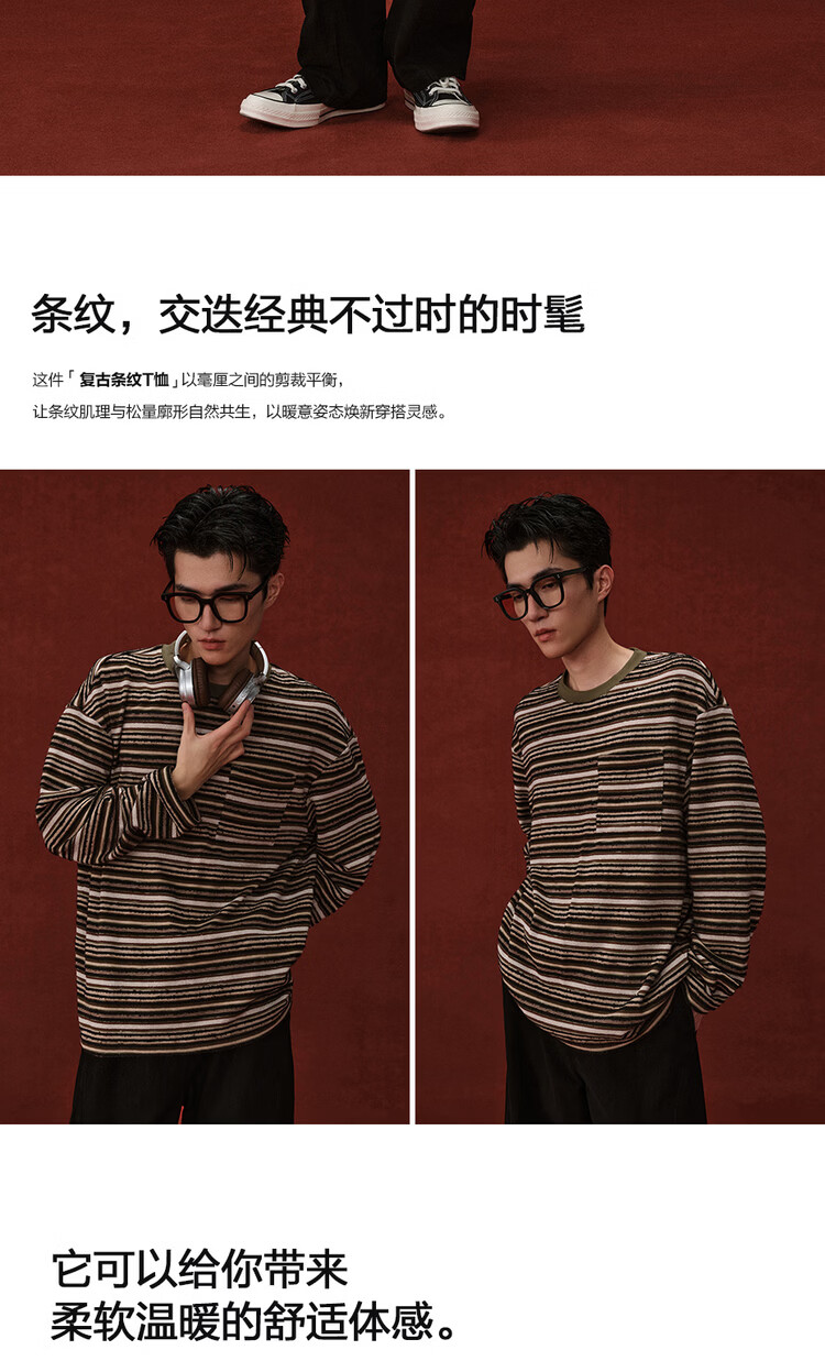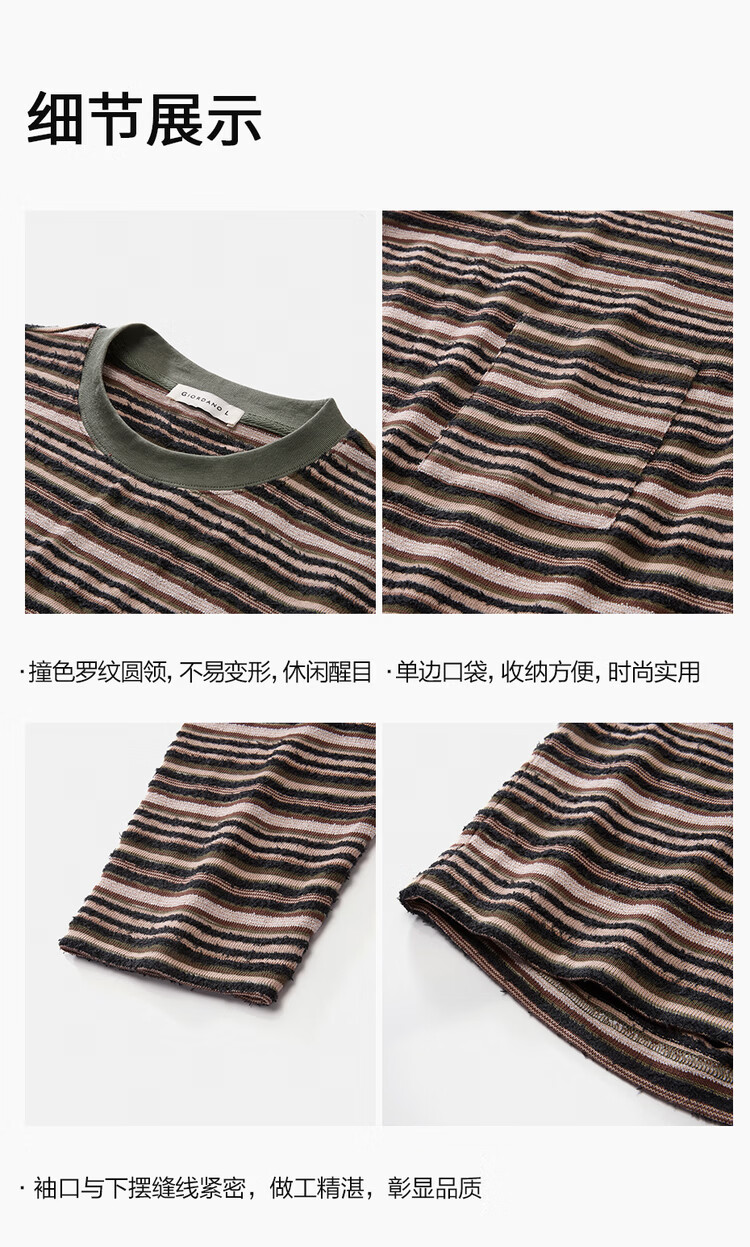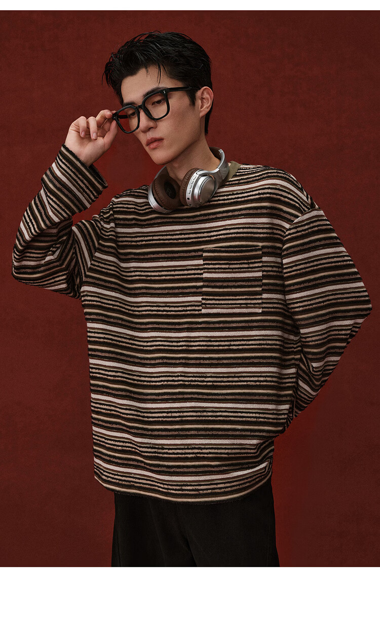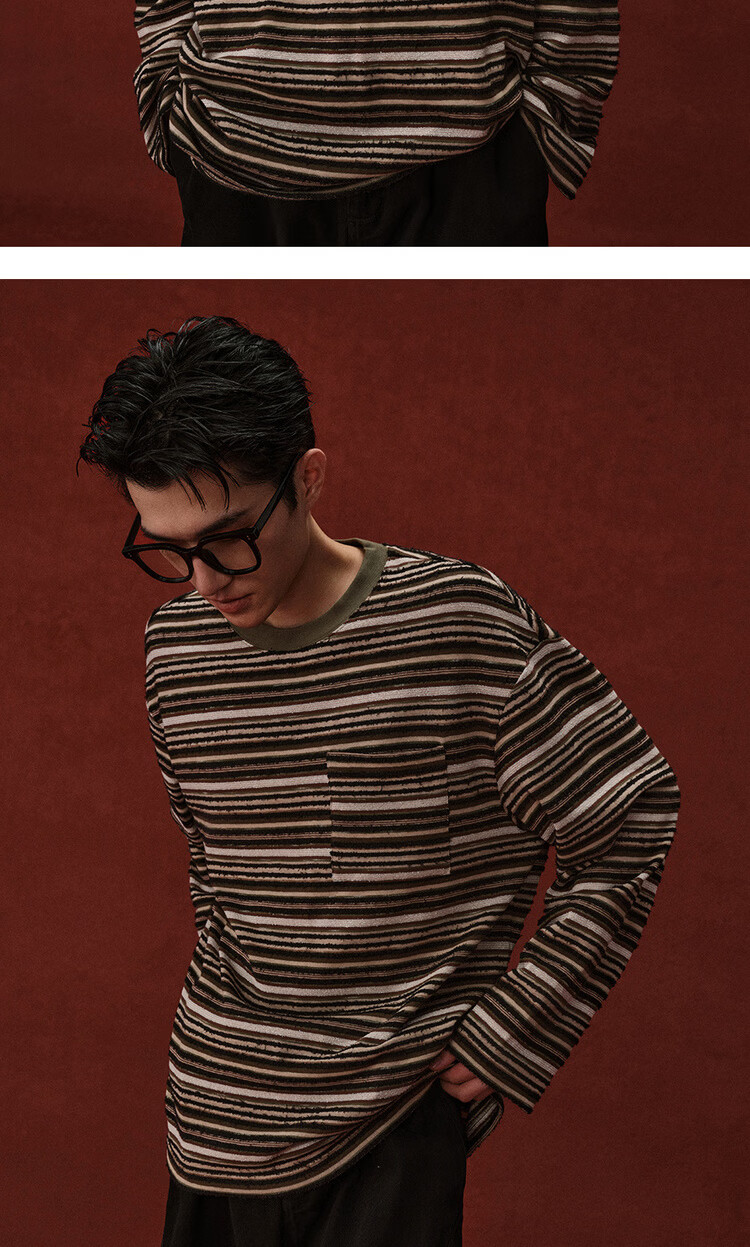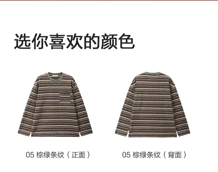 Giordano Designer 2026 Spring New Style Pocket Loose Round Neck Striped T-Shirt Men's Long Sleeve 18026703 05 Brown Green Striped M