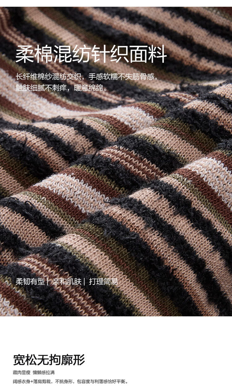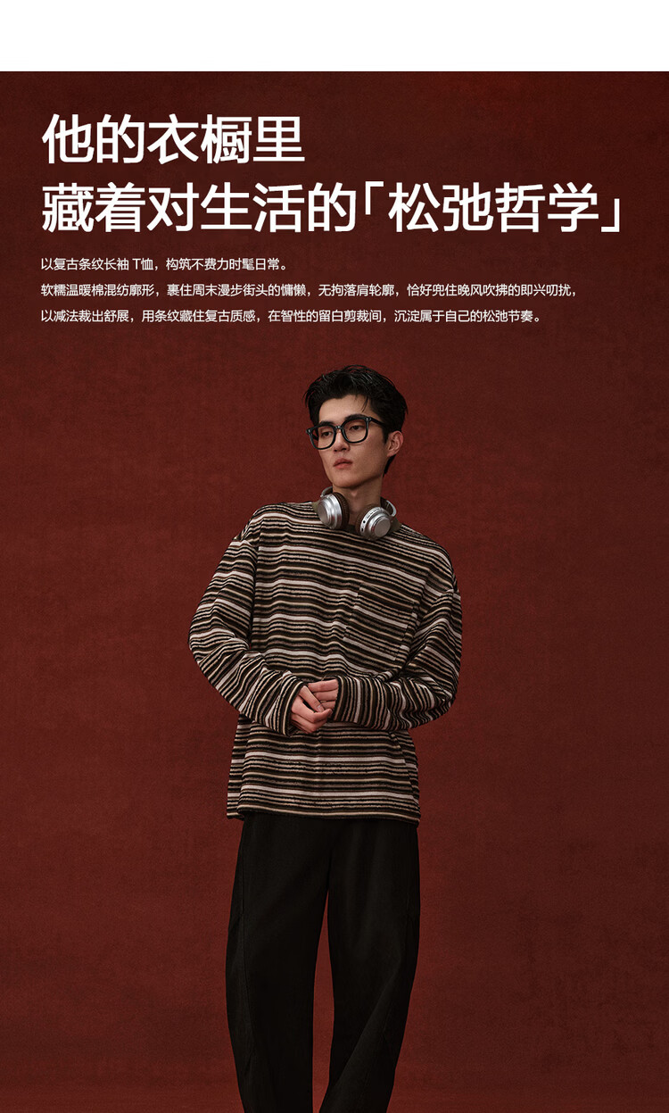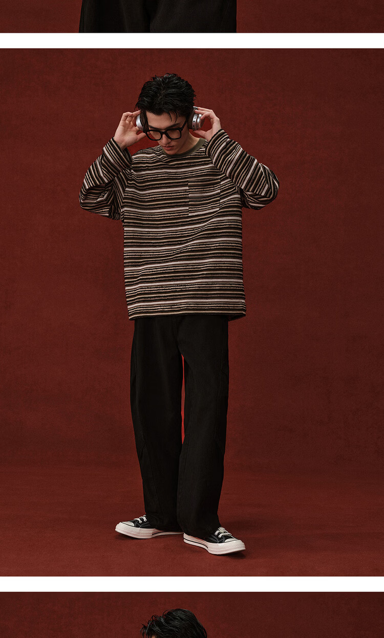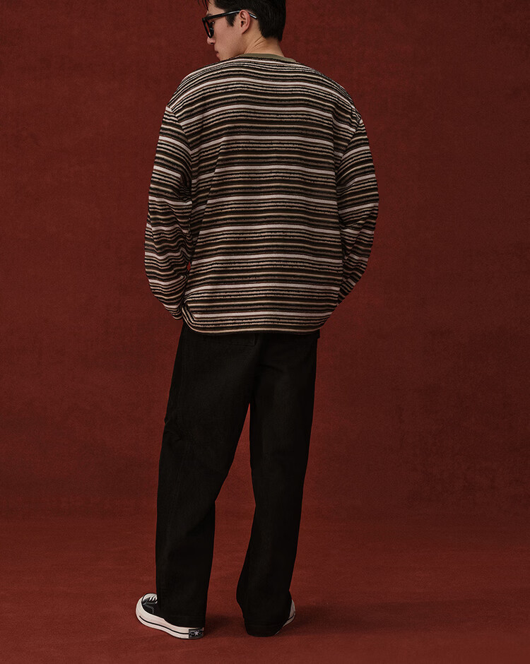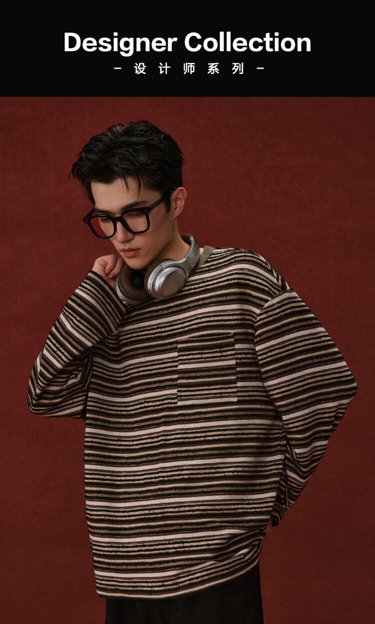 Giordano Designer 2026 Spring New Style Pocket Loose Round Neck Striped T-Shirt Men's Long Sleeve 18026703 05 Brown Green Striped M