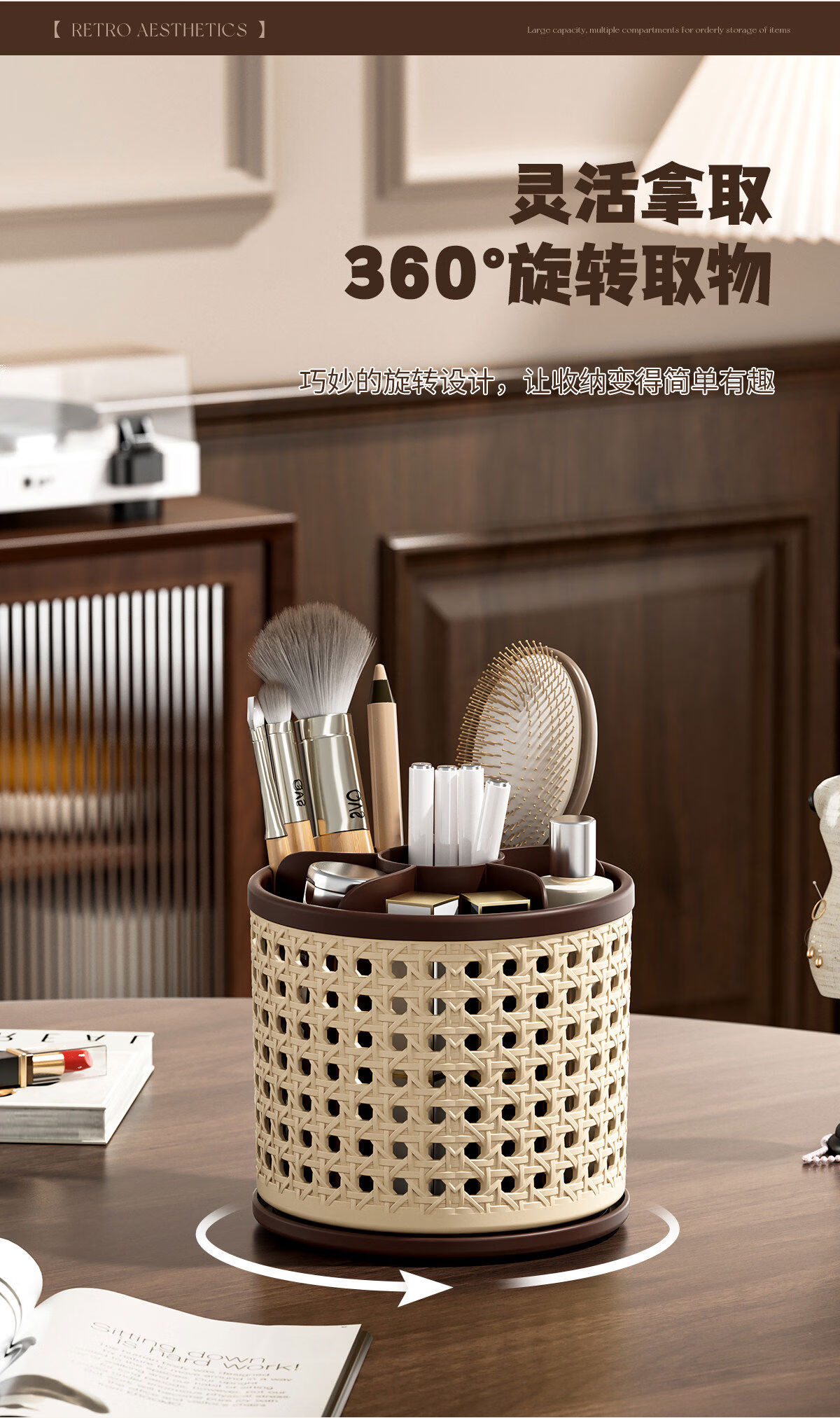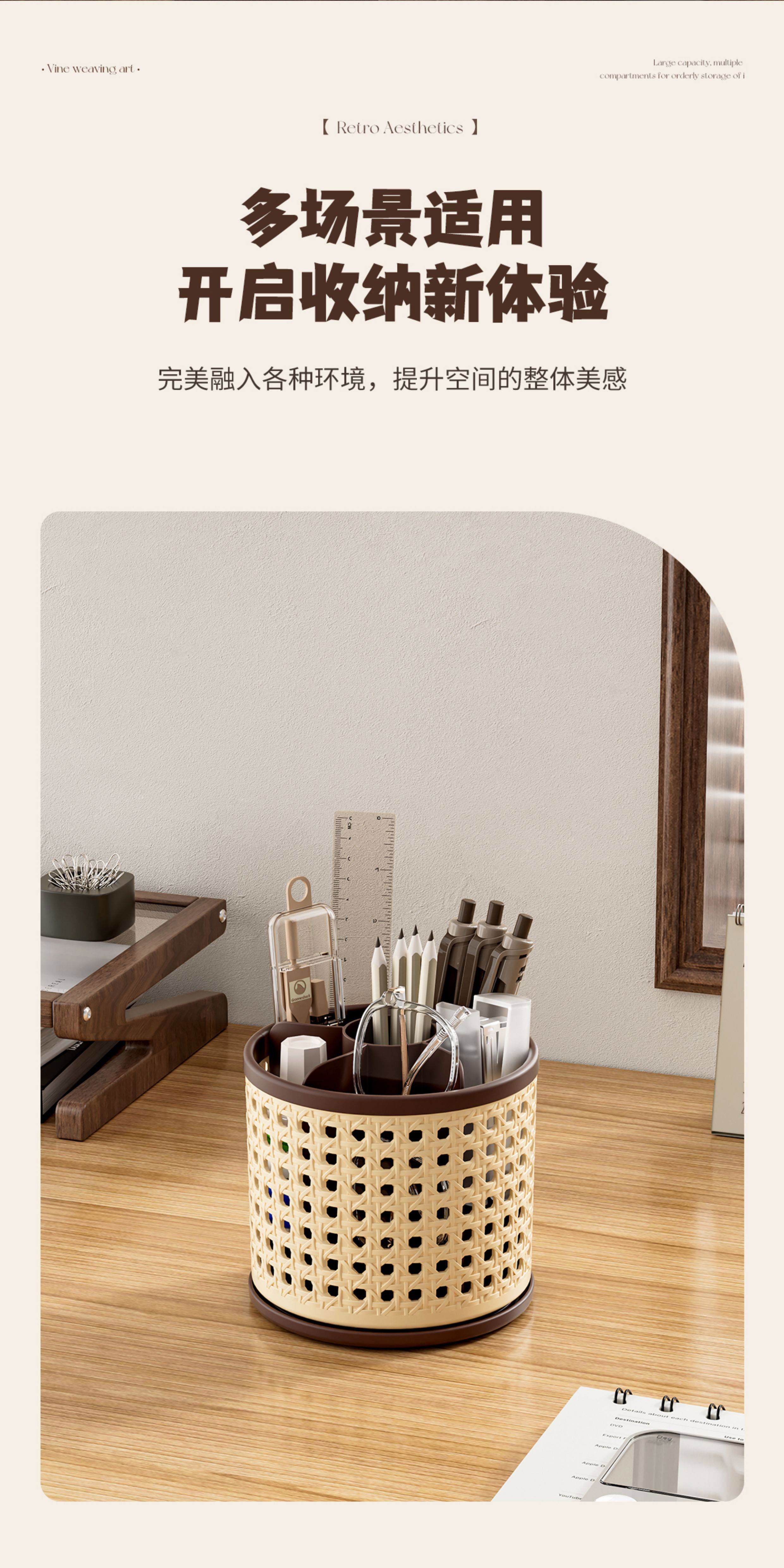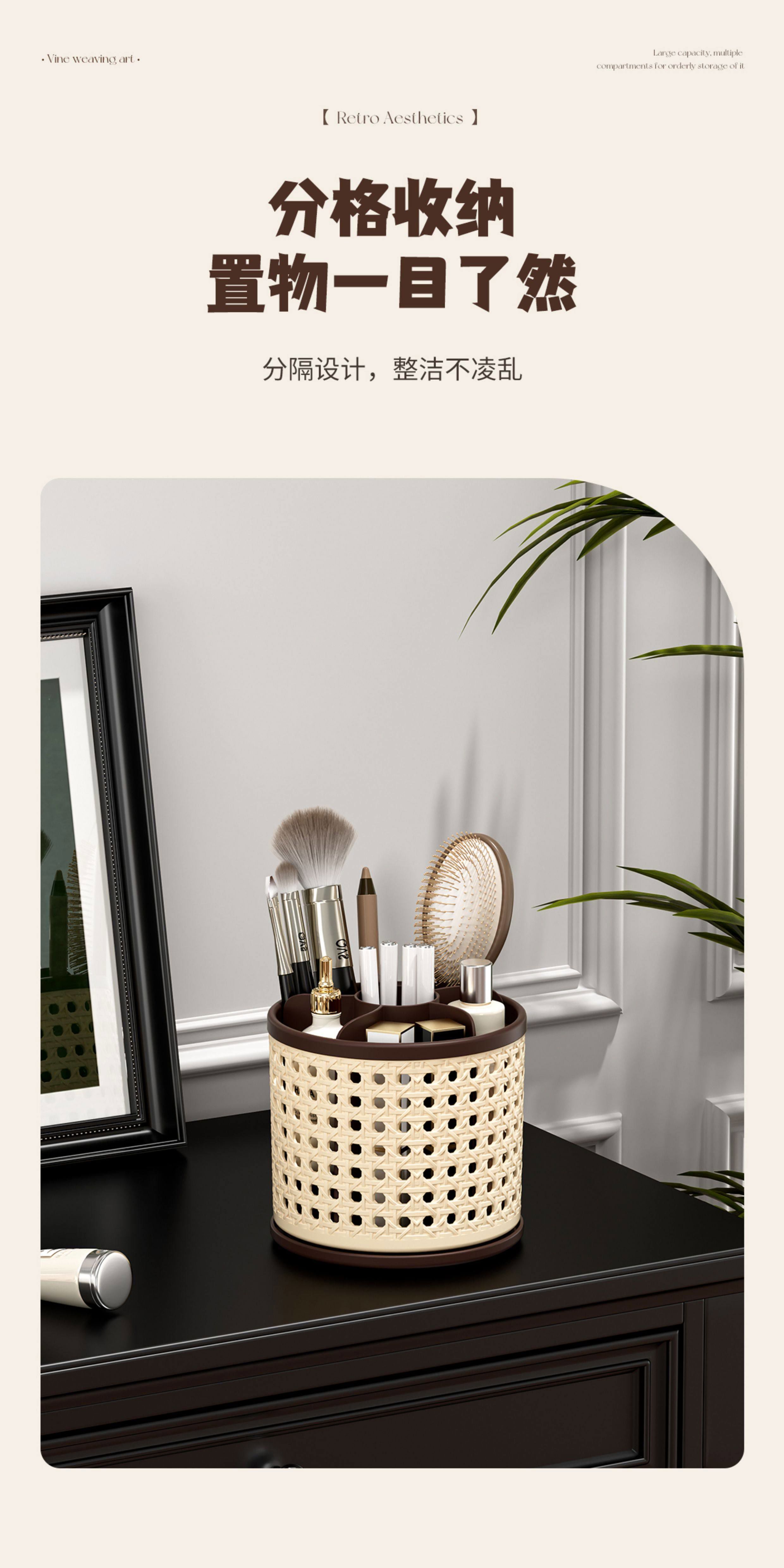 Fantasy makeup brush storage tube-like rattan basket covered antique dressing table cosmetics compartment rotating desktop storage rack black 1 piece