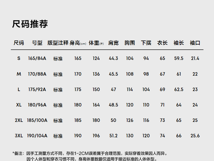 China (cm) 165 / 88-90 170 / 96-98 175 / 108-110 180 / 118-122 185 / 126-130