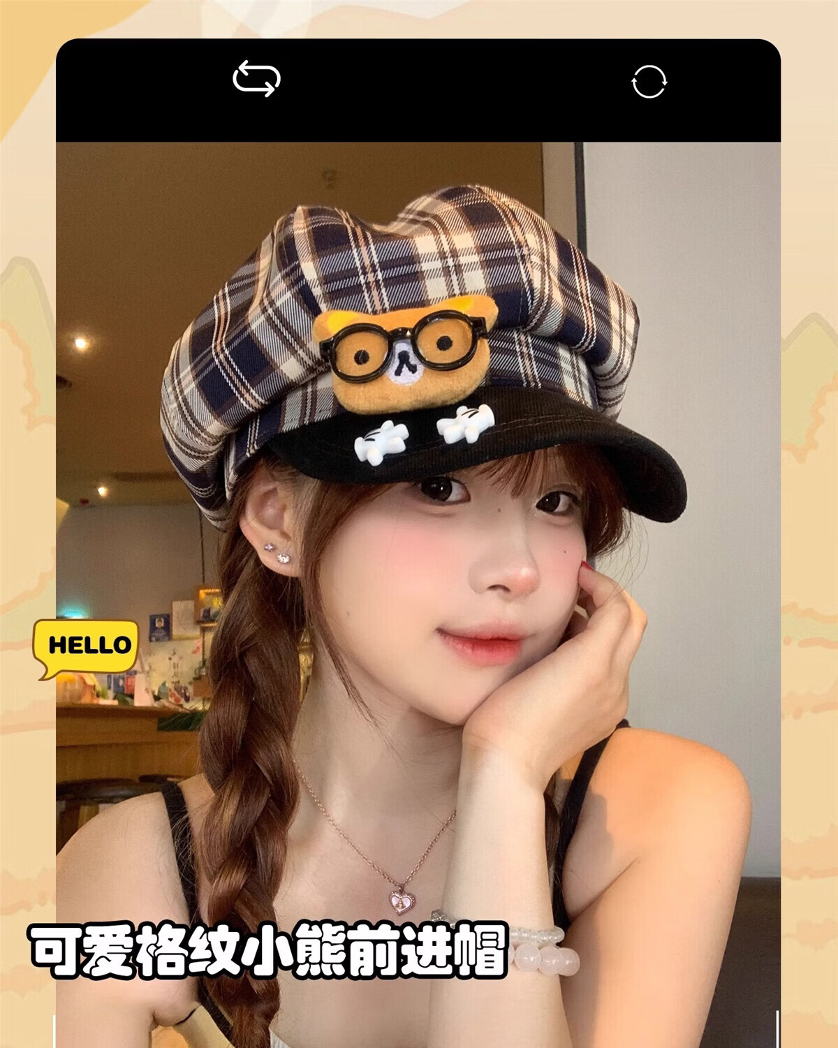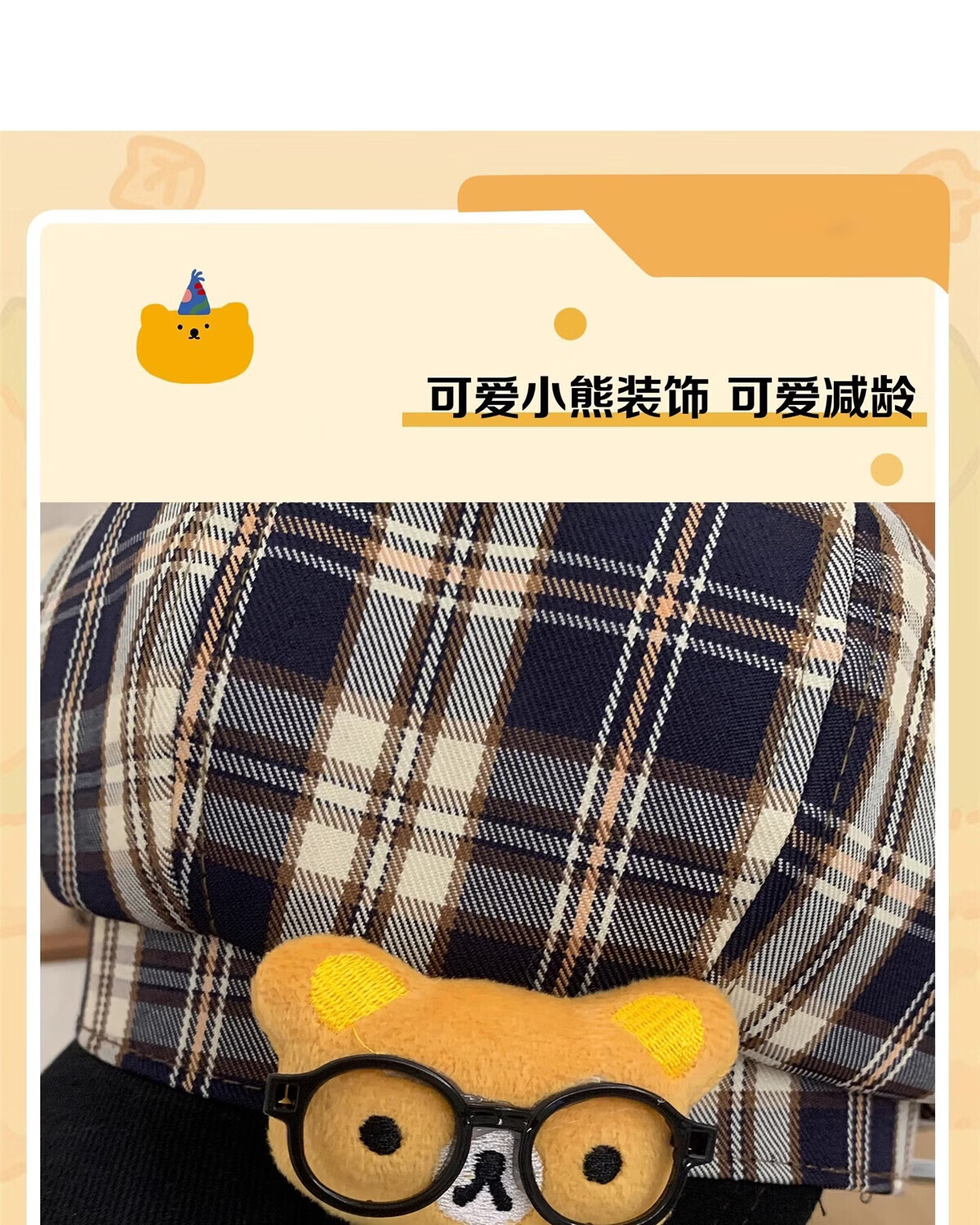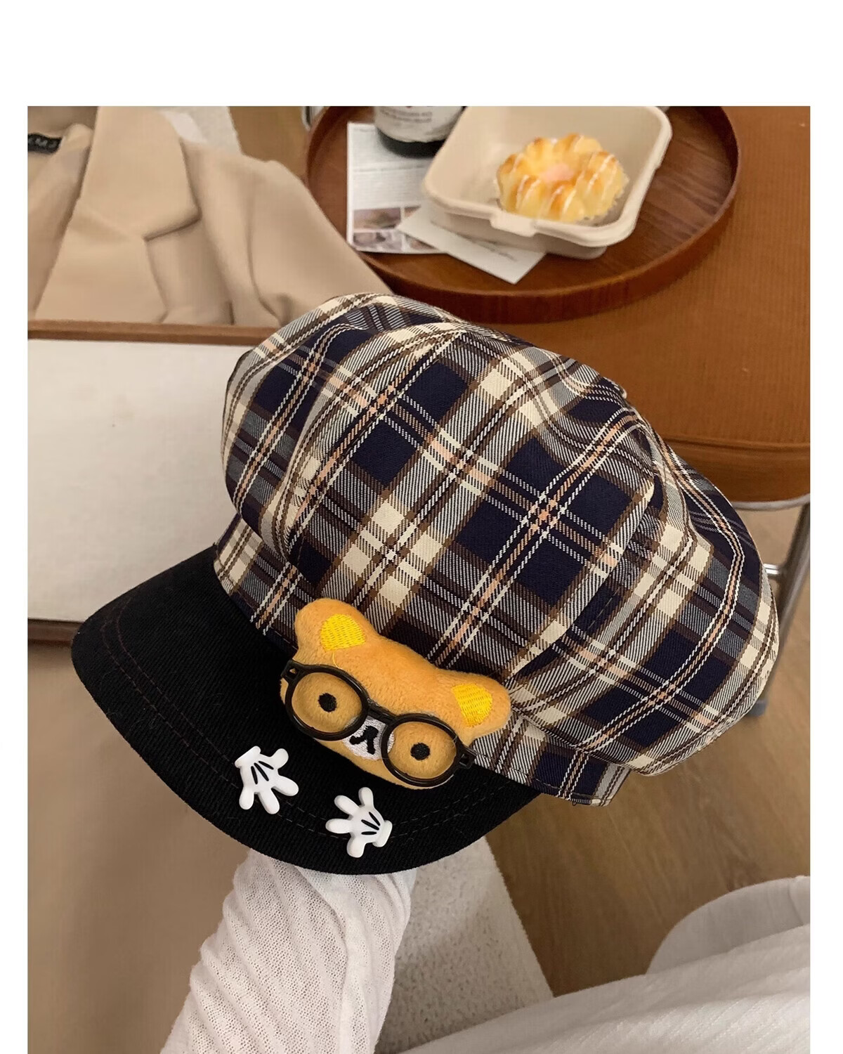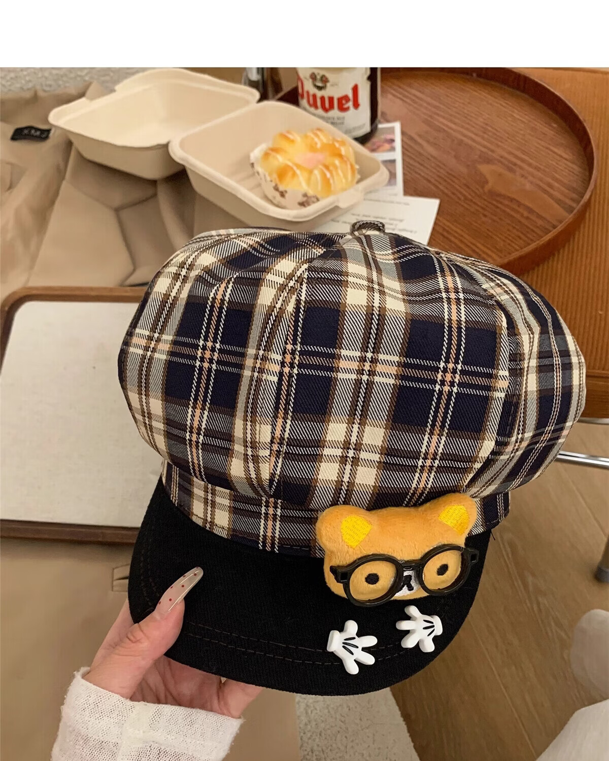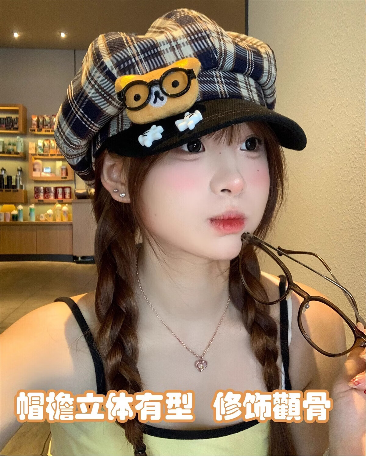 JIOESC Hat Women's Autumn and Winter Fashionable Fashionable Cartoon Glasses Octagonal Hat Beret Peaked Hat Women Black Plaid One Size