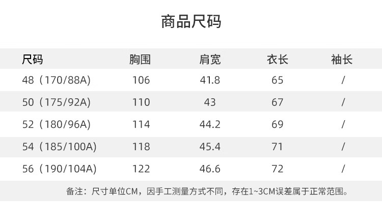 China (cm) 165 / 88-90 170 / 96-98 175 / 108-110 180 / 118-122 185 / 126-130