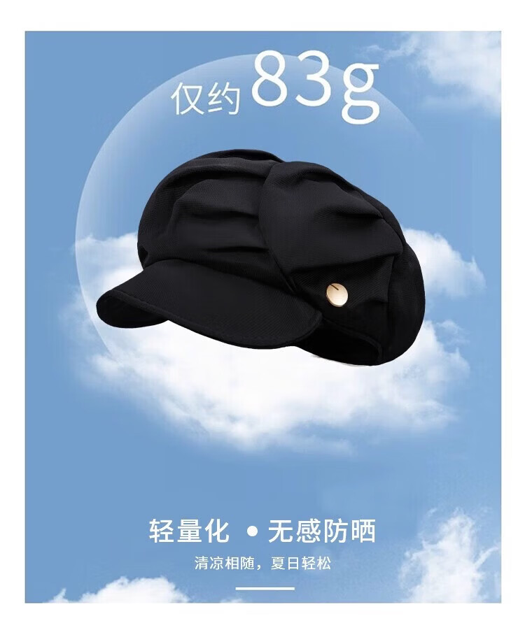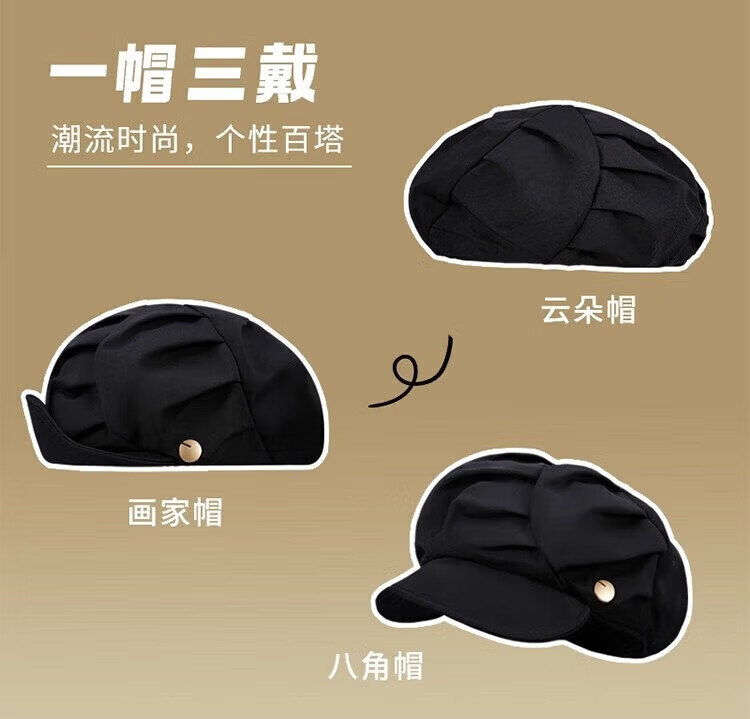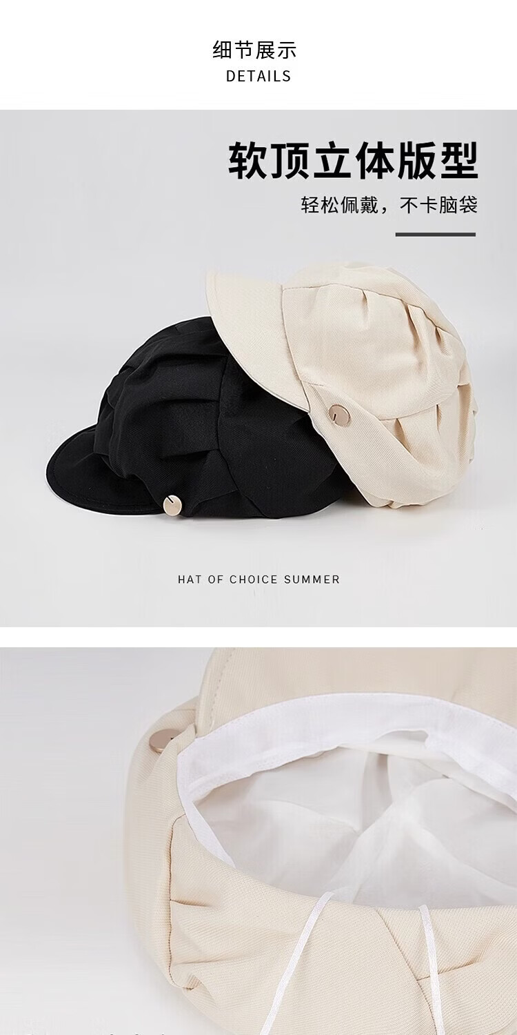 JIOESC beret hat women's autumn and winter sun visor octagonal hat versatile new big head circumference showing face small Korean version pleated beret black one size