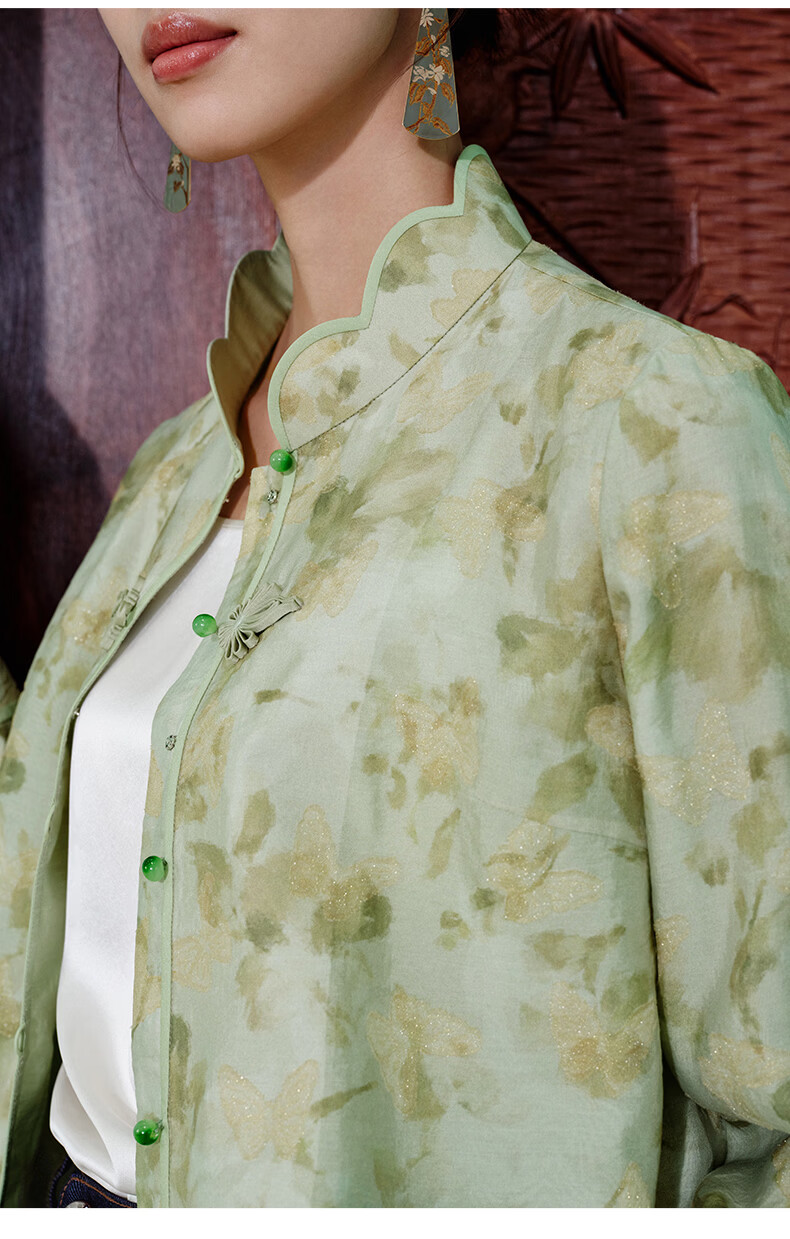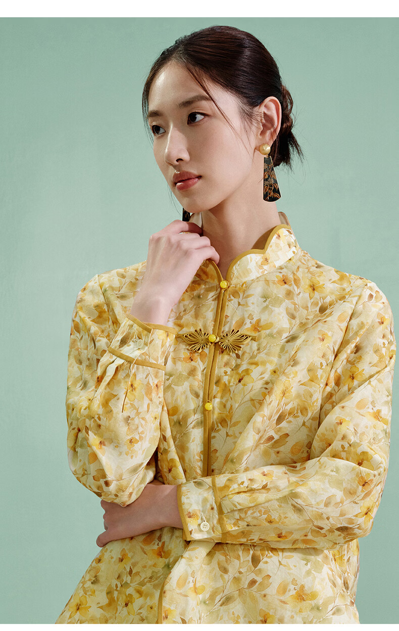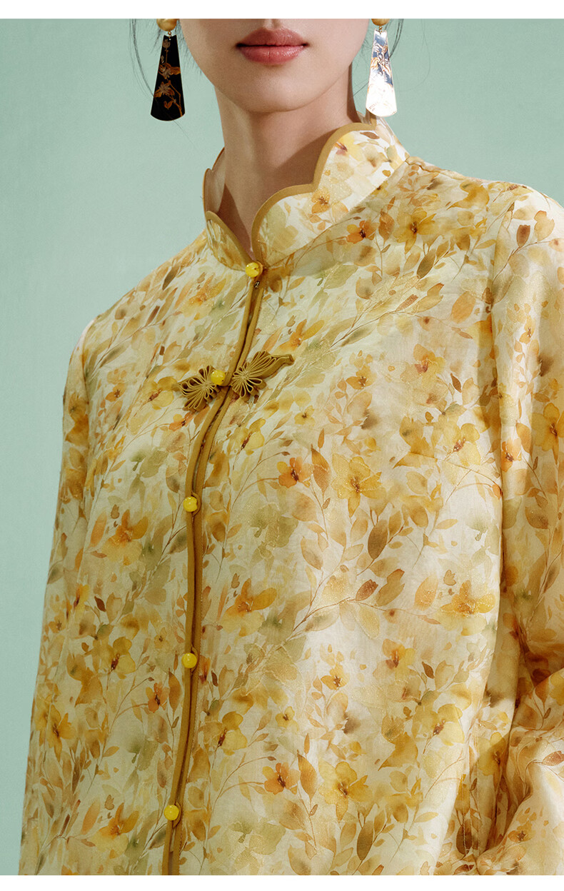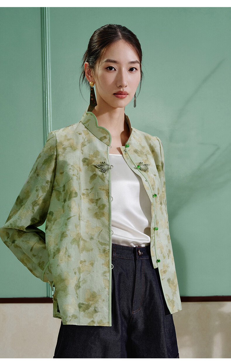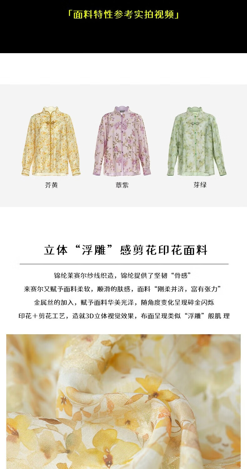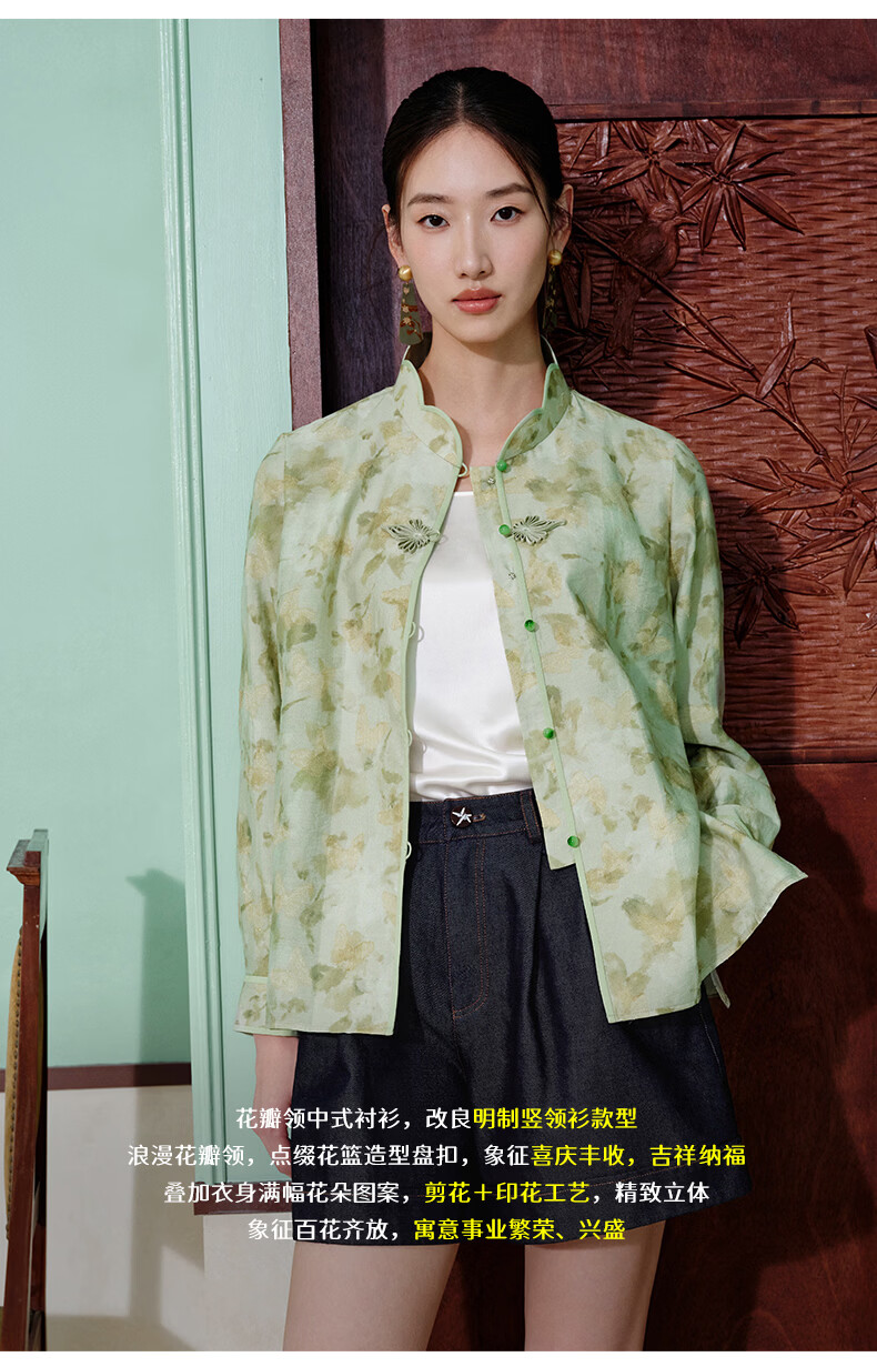 Floral deep plate button new Chinese style shirt for women 2026 new national style lyocell top petal collar printed shirt bud green S