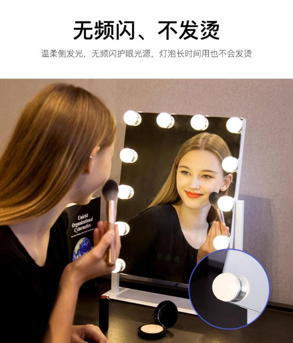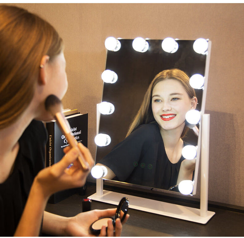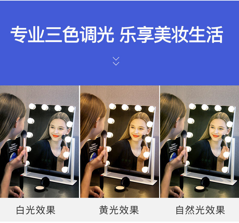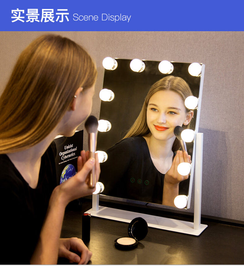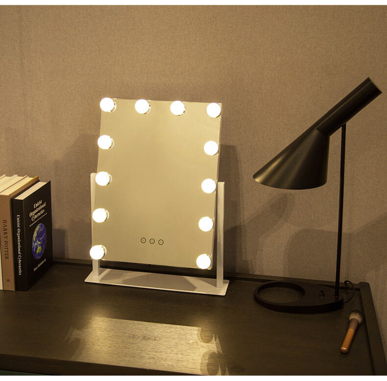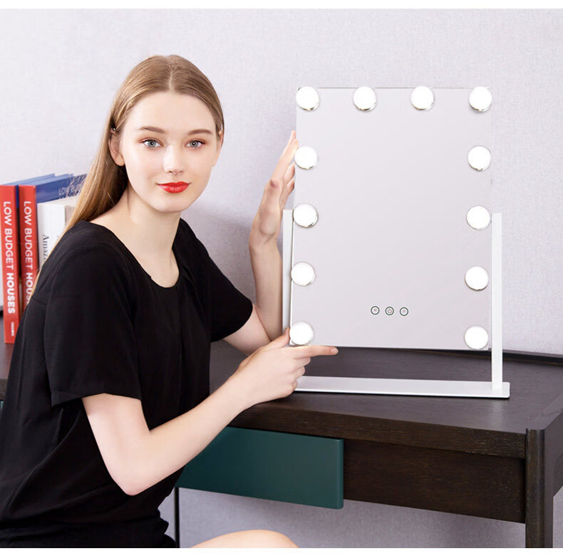 Mirror insled make-up mirror with light bulb mirror girls dormitory desktop large intelligent supplementary light desktop 9 light bulbs three-color light + stepless dimming (cool black plug-in model)