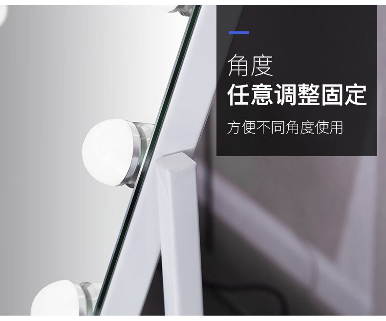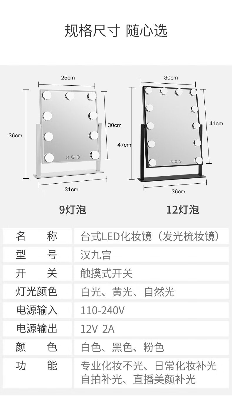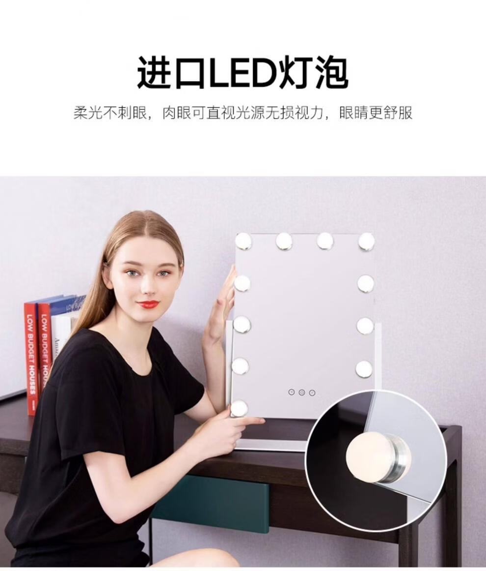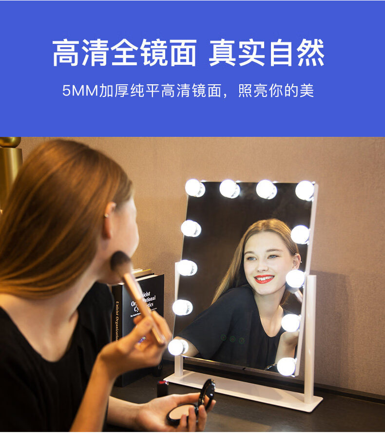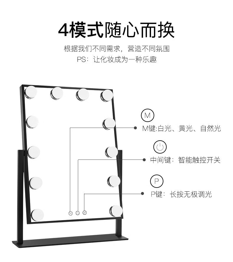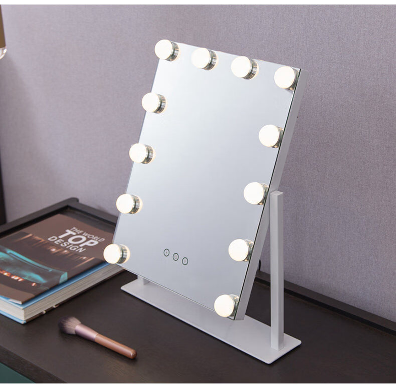 Mirror insled make-up mirror with light bulb mirror girls dormitory desktop large intelligent supplementary light desktop 9 light bulbs three-color light + stepless dimming (cool black plug-in model)