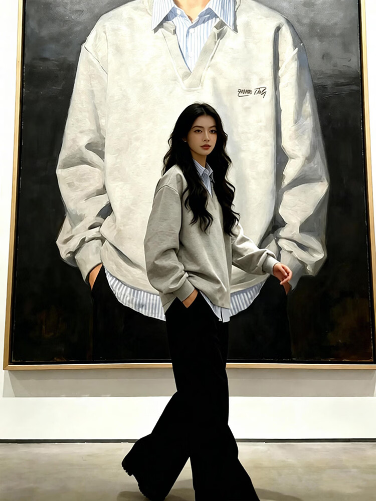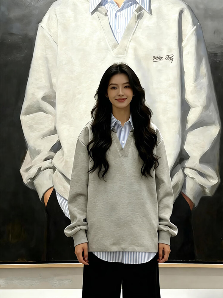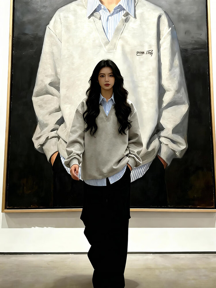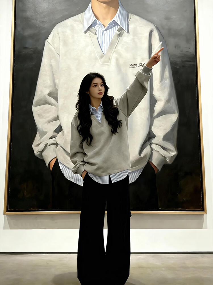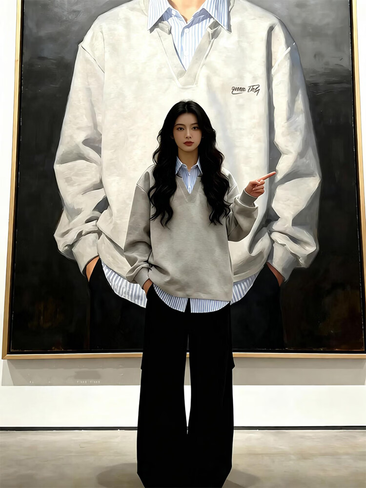Qumile fake two-piece plaid patchwork sweatshirt for men in spring, loose, trendy, right-shoulder, long-sleeved T-shirt, American-style inner layering top, gray-striped XL