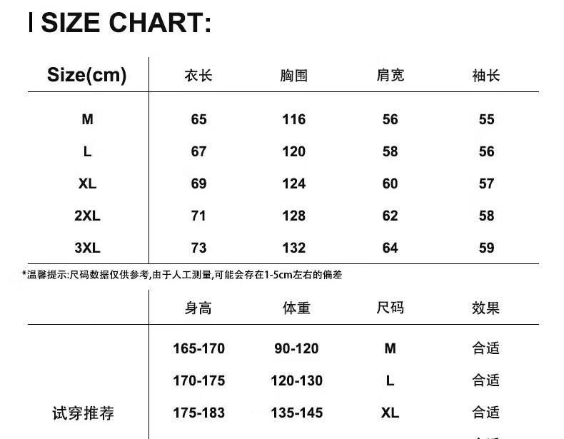 China (cm) 165 / 88-90 170 / 96-98 175 / 108-110 180 / 118-122 185 / 126-130