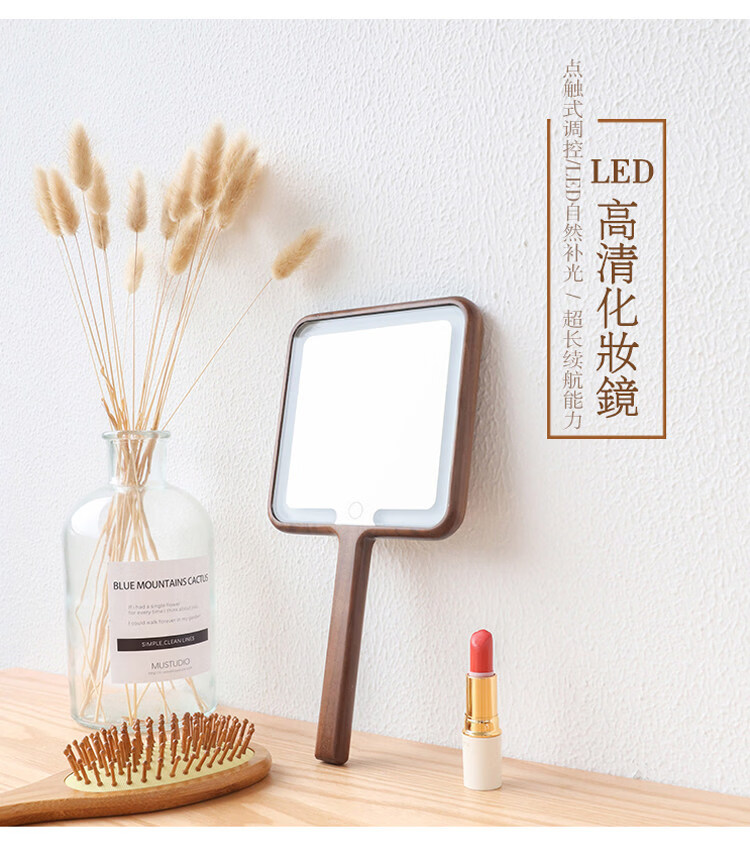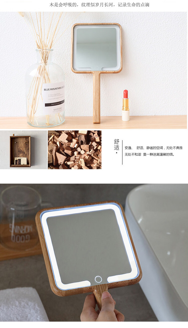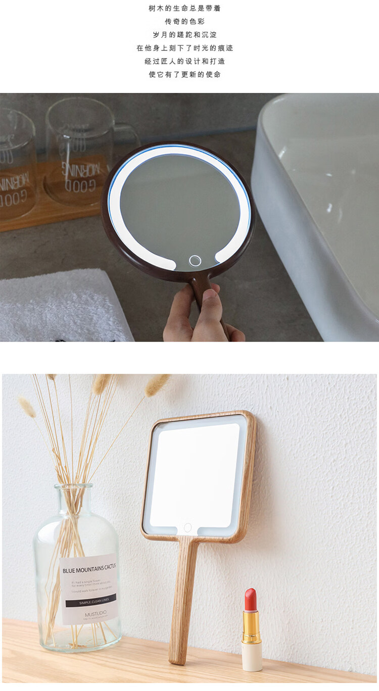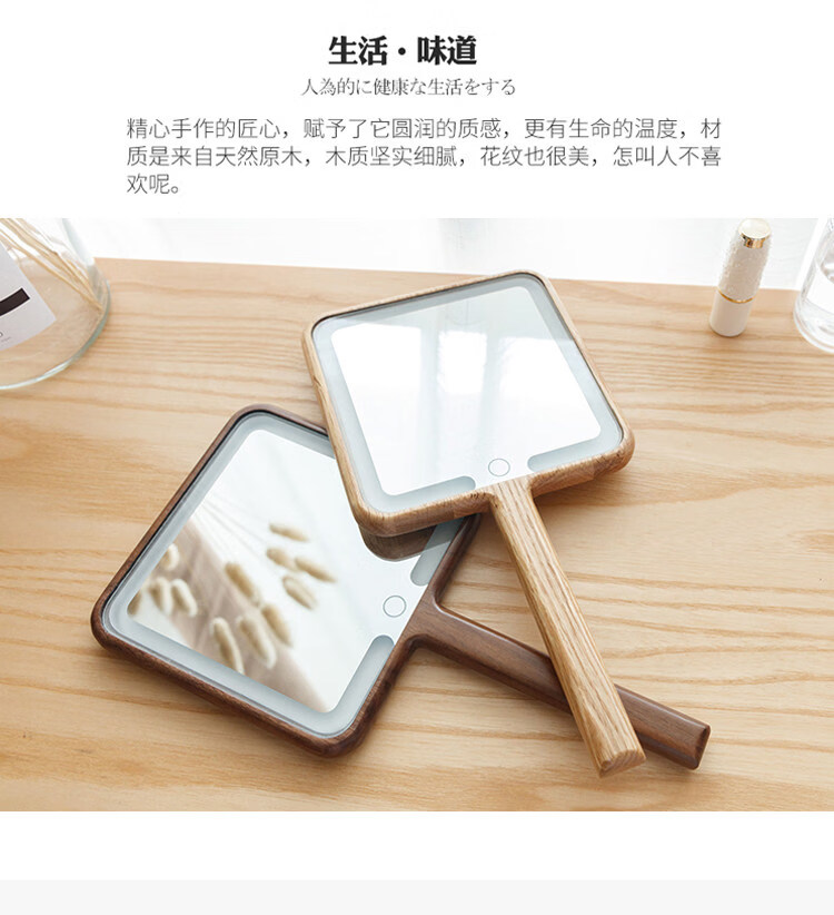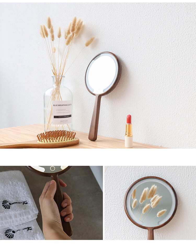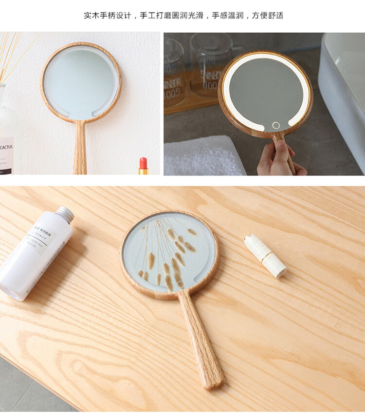 Espejo de maquillaje con mango LED de madera maciza, carga con vestidor portátil ligero y espejo de belleza, logotipo personalizado con letras de roble redondo
