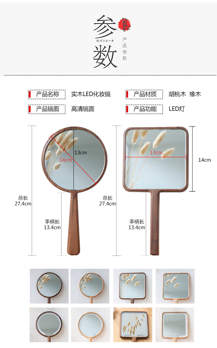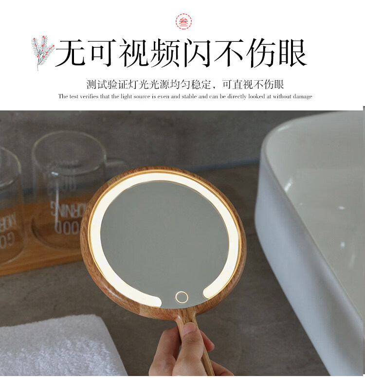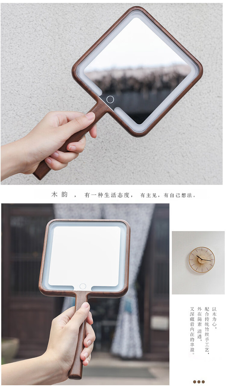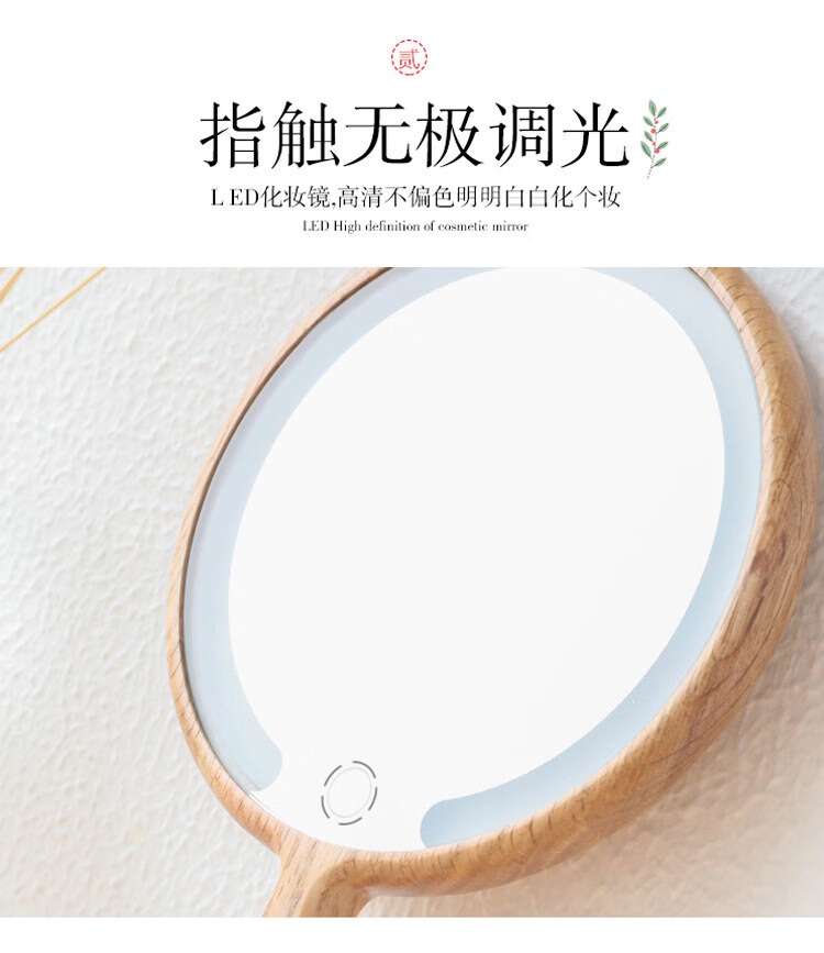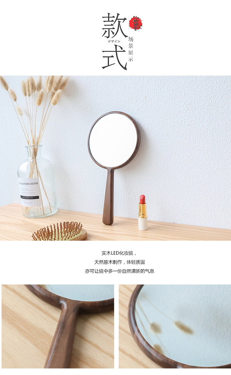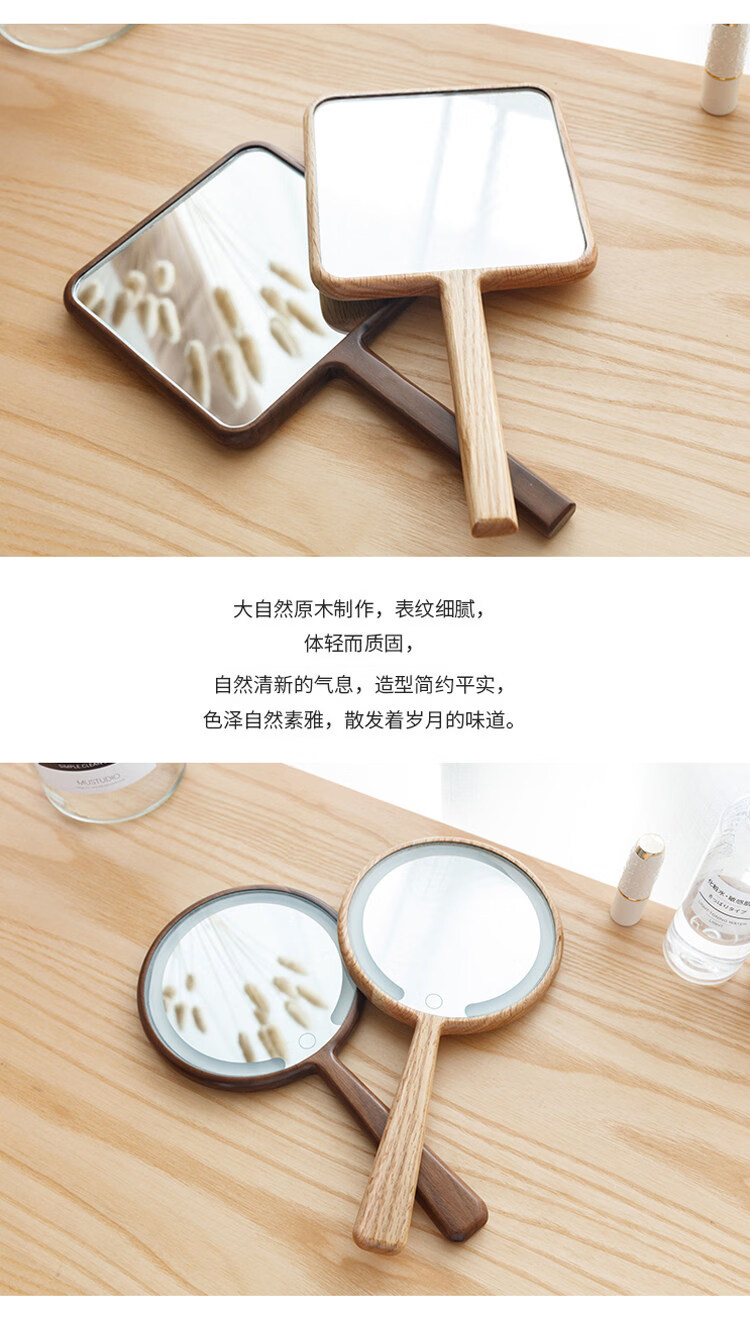 Espejo de maquillaje con mango LED de madera maciza, carga con vestidor portátil ligero y espejo de belleza, logotipo personalizado con letras de roble redondo