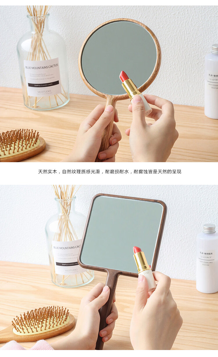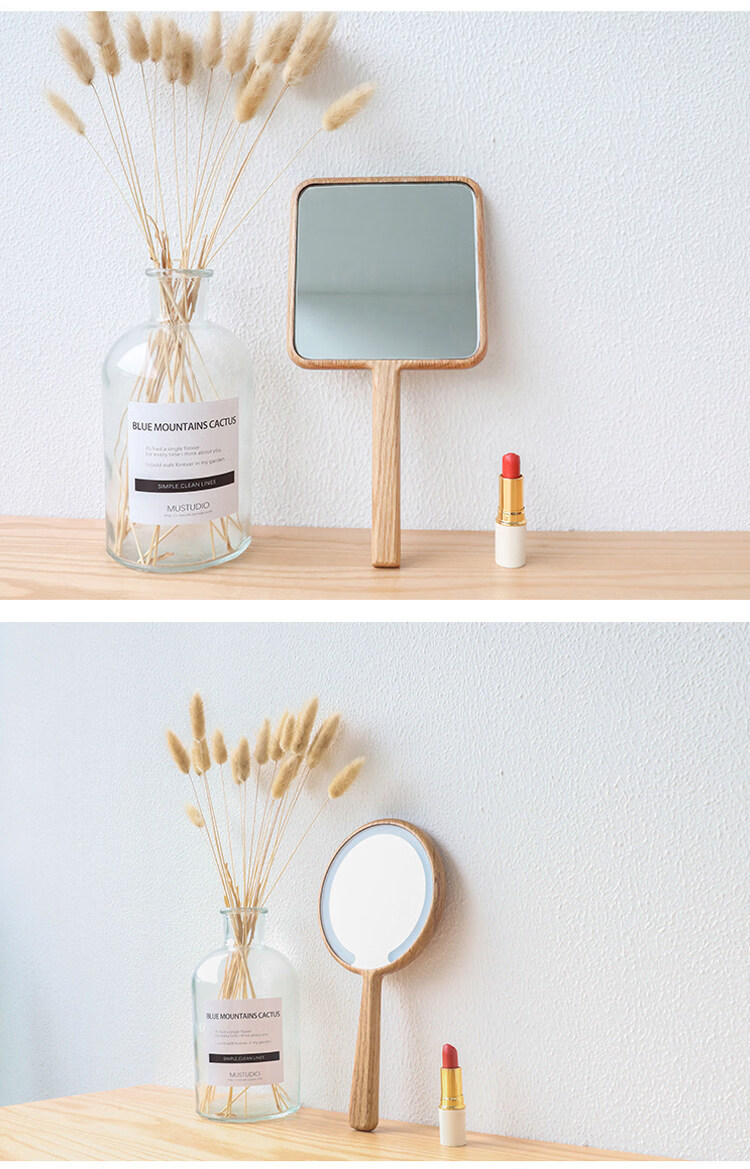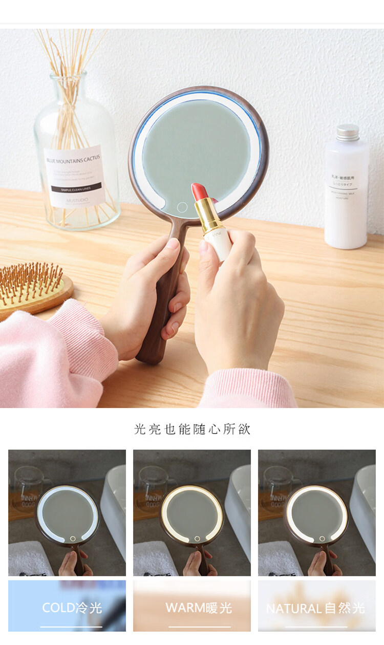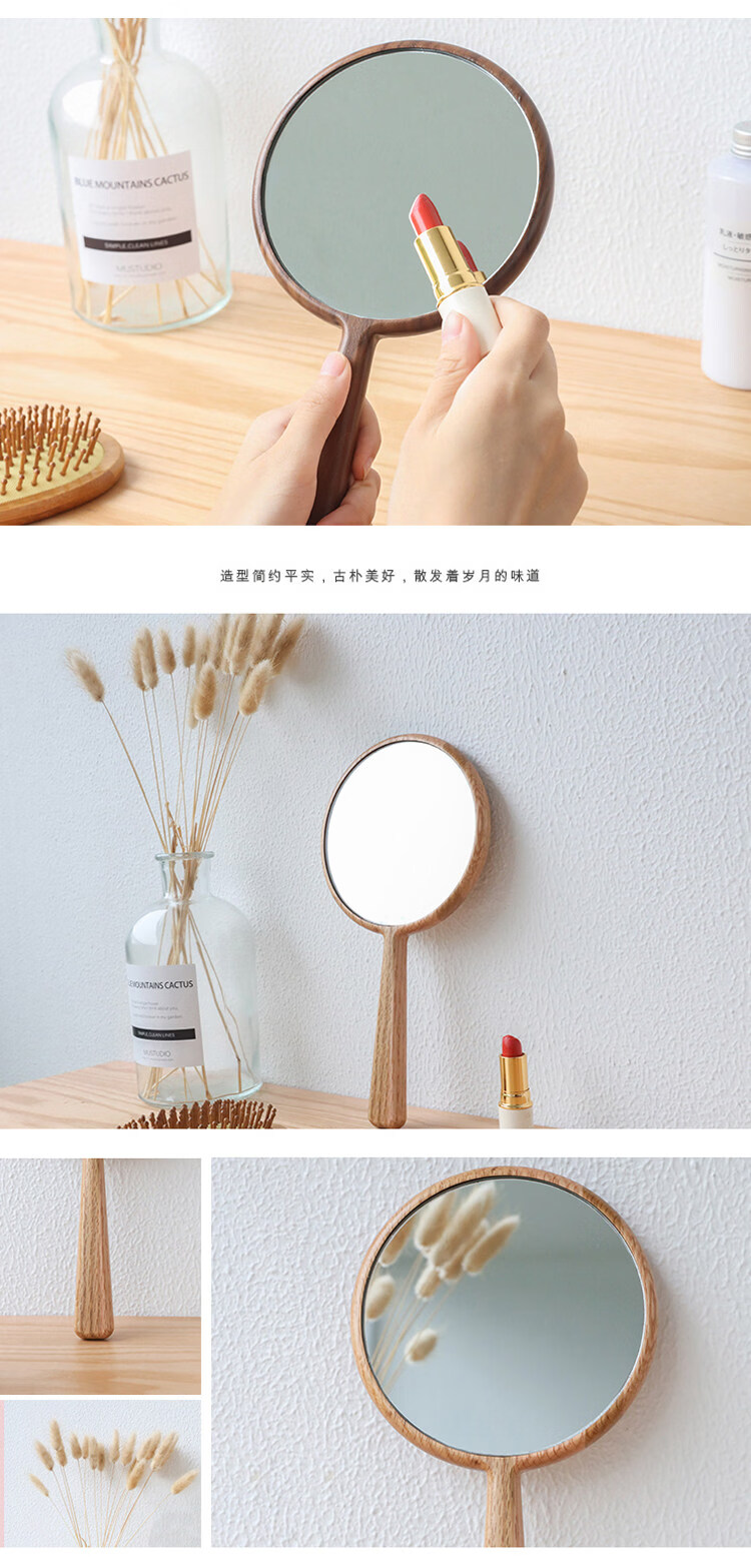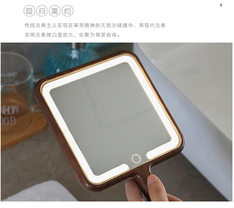 Espejo de maquillaje con mango LED de madera maciza, carga con vestidor portátil ligero y espejo de belleza, logotipo personalizado con letras de roble redondo