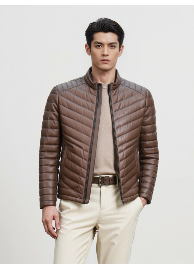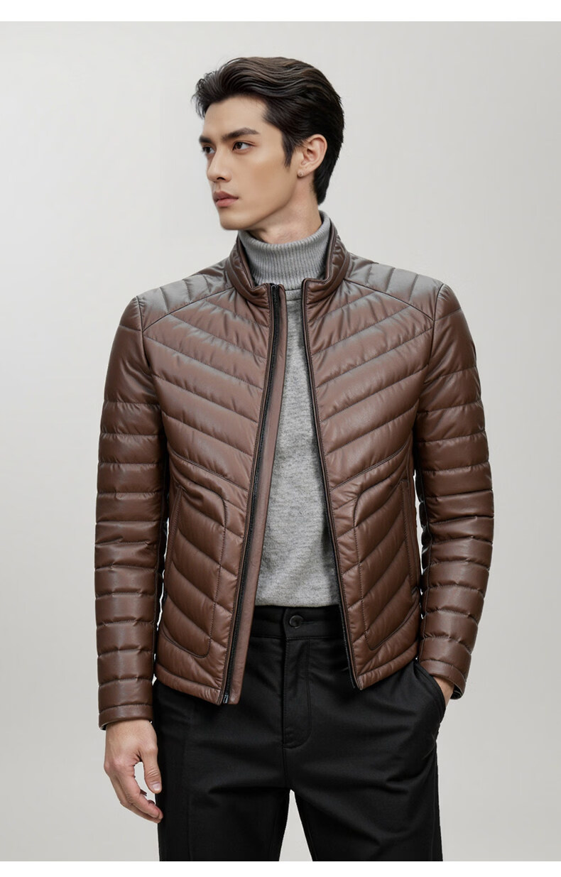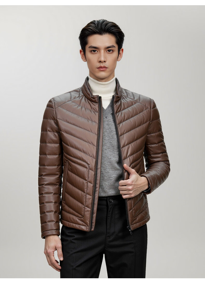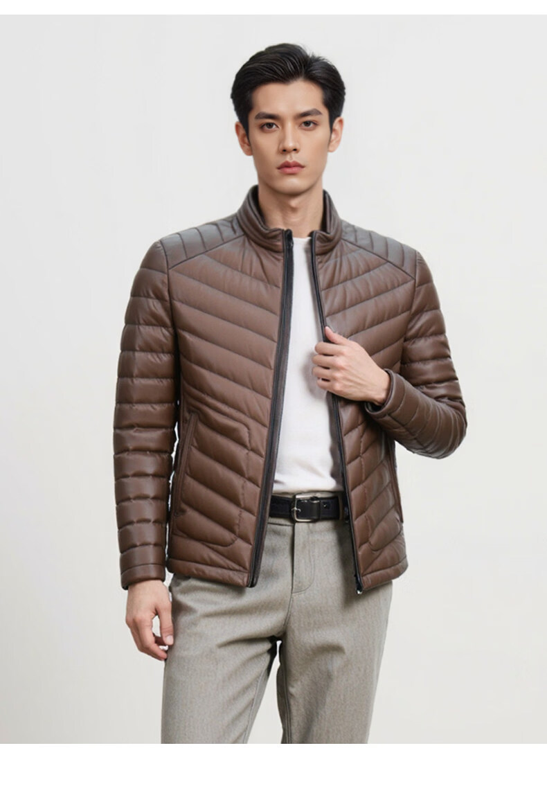 Snow Leopard Genuine Leather Jacket Men's First Layer Sheepskin Business Casual System Stand Collar White Duck Down Short Leather Down Jacket Brown L 48 170/92A