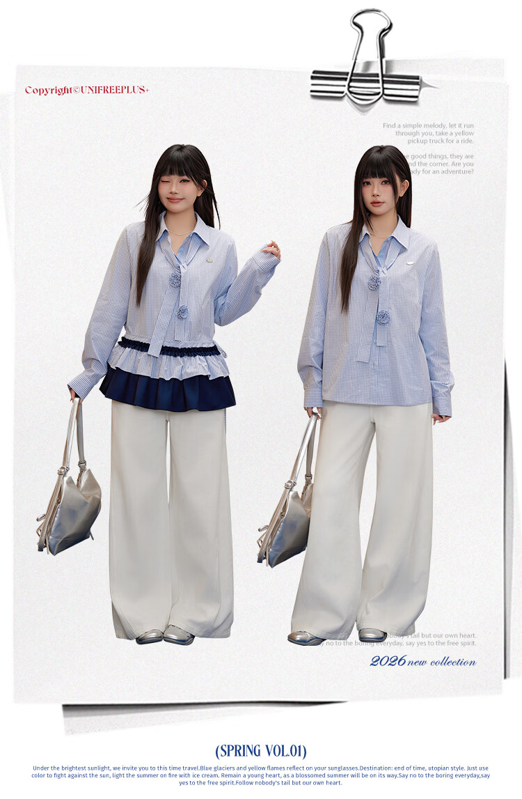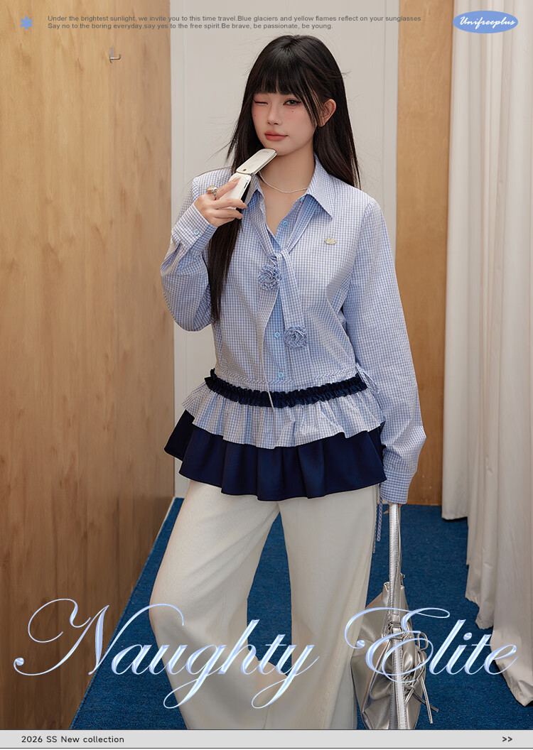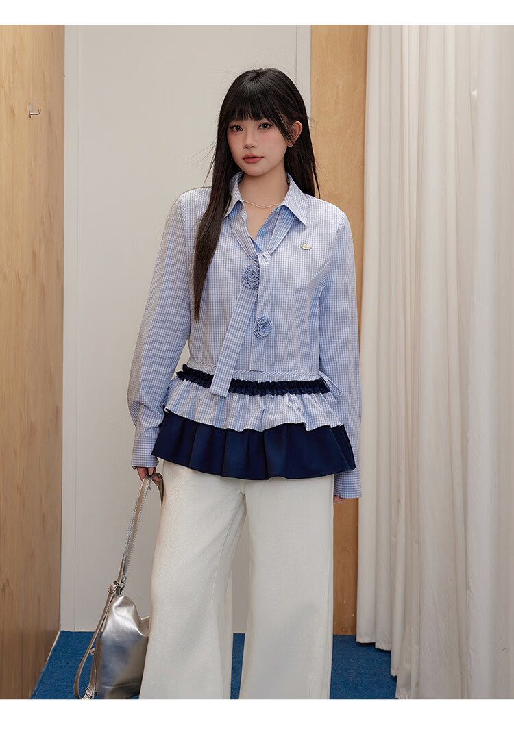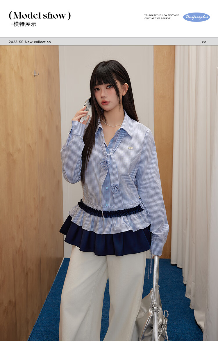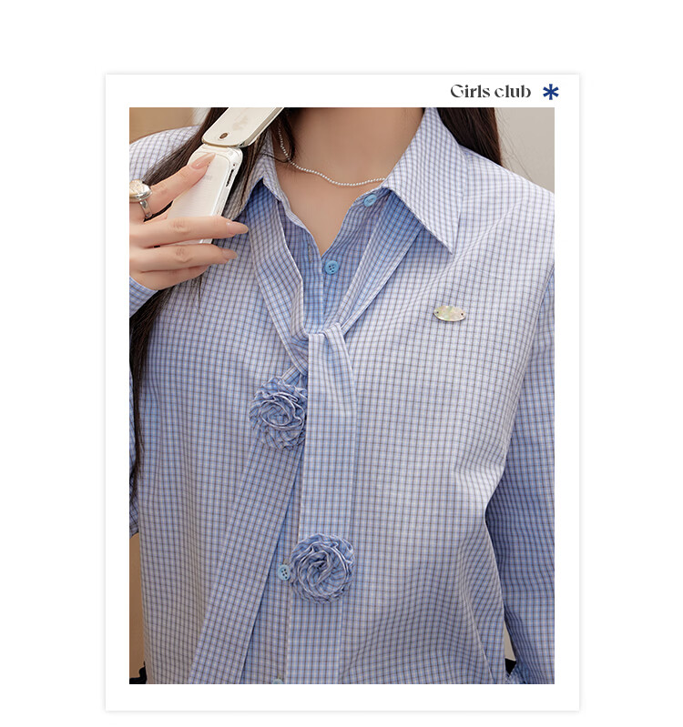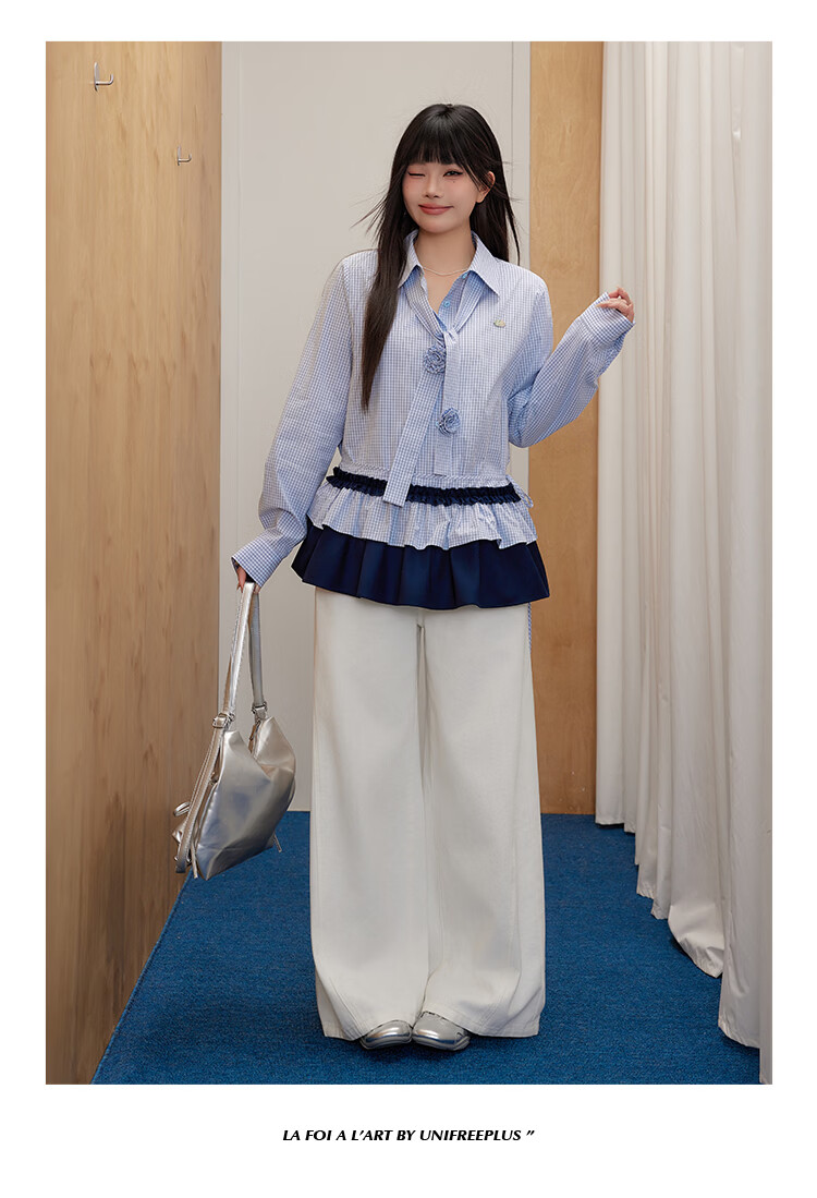 UNIFREEPLUS+ Clear Sea Salt Blue Slim Plaid Shirt Large Size Long Sleeve Shirt Front Shoulder Top Blue S