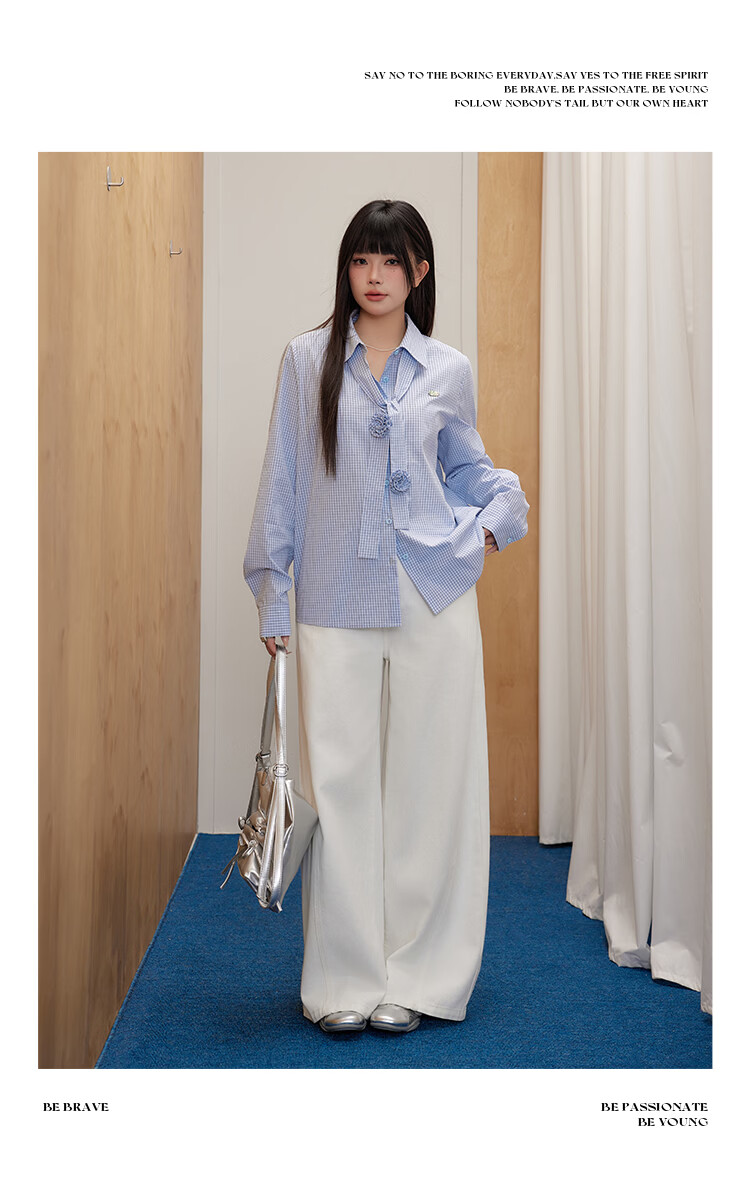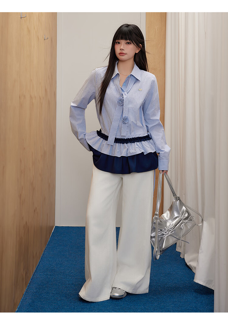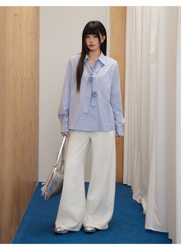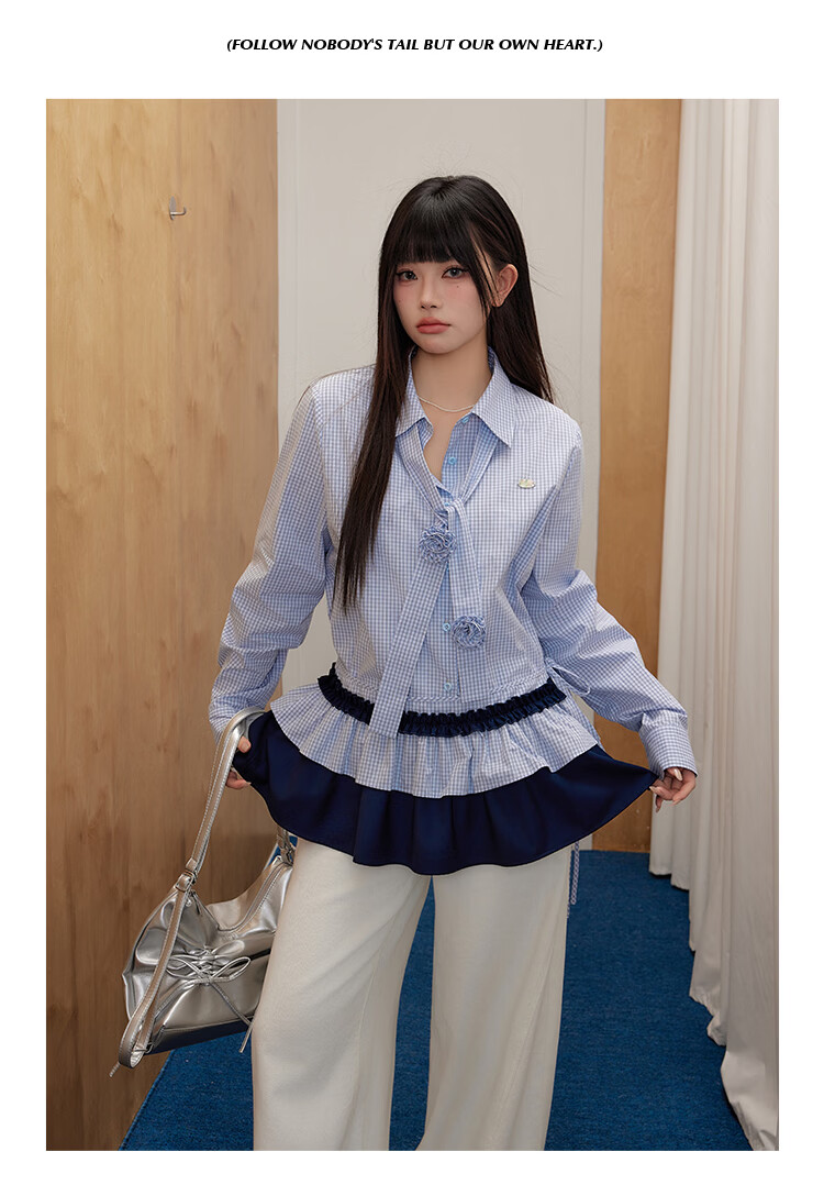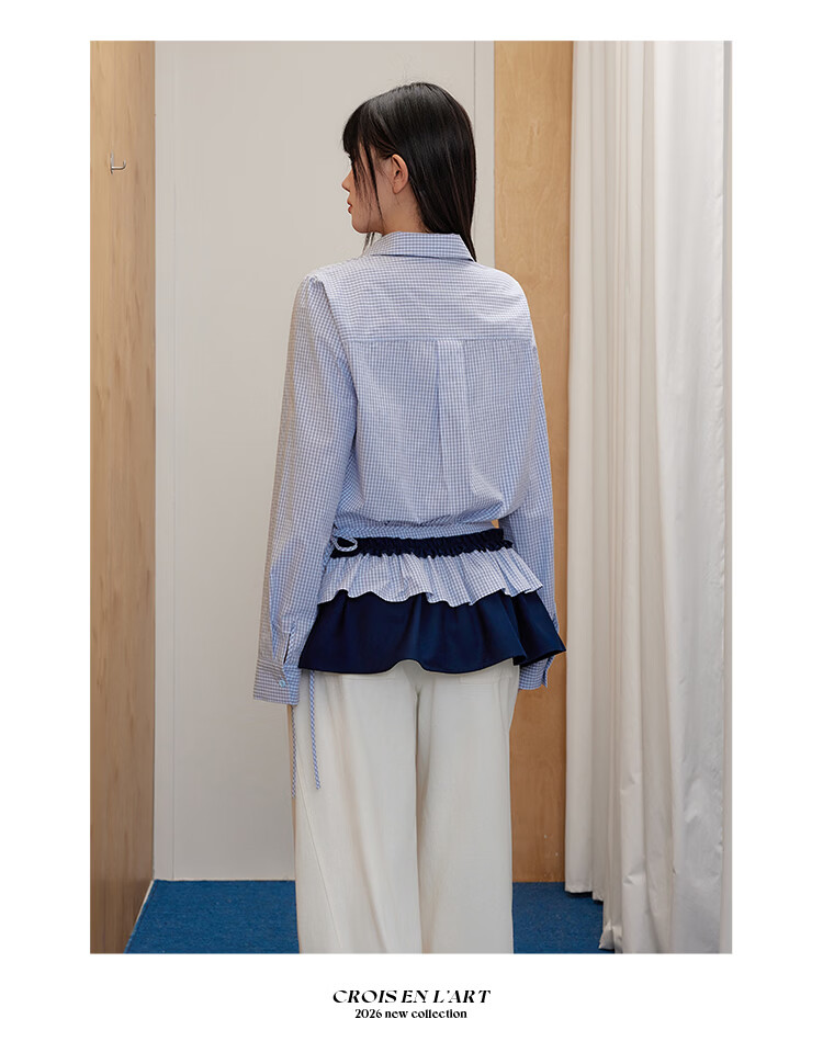 UNIFREEPLUS+ Clear Sea Salt Blue Slim Plaid Shirt Large Size Long Sleeve Shirt Front Shoulder Top Blue S