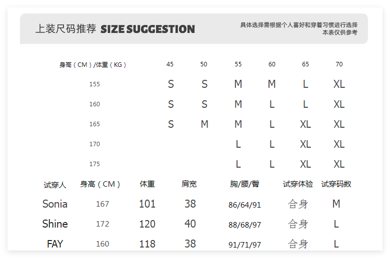 China (cm) 160-165/84-86 165-170 / 88-90 167-172 / 92-96 168-173 / 98-102 170-176 / 106-110