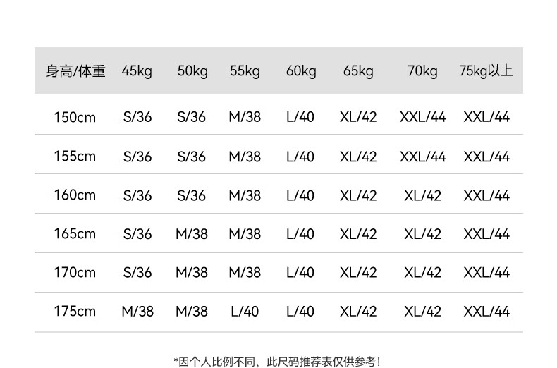 China (cm) 160-165/84-86 165-170 / 88-90 167-172 / 92-96 168-173 / 98-102 170-176 / 106-110