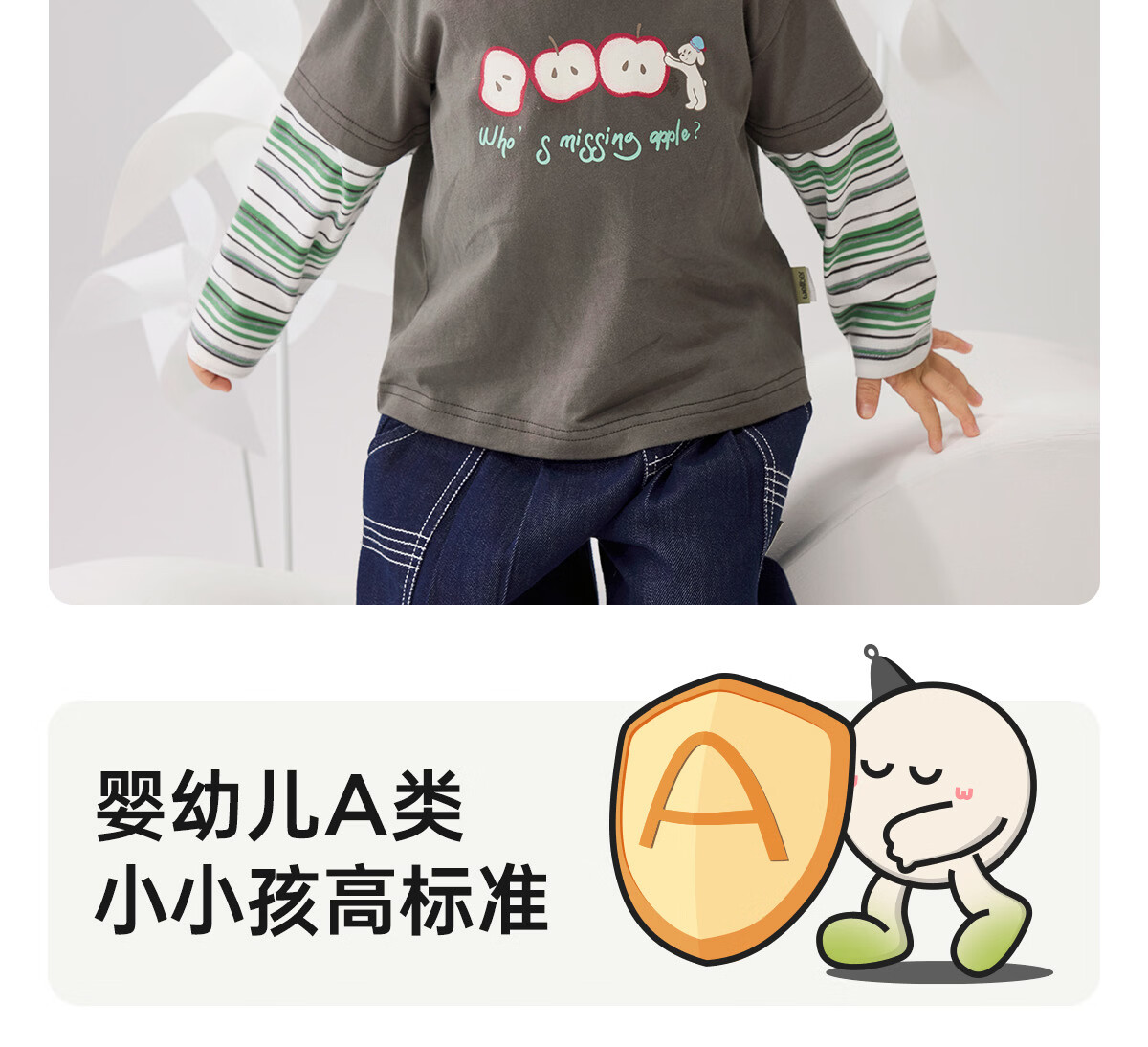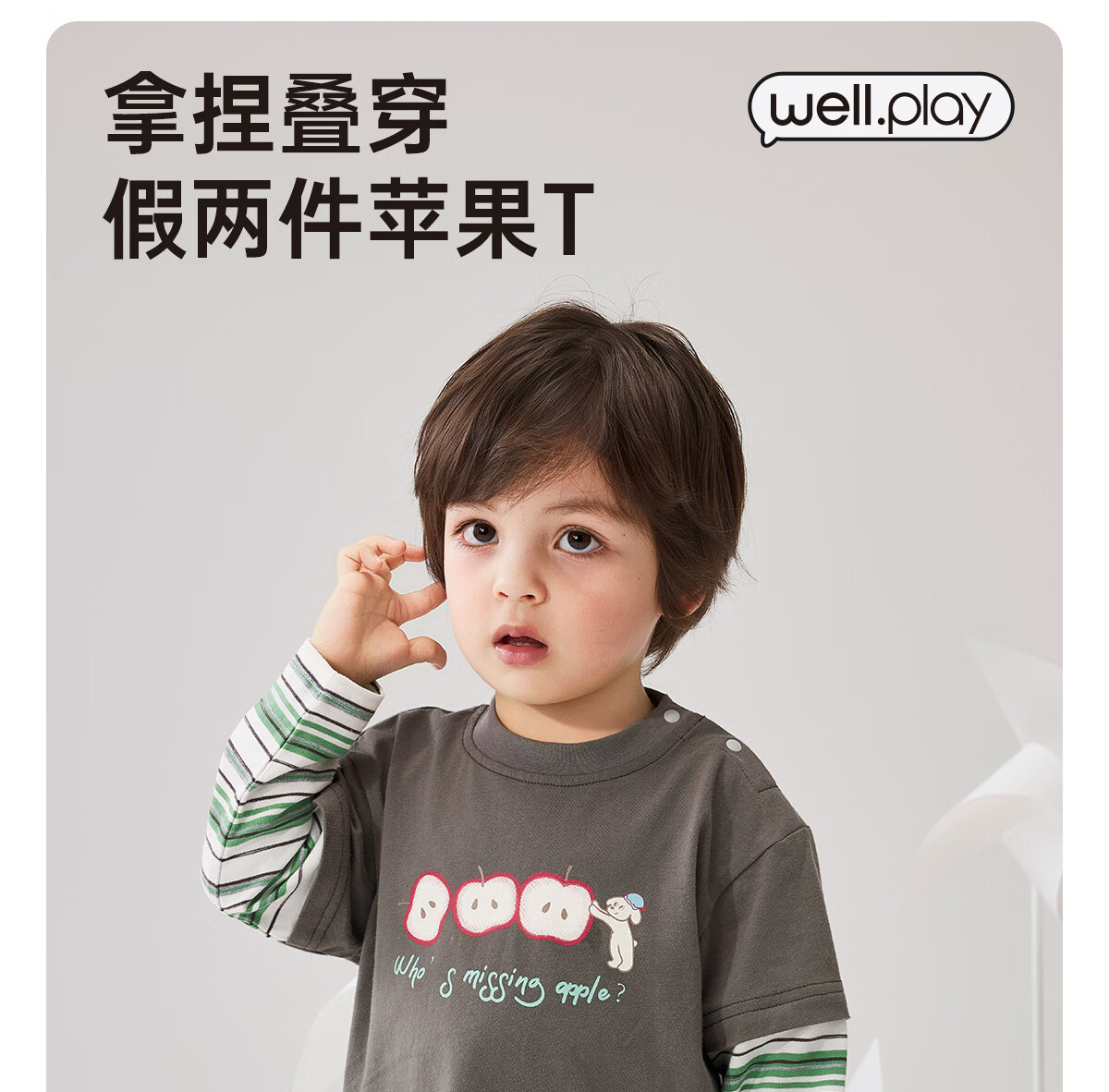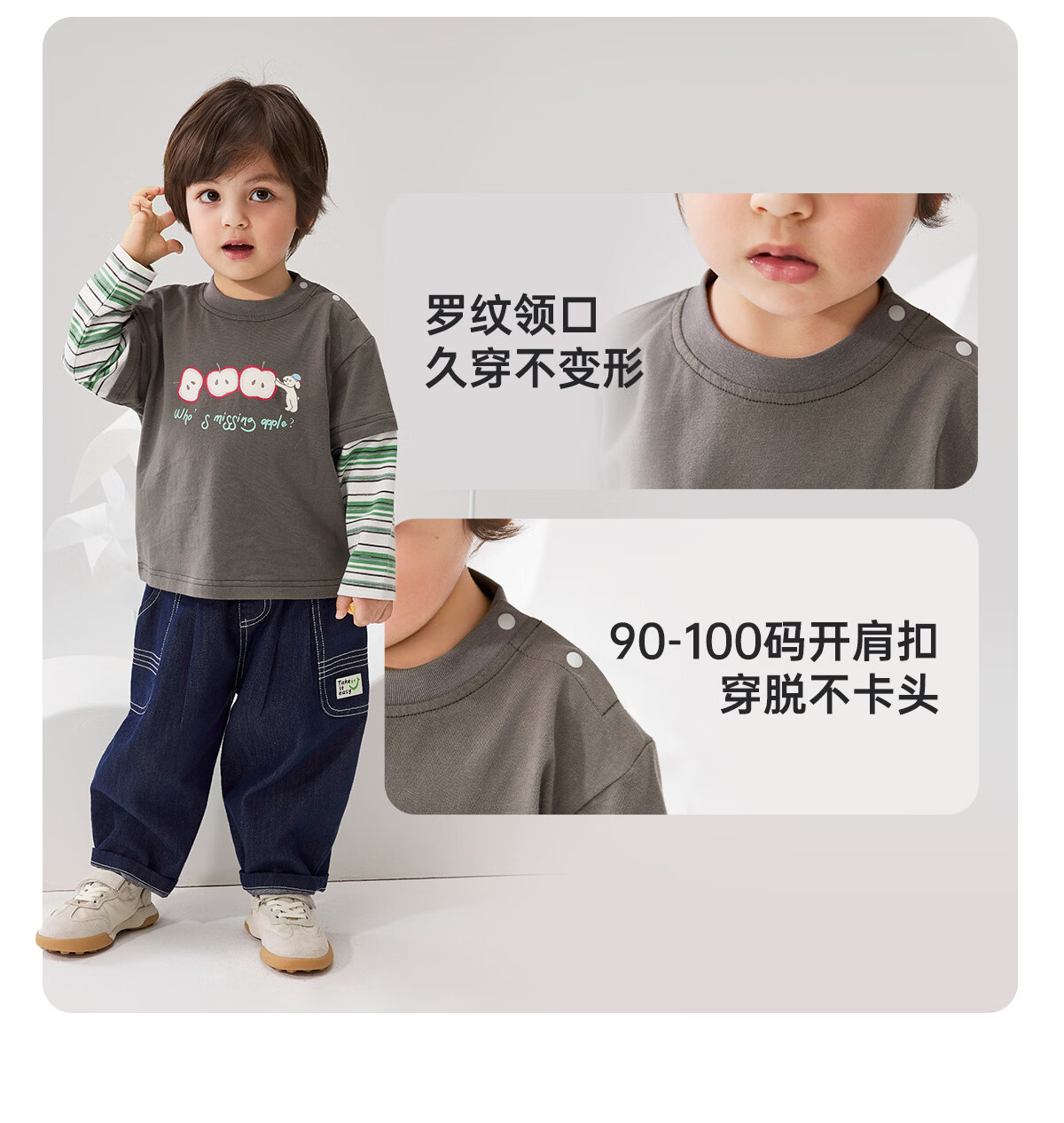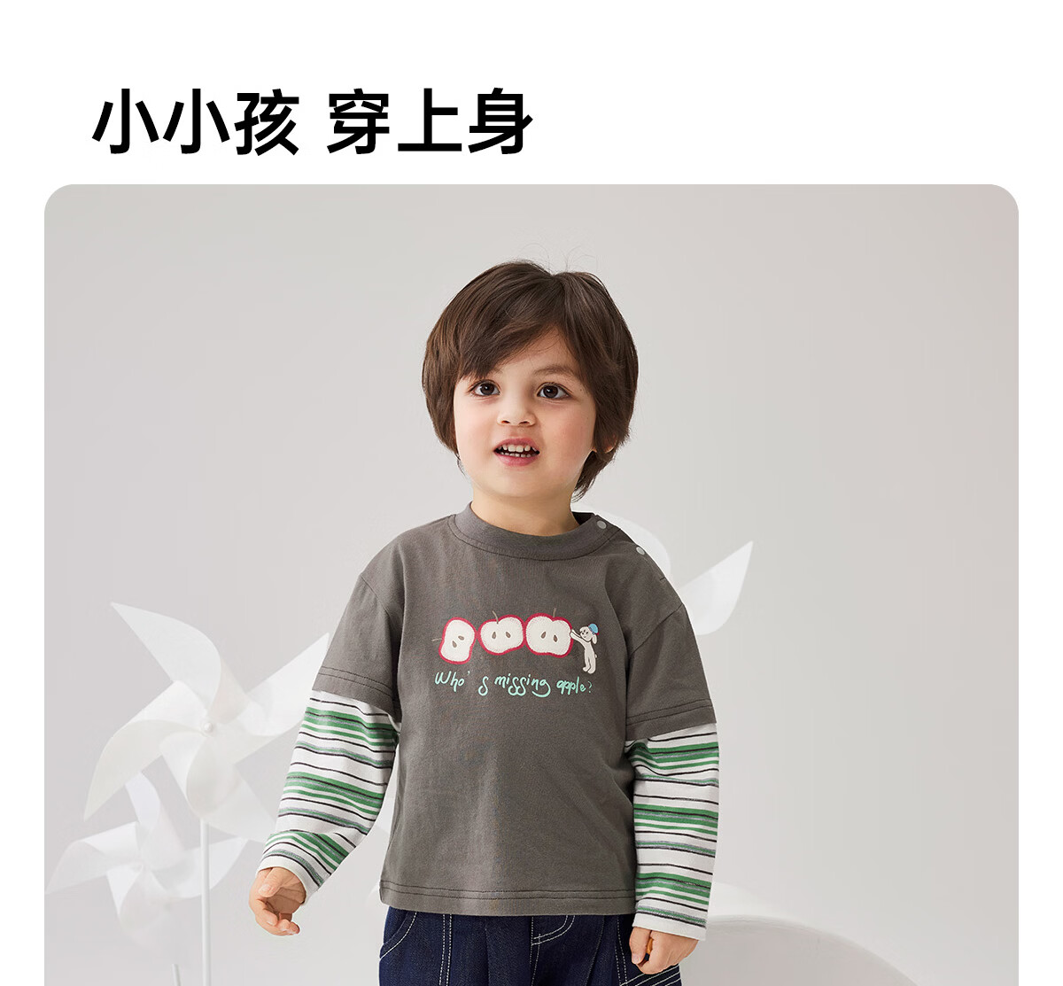 WELLBER children's T-shirt baby striped fake two-piece long-sleeved top for children and middle-aged children pure cotton versatile dark gray 110