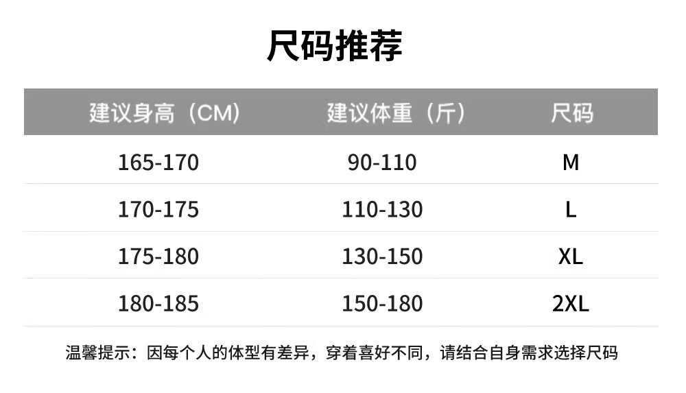 China (cm) 165 / 88-90 170 / 96-98 175 / 108-110 180 / 118-122 185 / 126-130