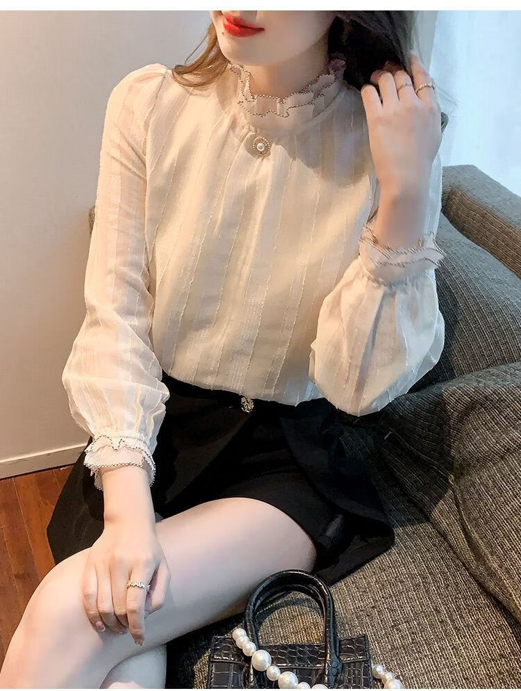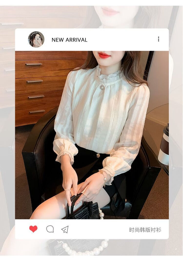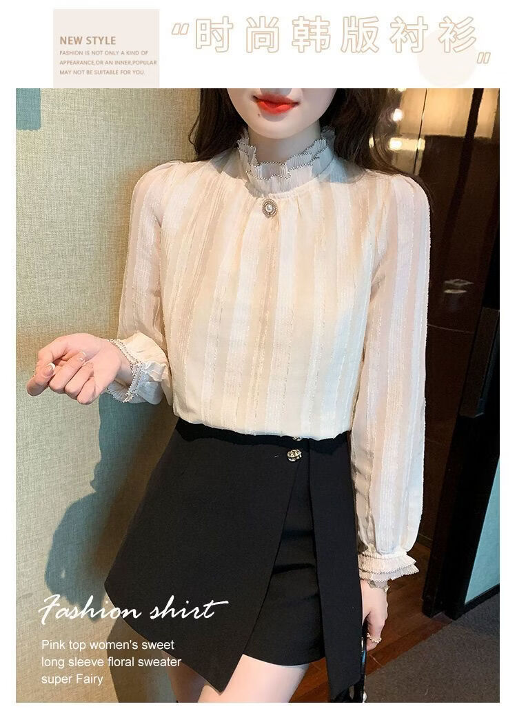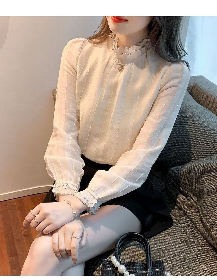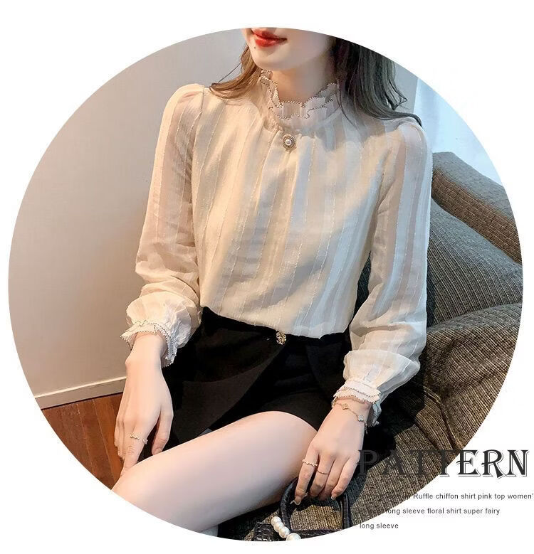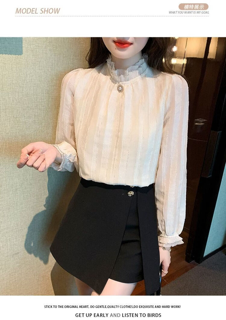 Playboy (PLAYBOY) lace chiffon shirt for women spring new fashion style fungus edge stand-up collar long-sleeved T-shirt temperament versatile outer top thin official flagship apricot color XL recommended 120-135 Jin Jin equals 0.5 kg