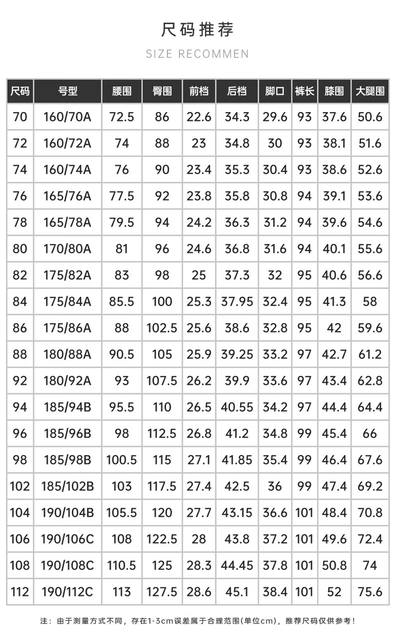 China (cm) 160-165/84-86 165-170 / 88-90 167-172 / 92-96 168-173 / 98-102 170-176 / 106-110