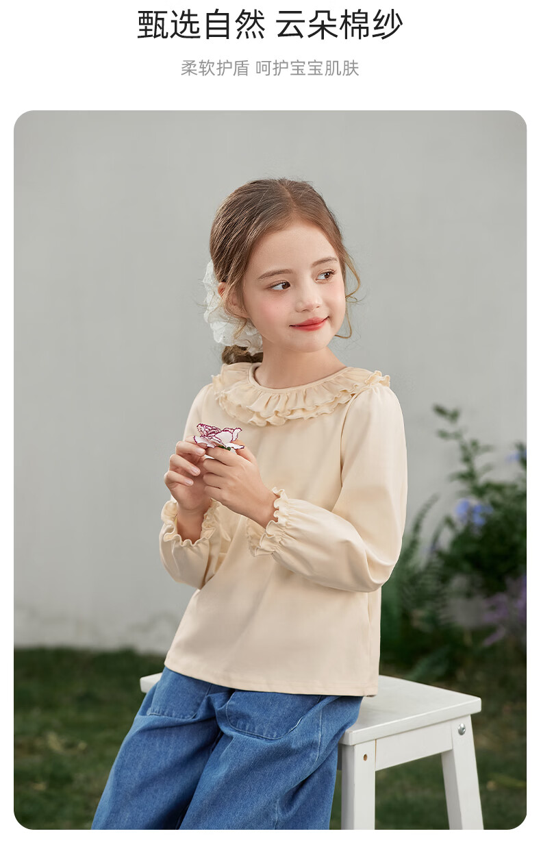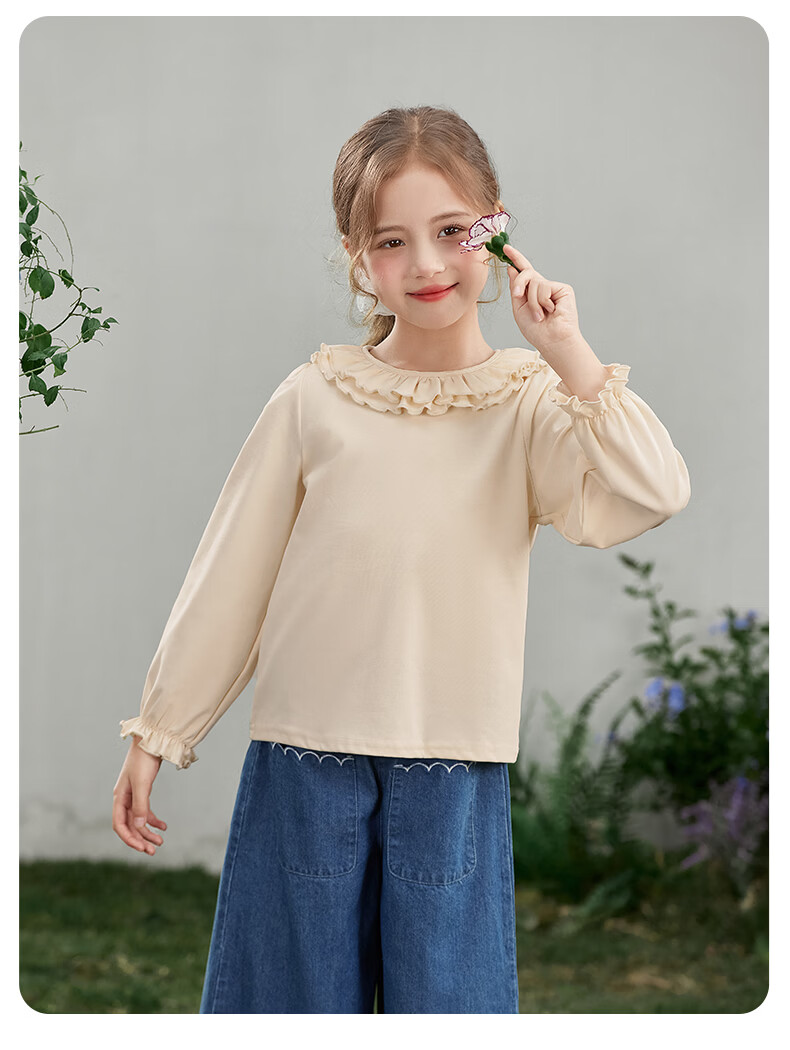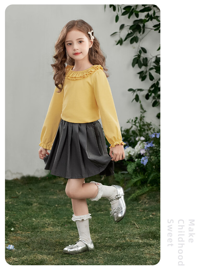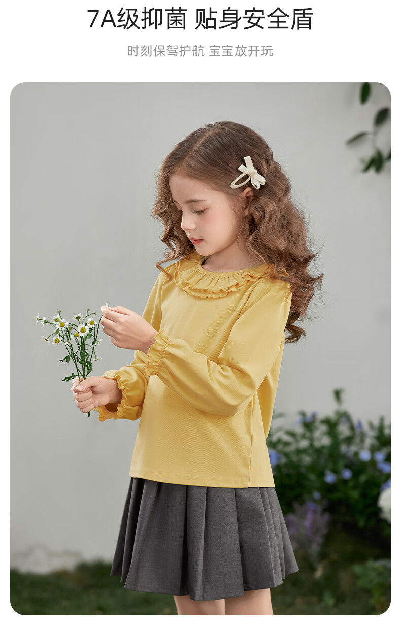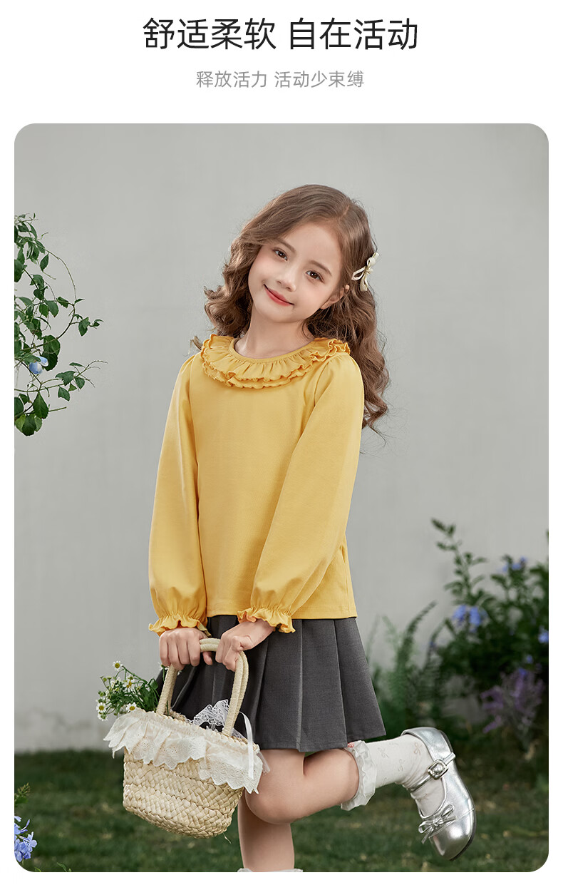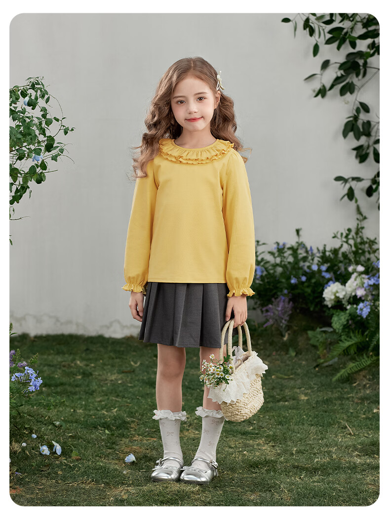 JELLYBABY French solid color lace long-sleeved T-shirt 26 new spring style girls lapel T-shirt antibacterial and soft big children yellow 110