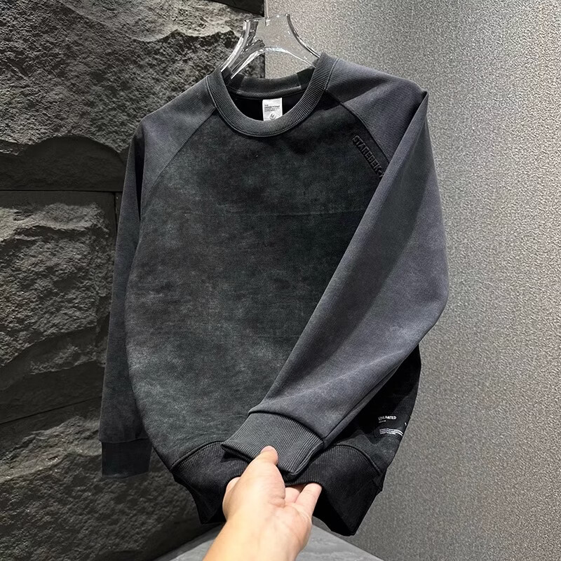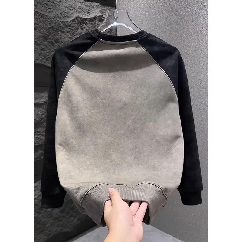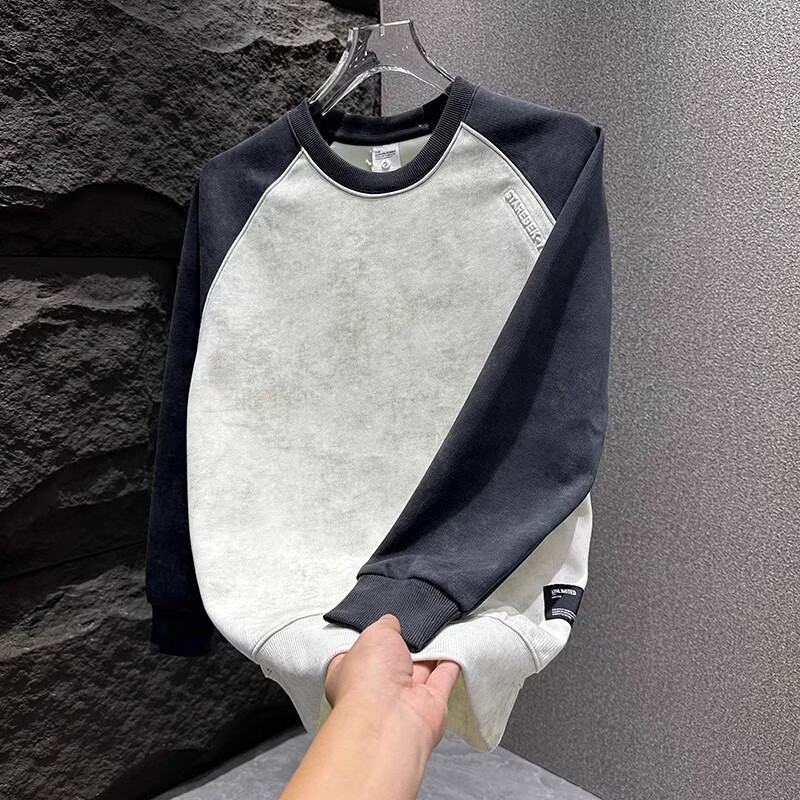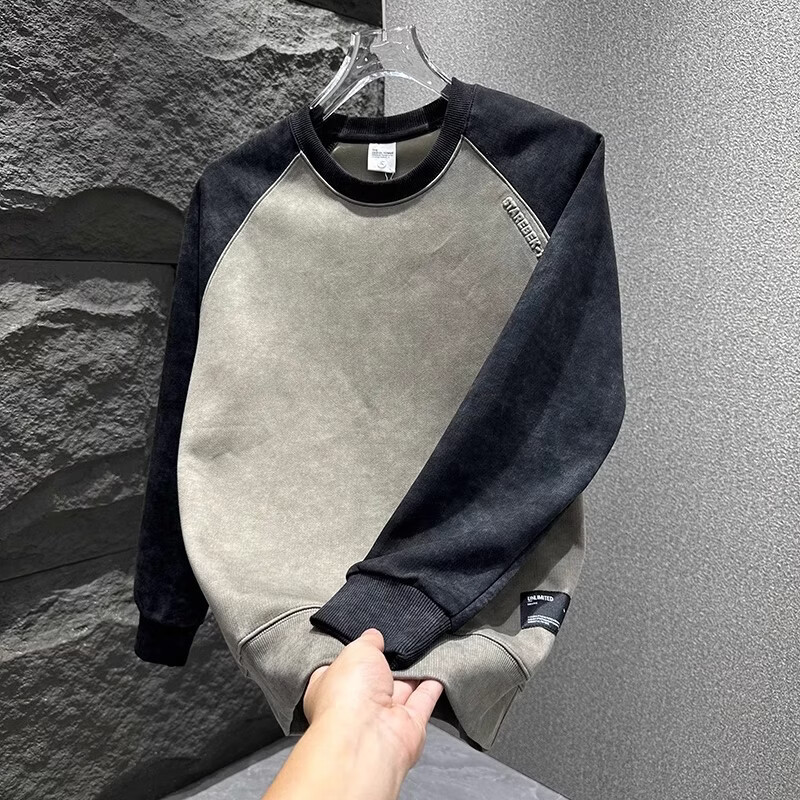 ROMON round neck sweatshirt for men with contrasting color splicing design casual clothes for youth tie-dye simple versatile top mature style black L Recommended weight 120-140Jin Jin is equal to 0.5 kg