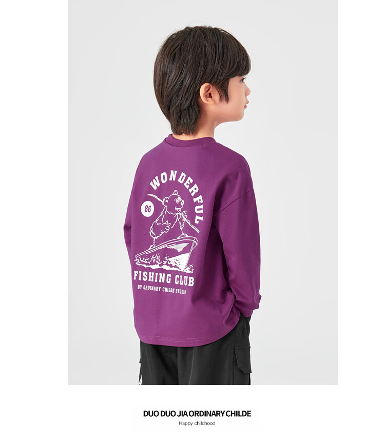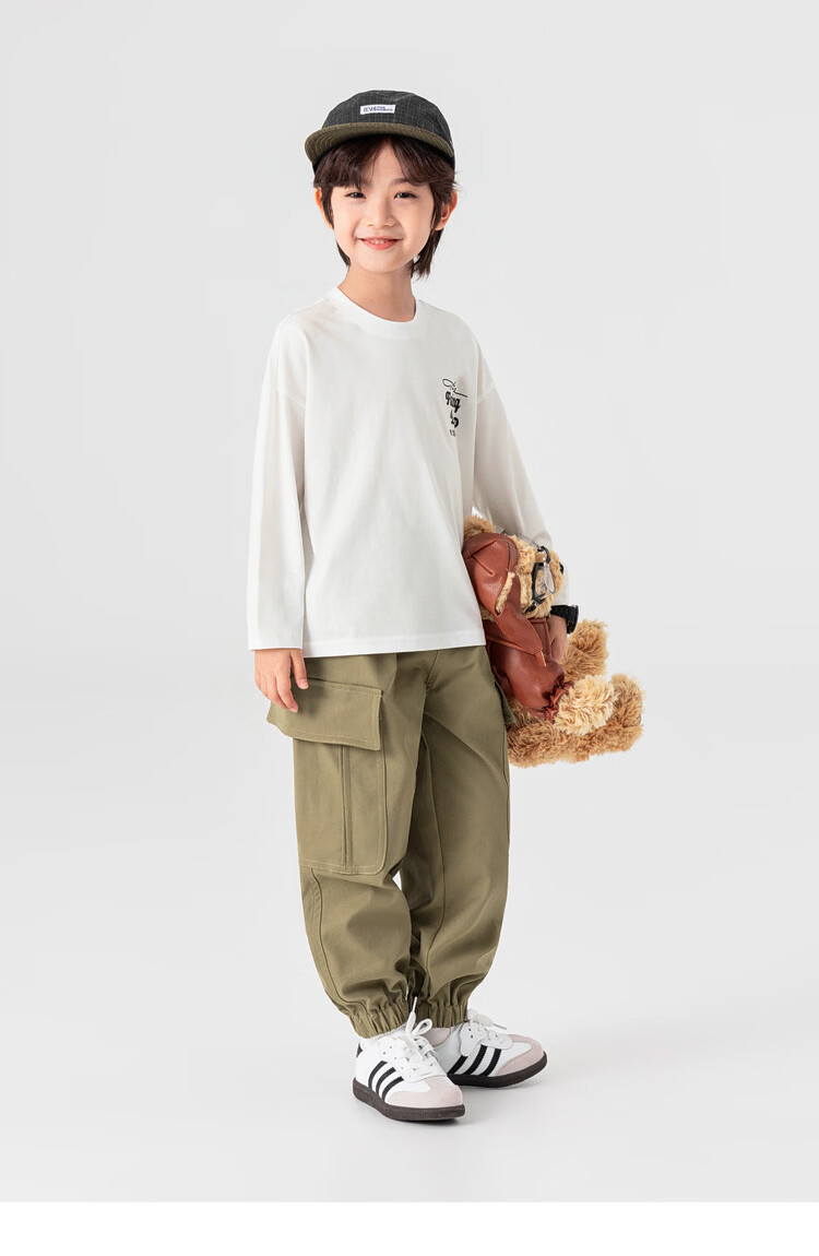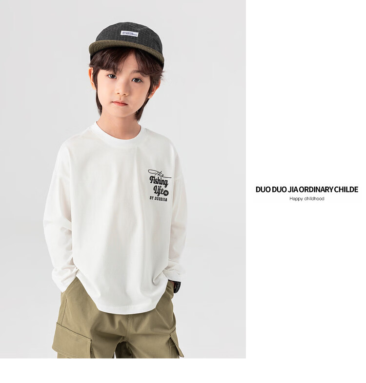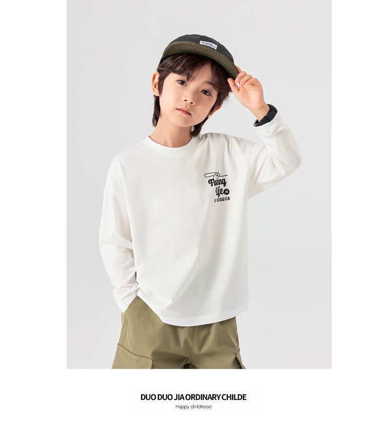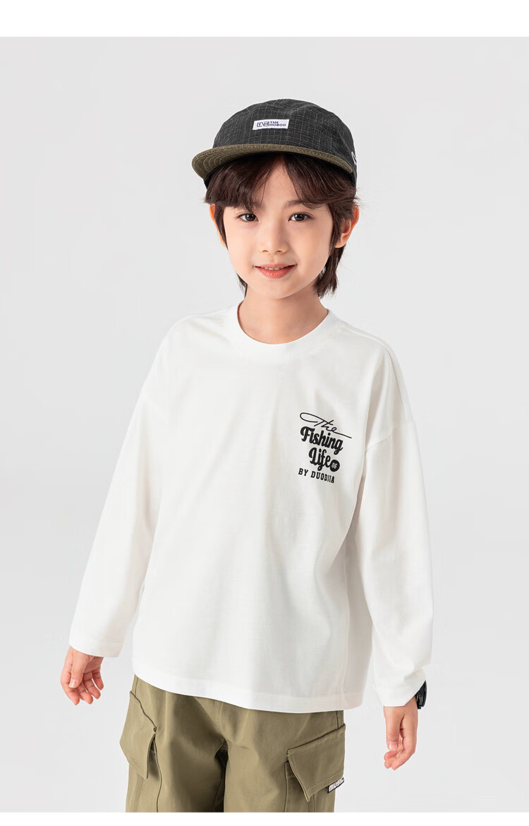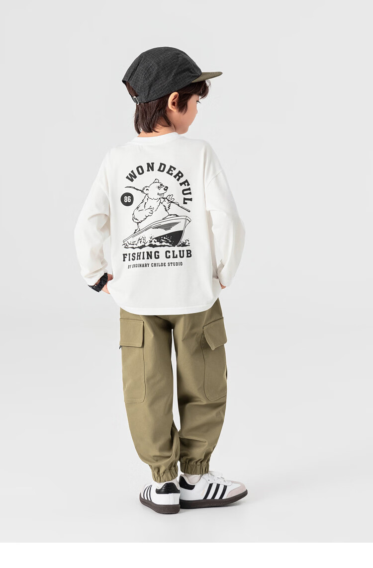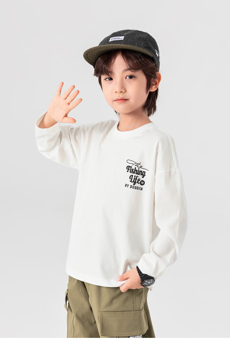 Duojia Class A Standard Children's T-shirt Spring and Autumn Adventure Bear Fun Long Sleeve Boys Casual Cotton Breathable Top Fashion White 110