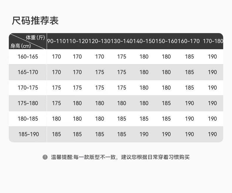 China (cm) 160-165/84-86 165-170 / 88-90 167-172 / 92-96 168-173 / 98-102 170-176 / 106-110