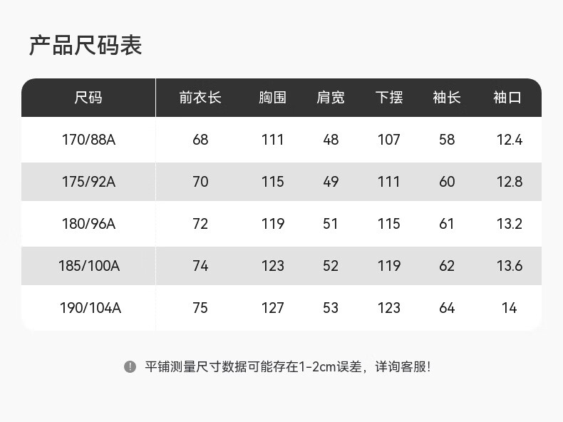 China (cm) 165 / 88-90 170 / 96-98 175 / 108-110 180 / 118-122 185 / 126-130