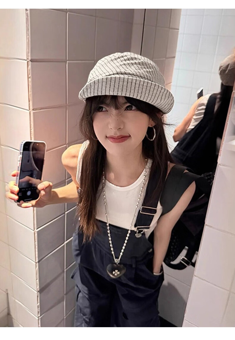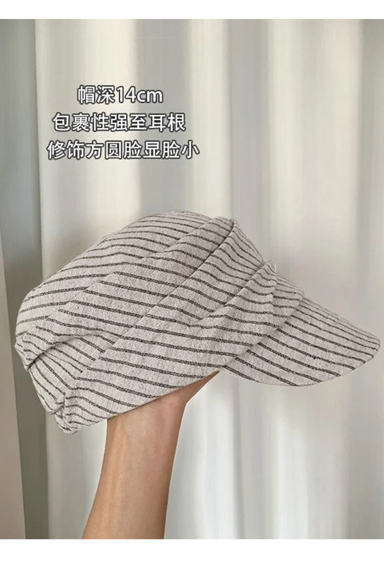 Retro pleated striped flip-up brim cross iron mark newsboy hat for women spring and summer breathable and small face black one size (54-59cm)