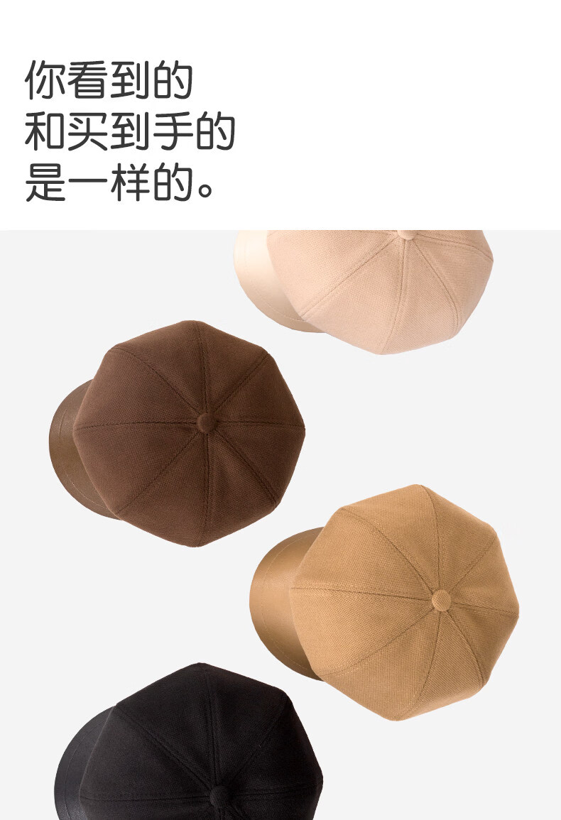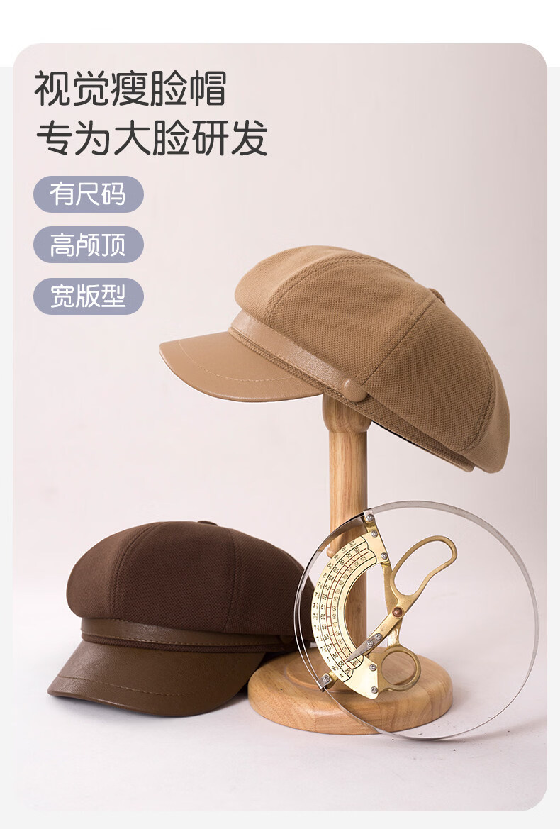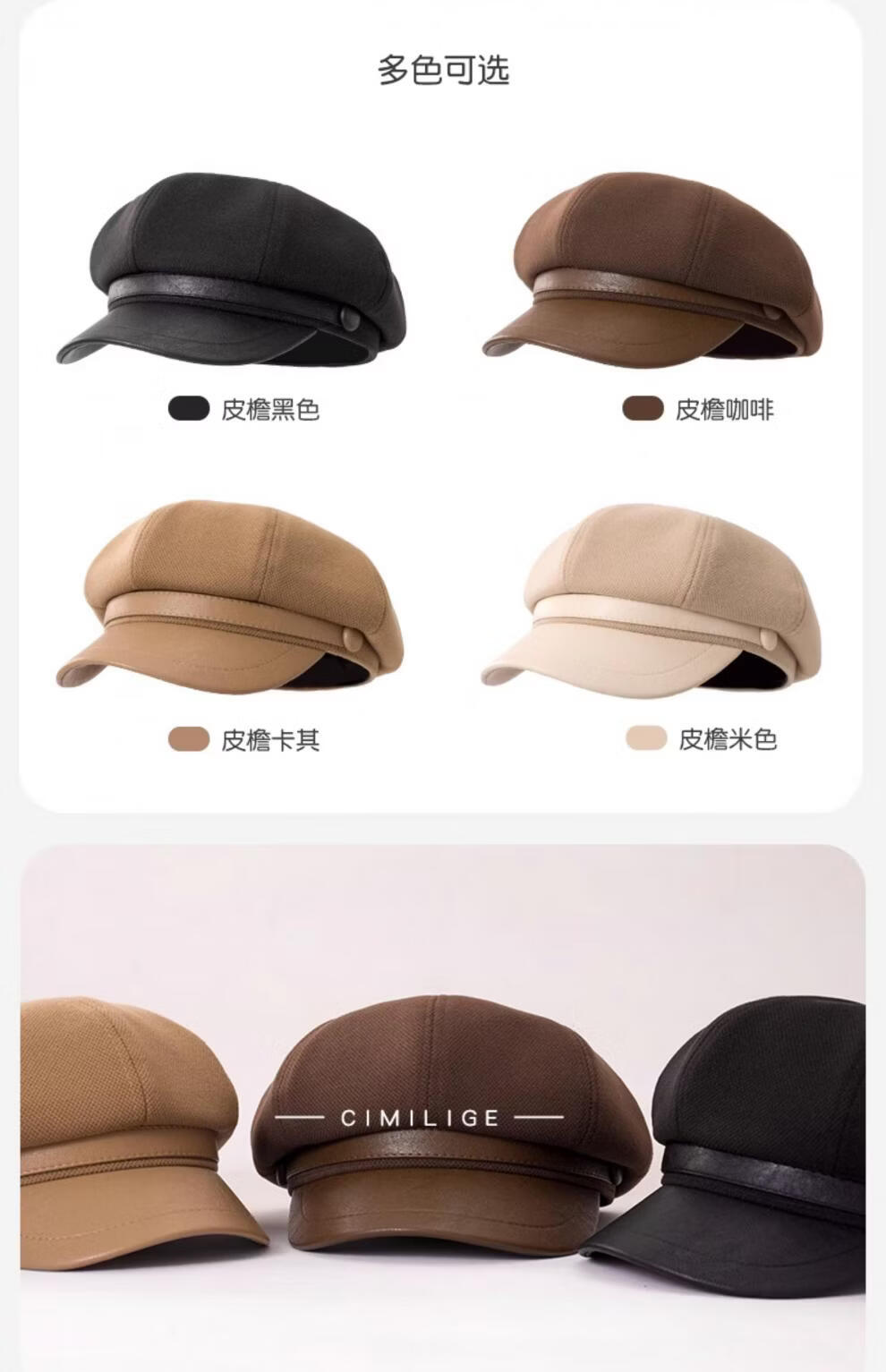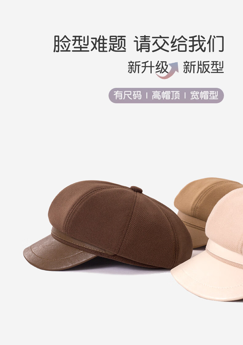 Suitable for square and round faces, small and large head circumference, PU leather octagonal hat, retro beret, women's autumn and winter woolen woolen hat for small head circumference, black M small size (52-55c)