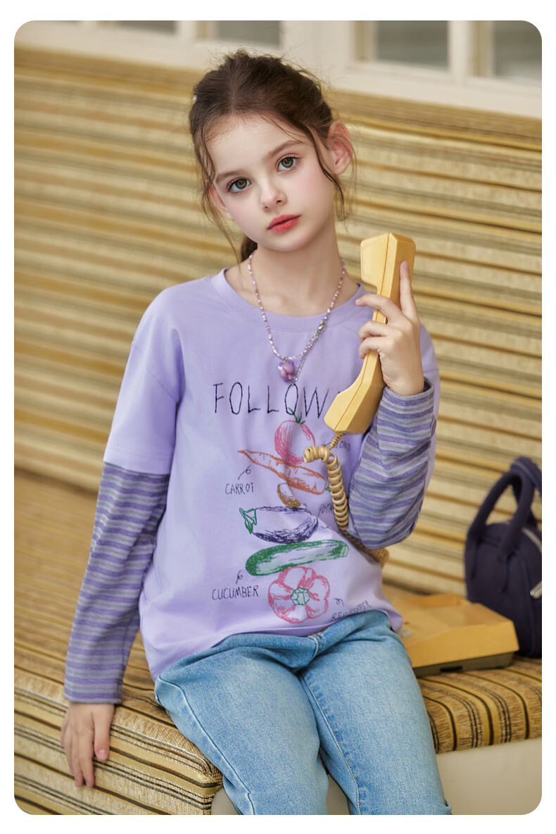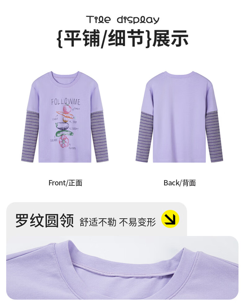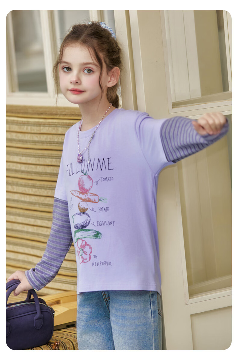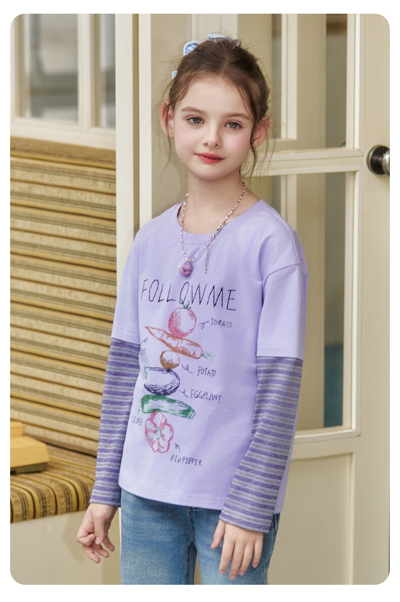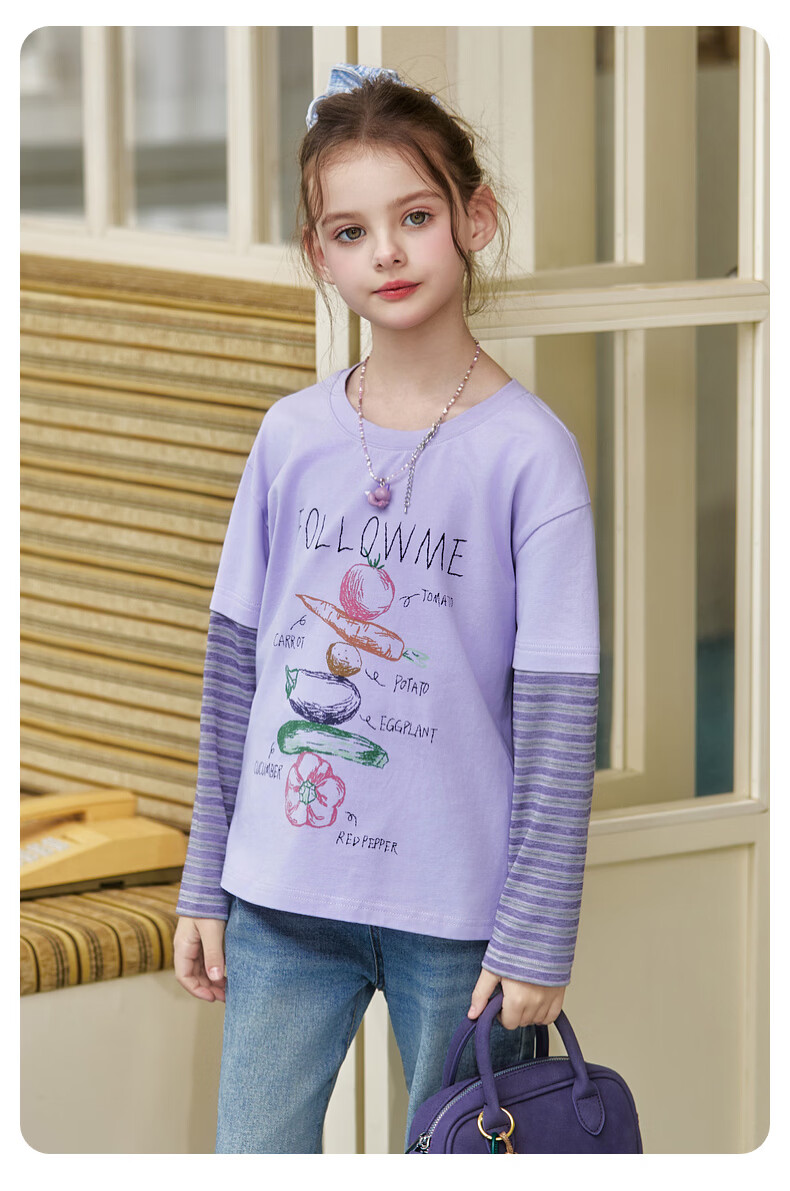 Fuluomi girls fake two-piece T-shirt spring new casual striped stitching long-sleeved T-shirt purple 110