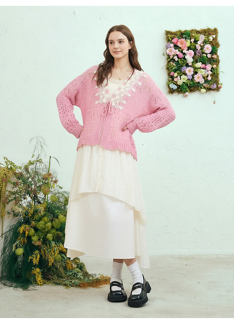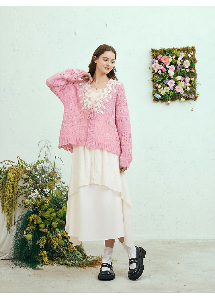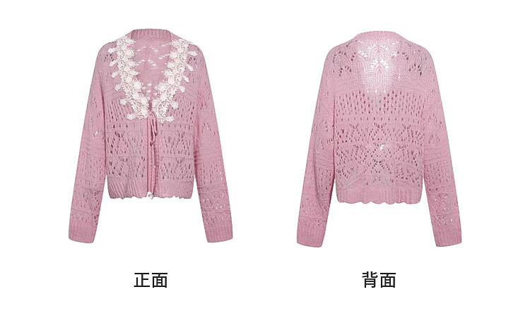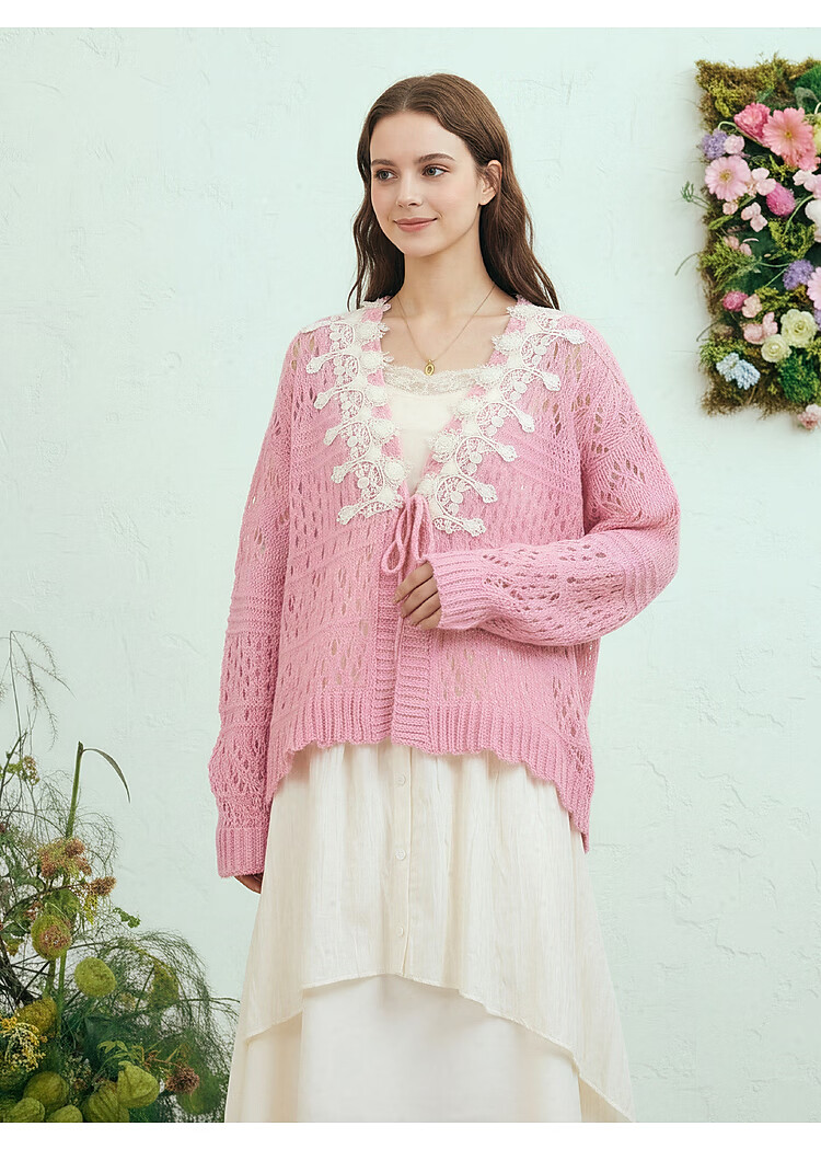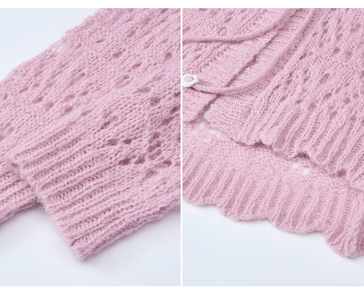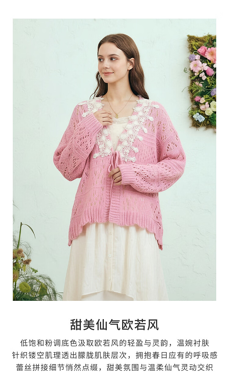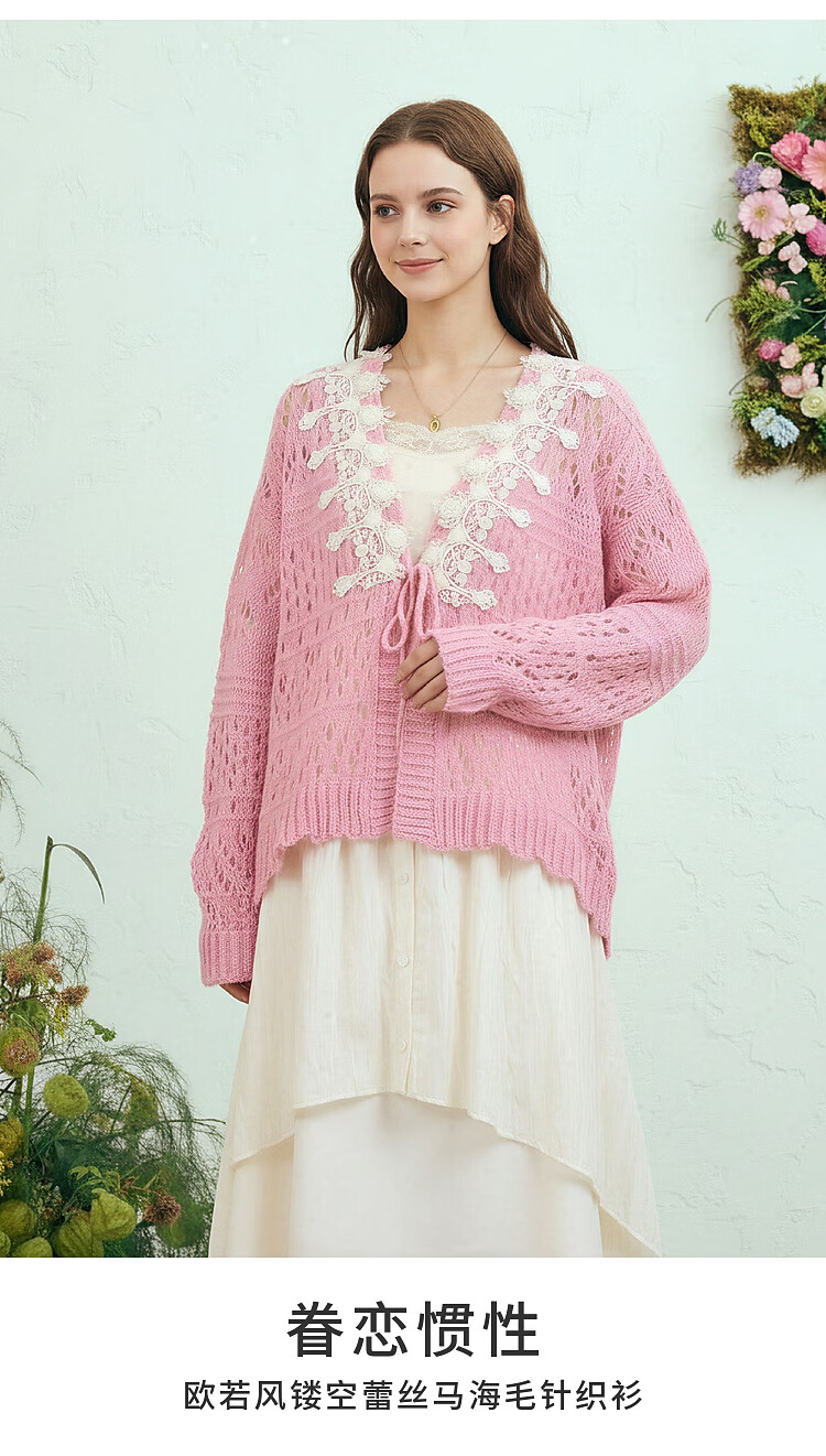 Two or three things are nostalgic for inertia 2026 spring new style sweet lace stitching hollow mohair strap knitted cardigan for women light pink-y S