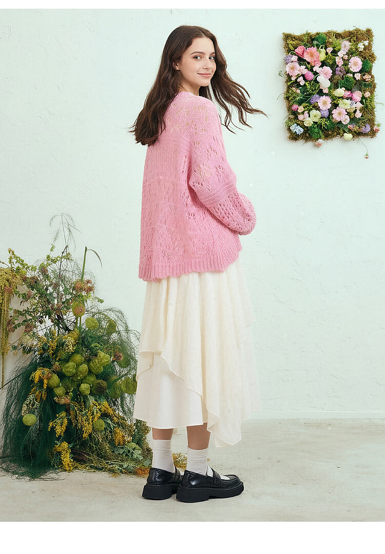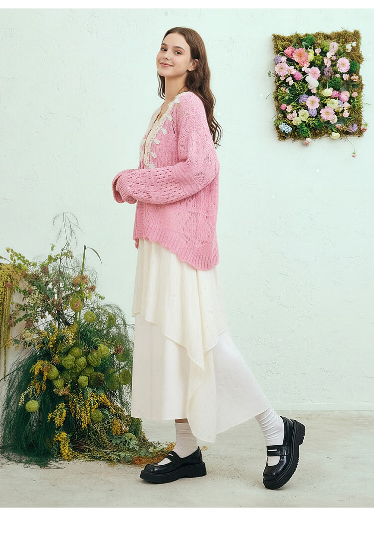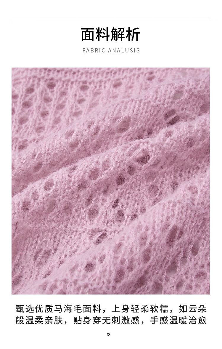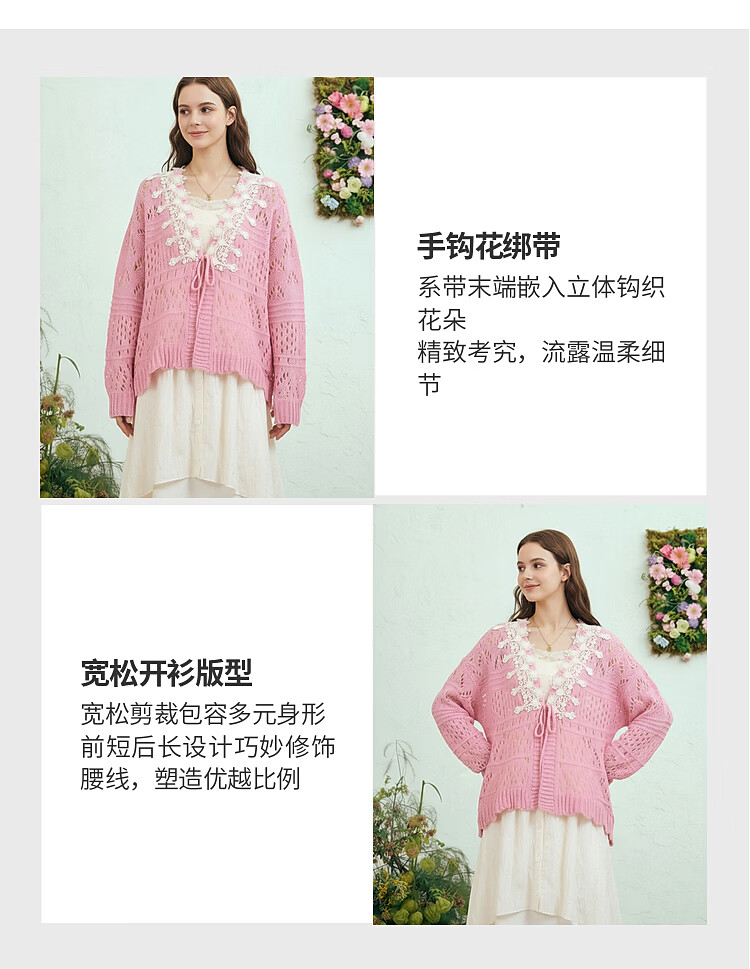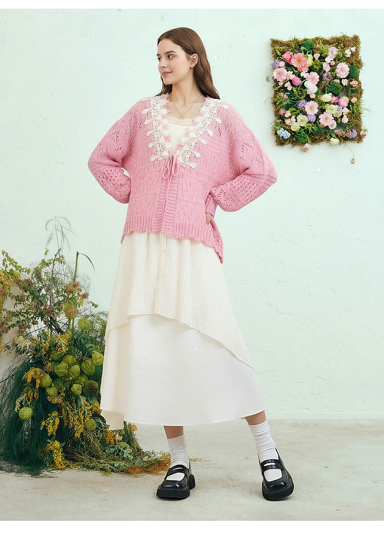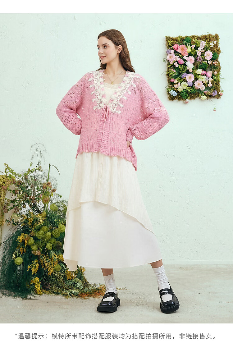 Two or three things are nostalgic for inertia 2026 spring new style sweet lace stitching hollow mohair strap knitted cardigan for women light pink-y S