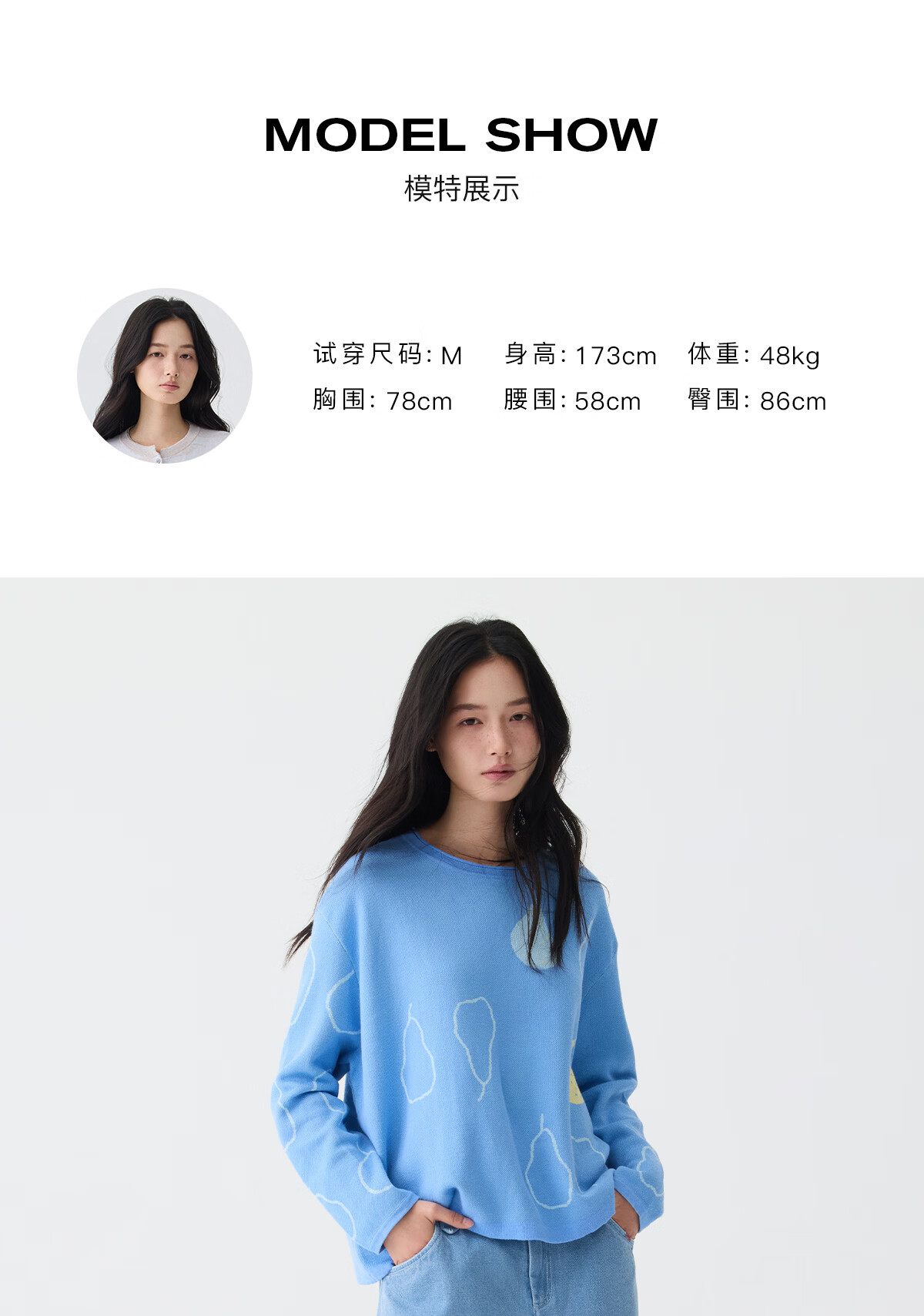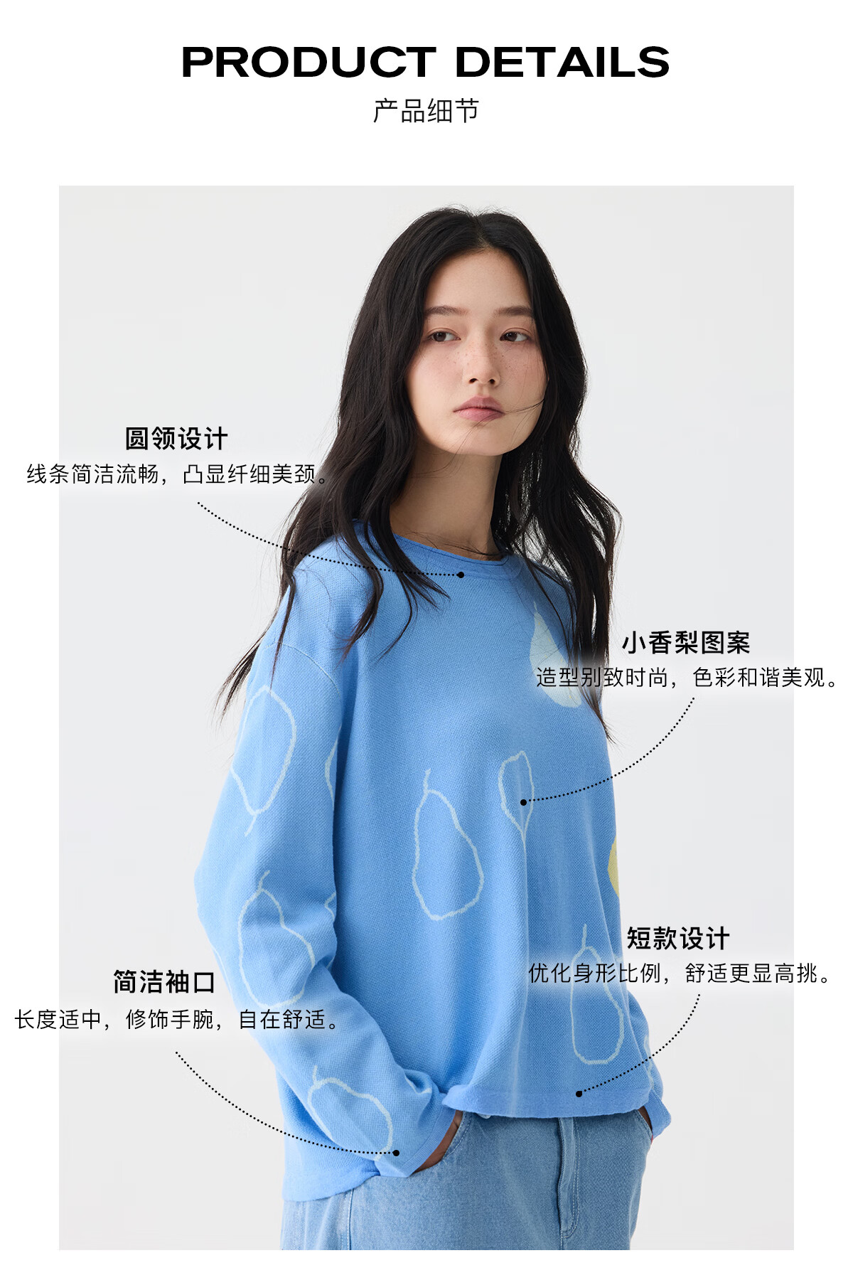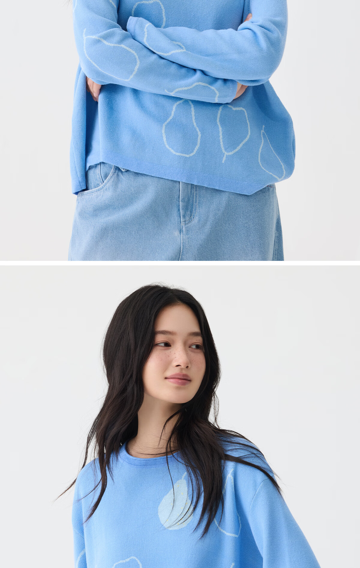 Siqin Siqin 2026 Spring New Lake Blue Cotton and Linen Jacquard Sweater Round Neck Loose Sweater Temperament Women BFCB00948 Lake Blue M