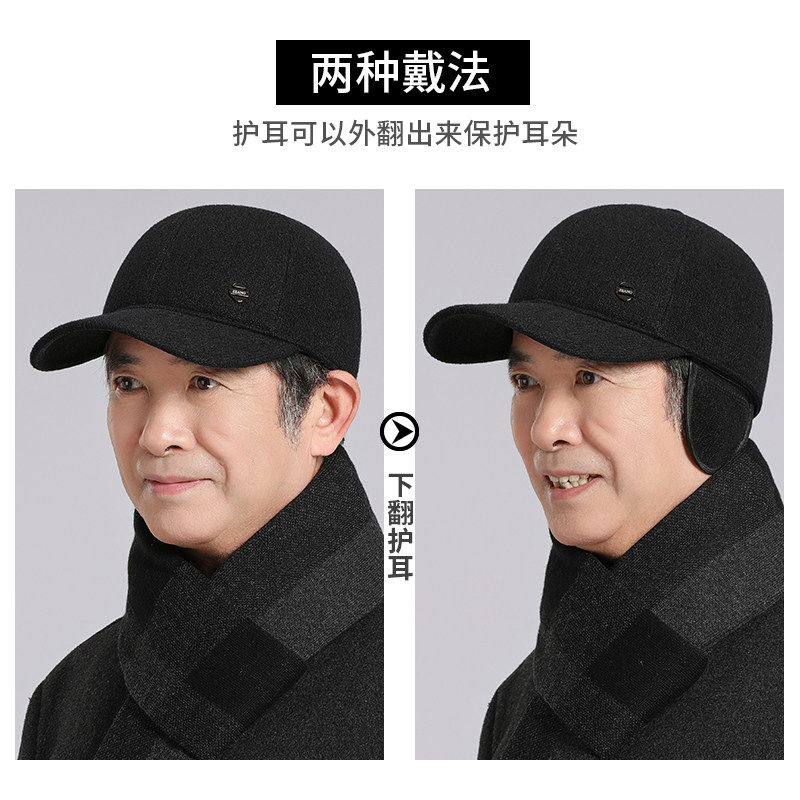 Autumn and winter hats for men, middle-aged and elderly dads, woolen plus pom-pom hats, grandpa warm ear protection thick peaked caps, black single-piece hat, one size fits all, one size adjustable