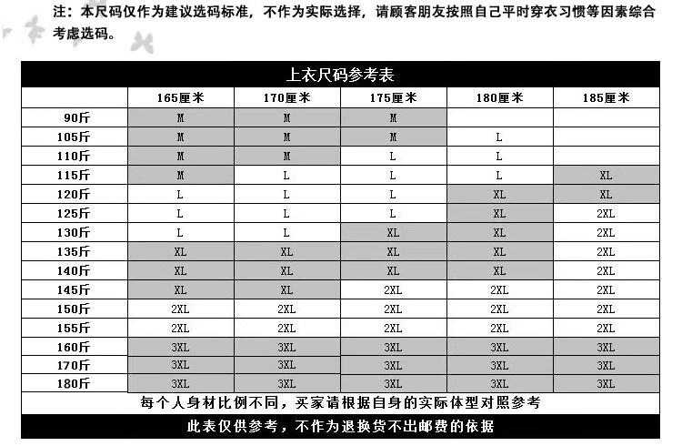 China (cm) 165 / 88-90 170 / 96-98 175 / 108-110 180 / 118-122 185 / 126-130