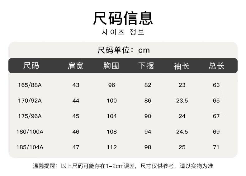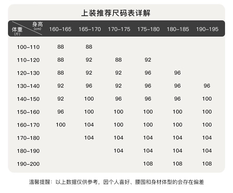 China (cm) 160-165/84-86 165-170 / 88-90 167-172 / 92-96 168-173 / 98-102 170-176 / 106-110