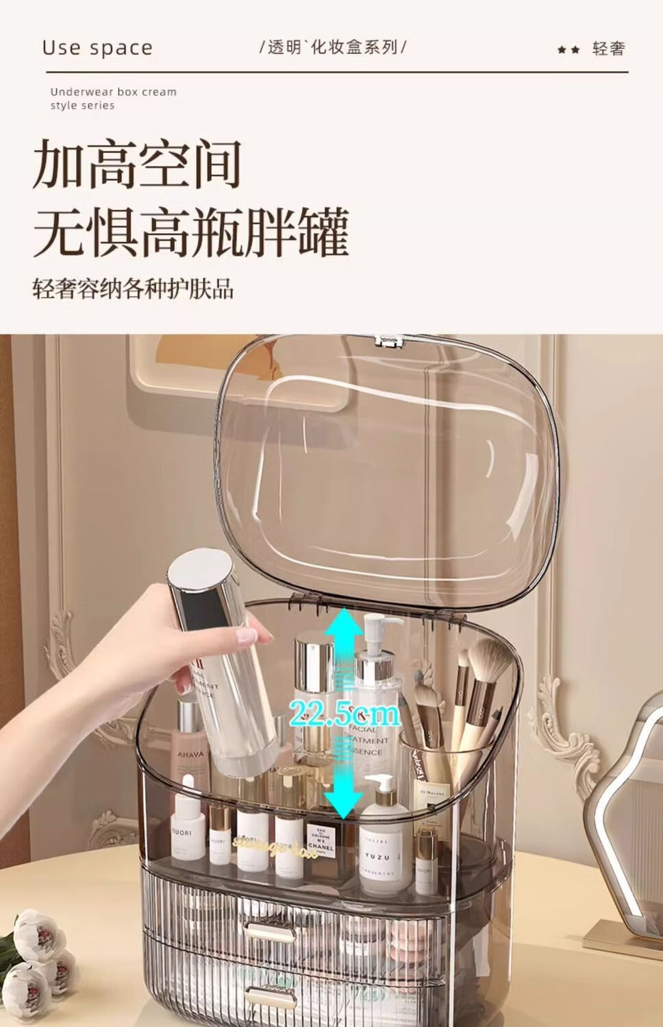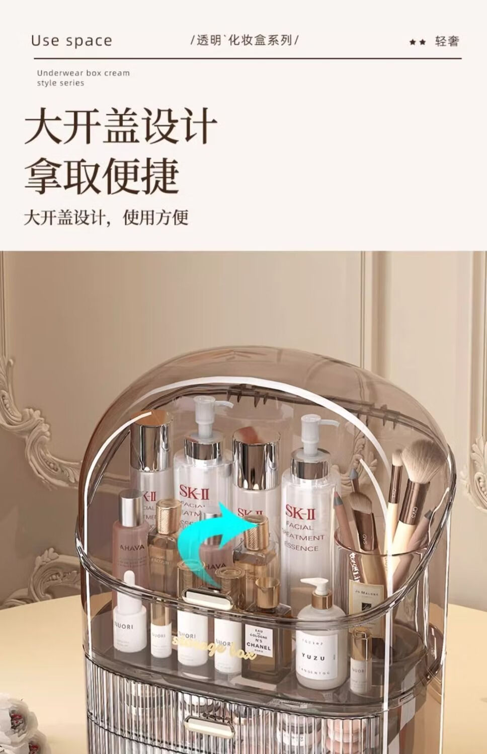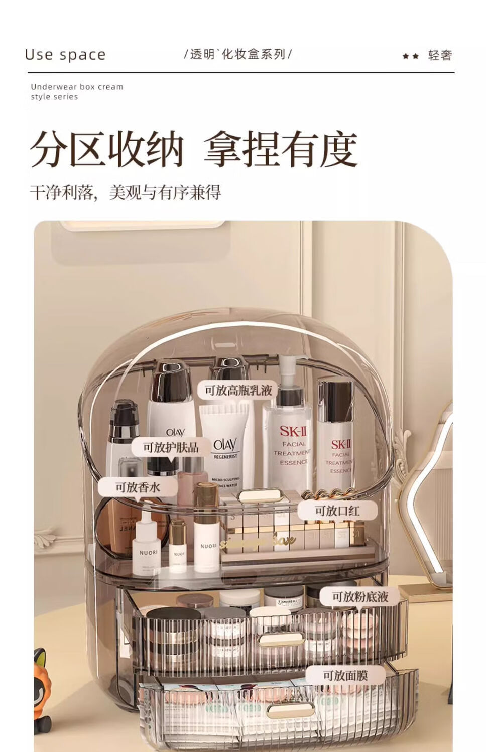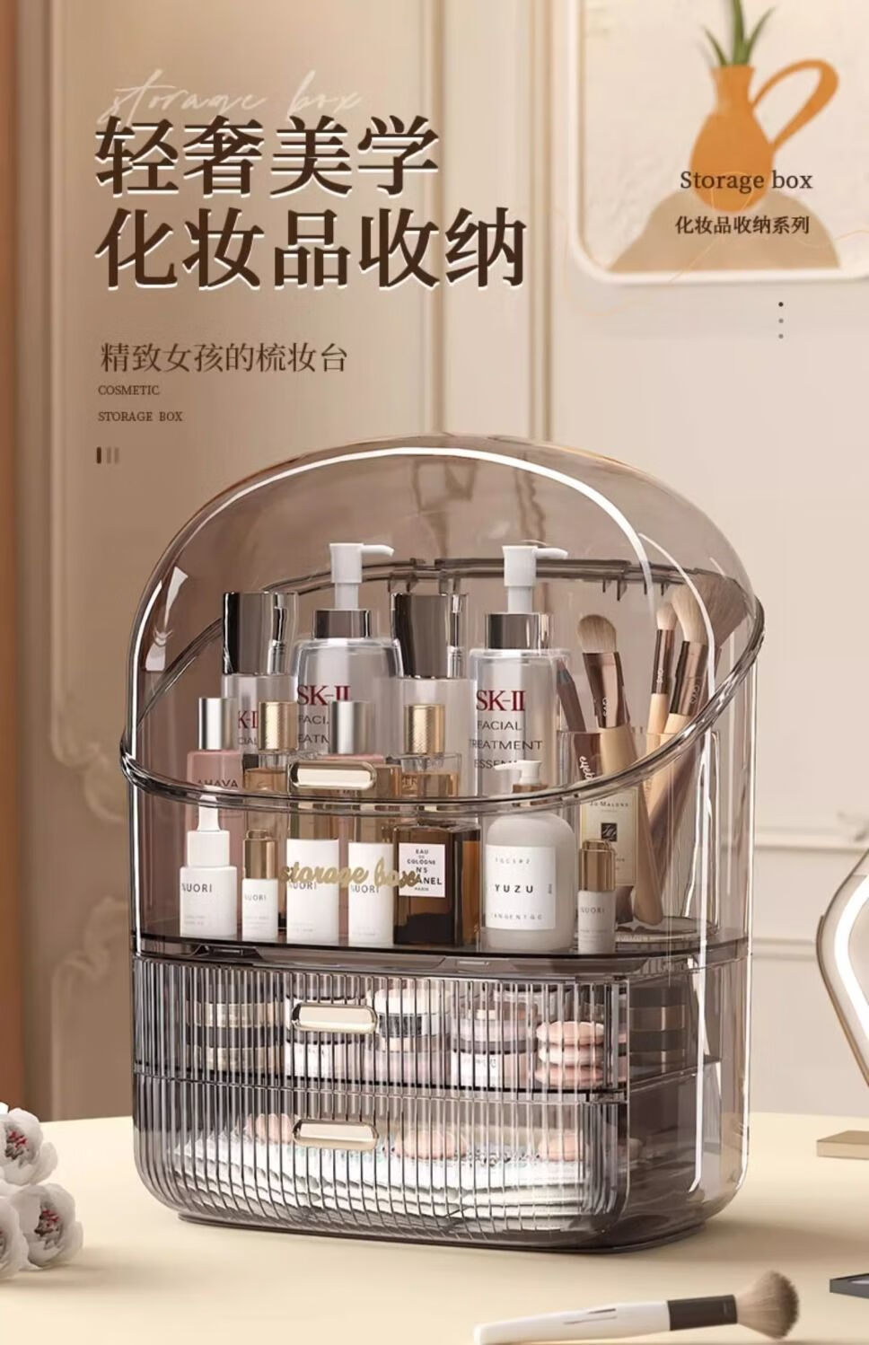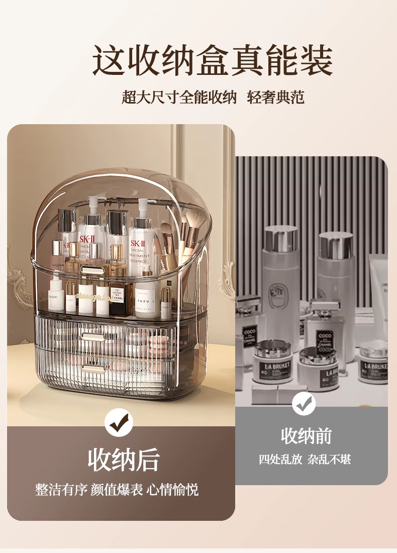Sailotou cosmetic storage box, dressing table, desktop storage, transparent box, cosmetic box storage rack, transparent brown three-layer with lid