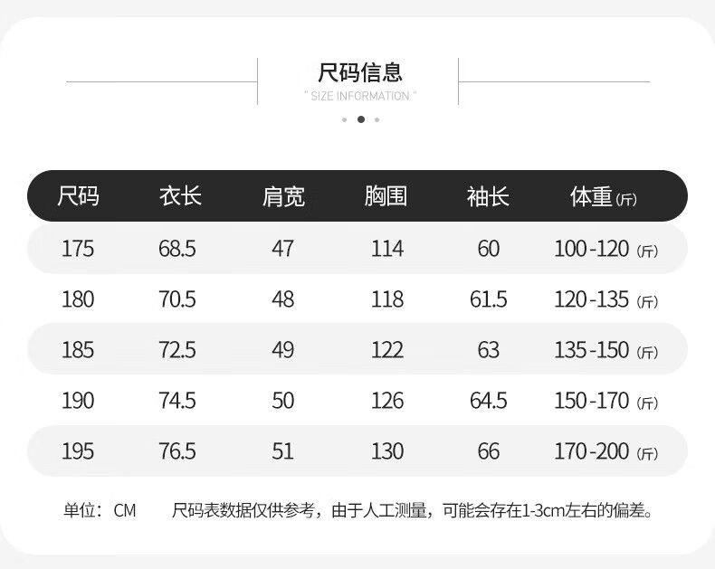 China (cm) 165 / 88-90 170 / 96-98 175 / 108-110 180 / 118-122 185 / 126-130