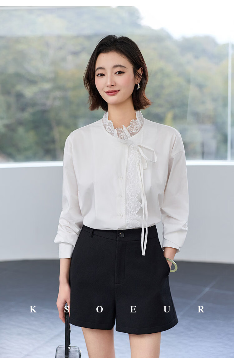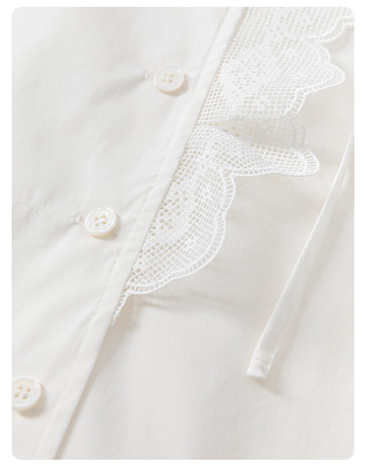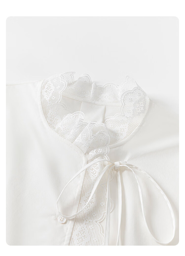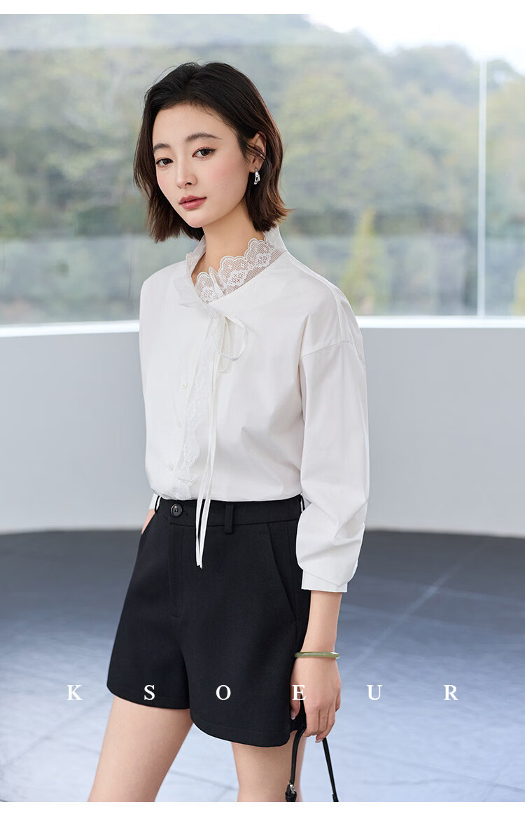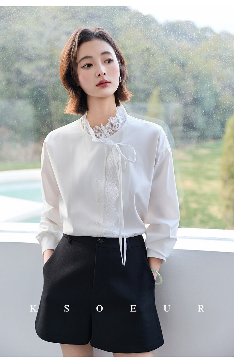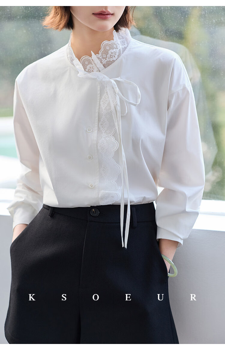 KSOEUR K sister fell in love at first sight exquisite lazy Chinese style lace strap pima cotton shirt for women white L