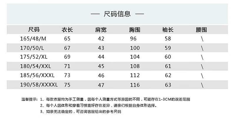 China (cm) 165 / 88-90 170 / 96-98 175 / 108-110 180 / 118-122 185 / 126-130