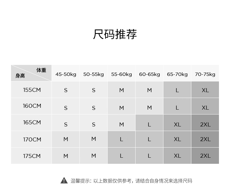 China (cm) 165 / 88-90 170 / 96-98 175 / 108-110 180 / 118-122 185 / 126-130