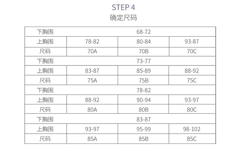 China (cm) 160-165/84-86 165-170 / 88-90 167-172 / 92-96 168-173 / 98-102 170-176 / 106-110