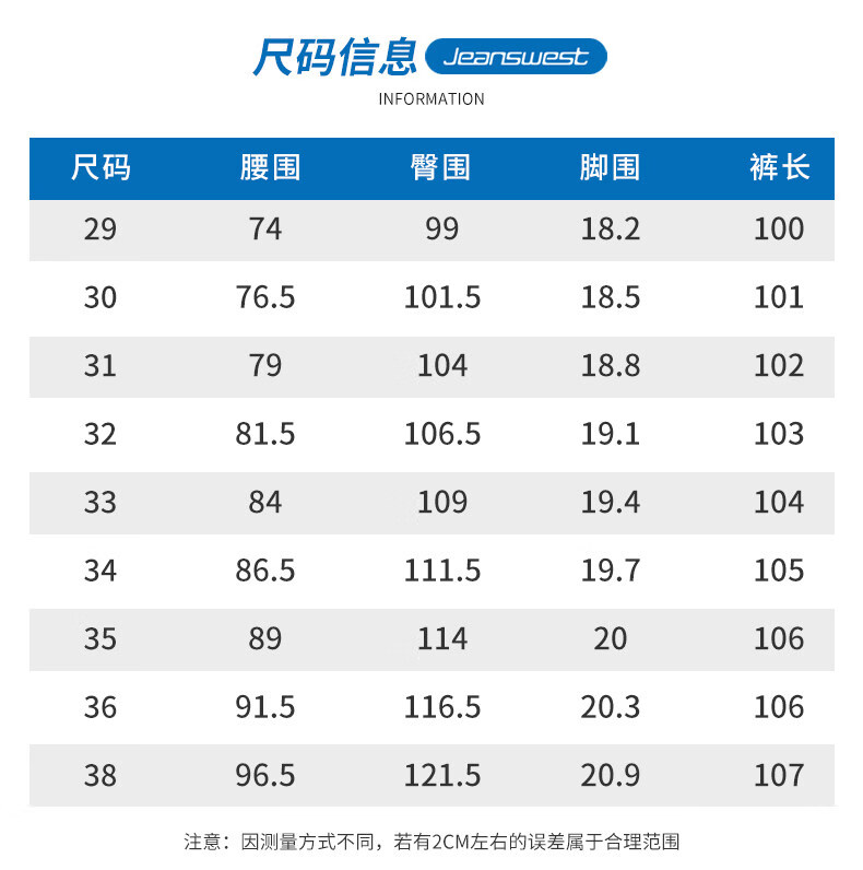 Outseam (cm) 99 cm 101.5 cm 104 cm 106.5 cm 109 cm