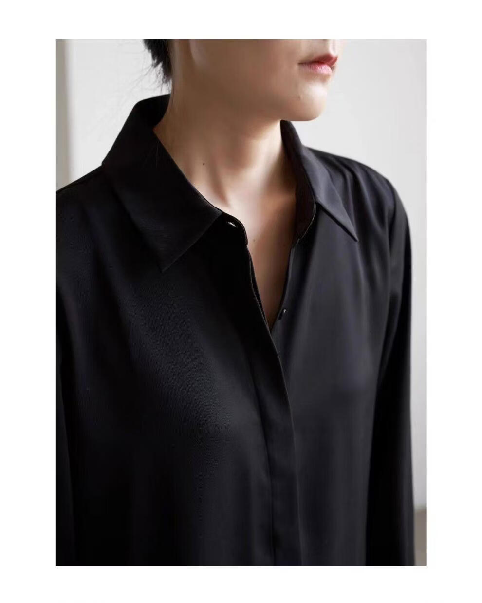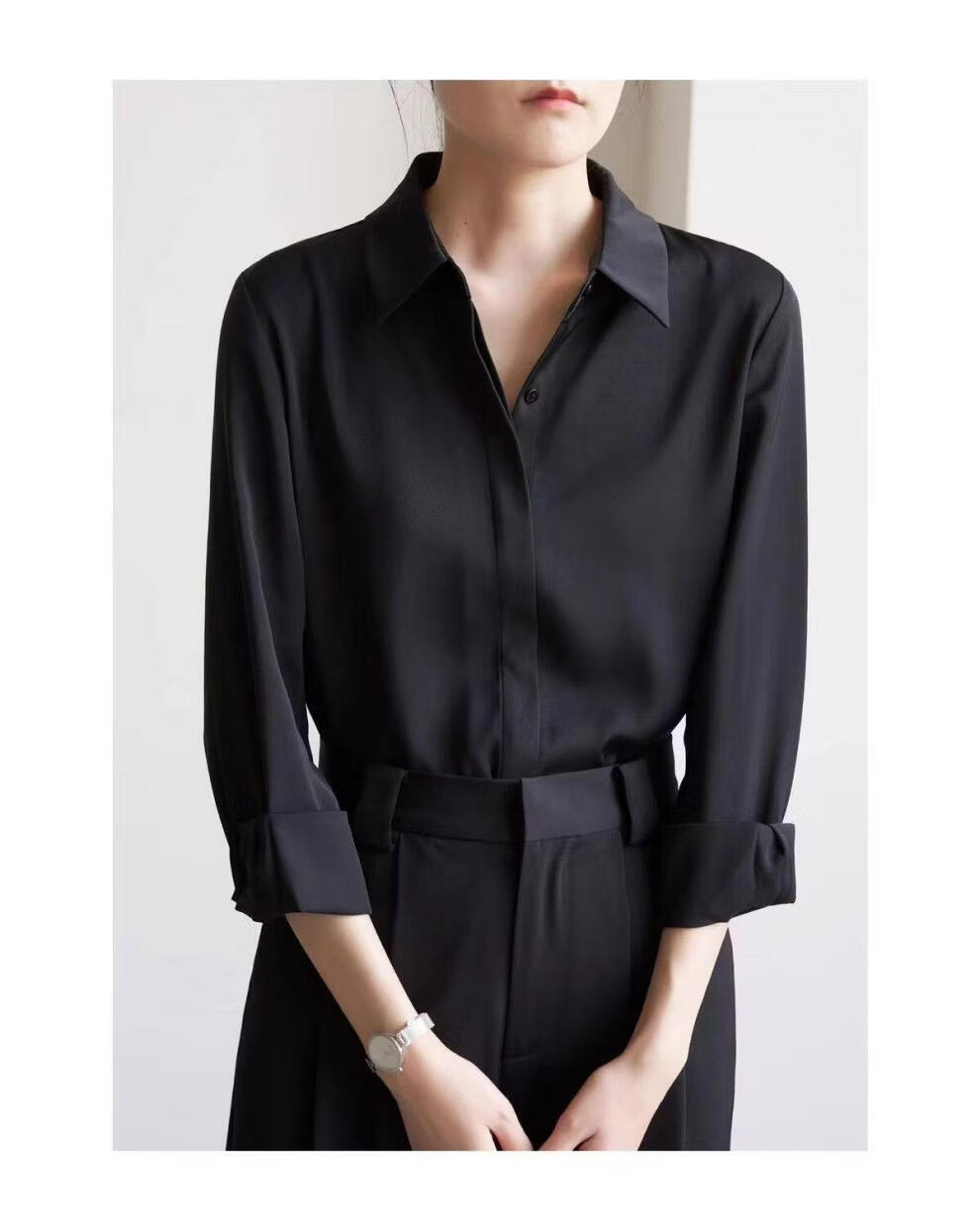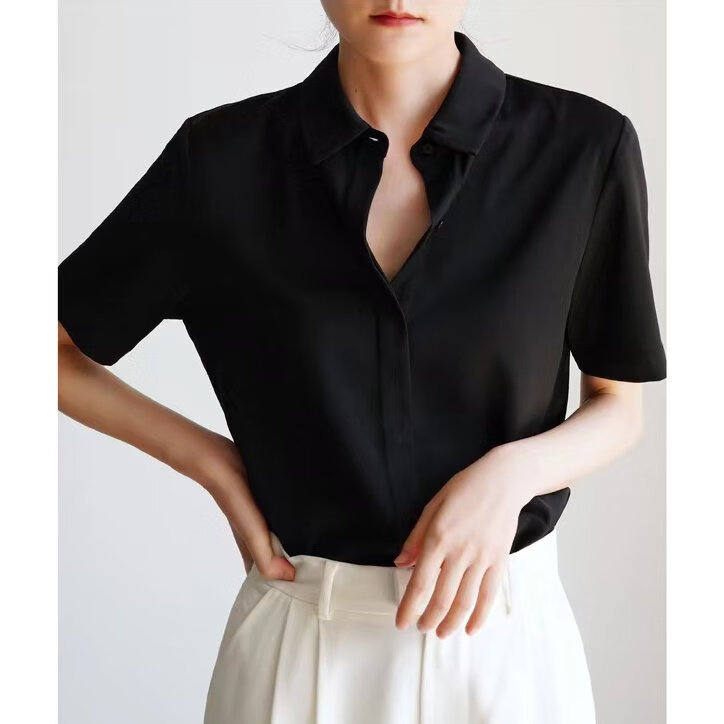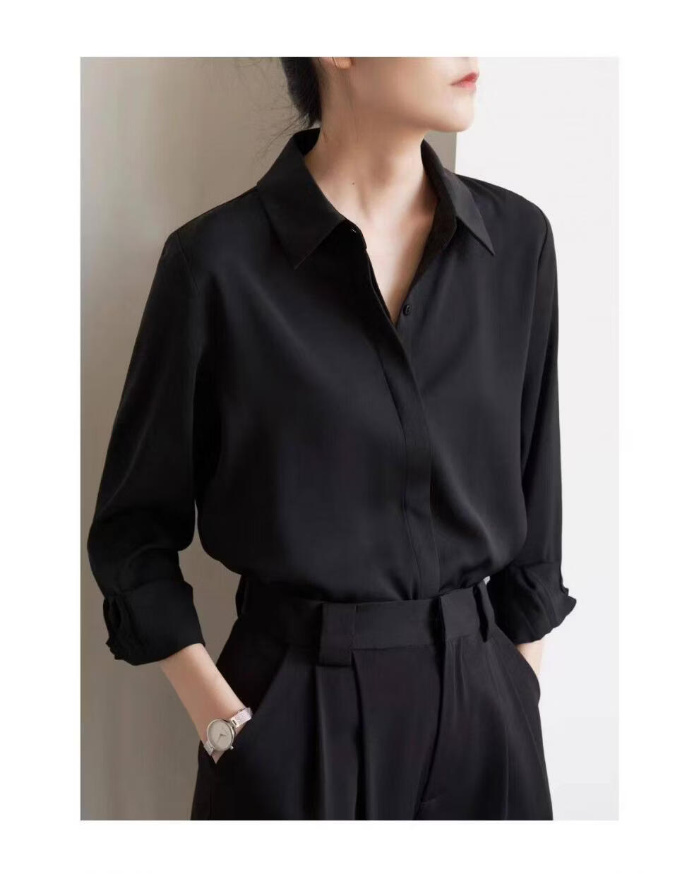 ROMON temperament black chiffon shirt early autumn French commuter long-sleeved shirt women's professional quality shoulder shirt top V-neck exposed button white long sleeve 7XL recommended 170-190Jin Jin equals 0.5 kg