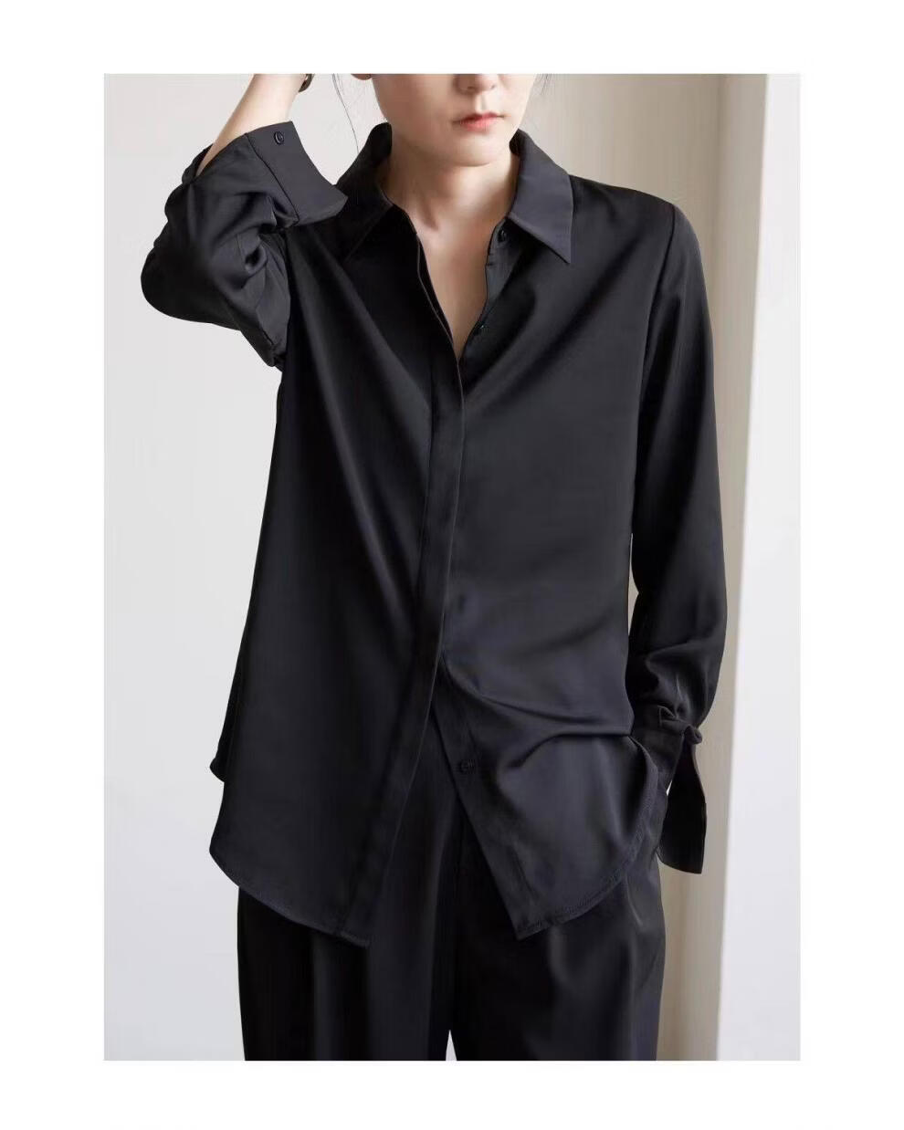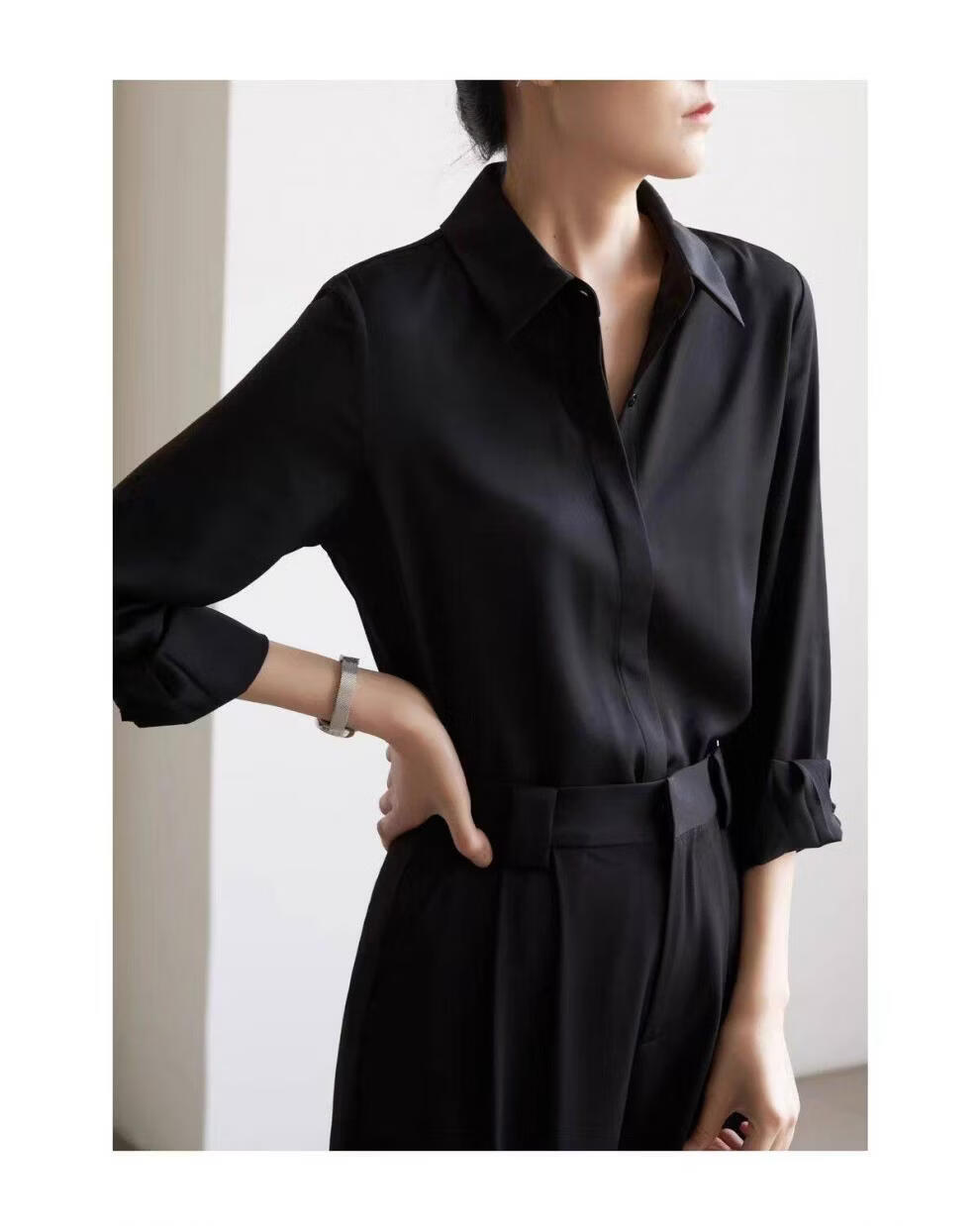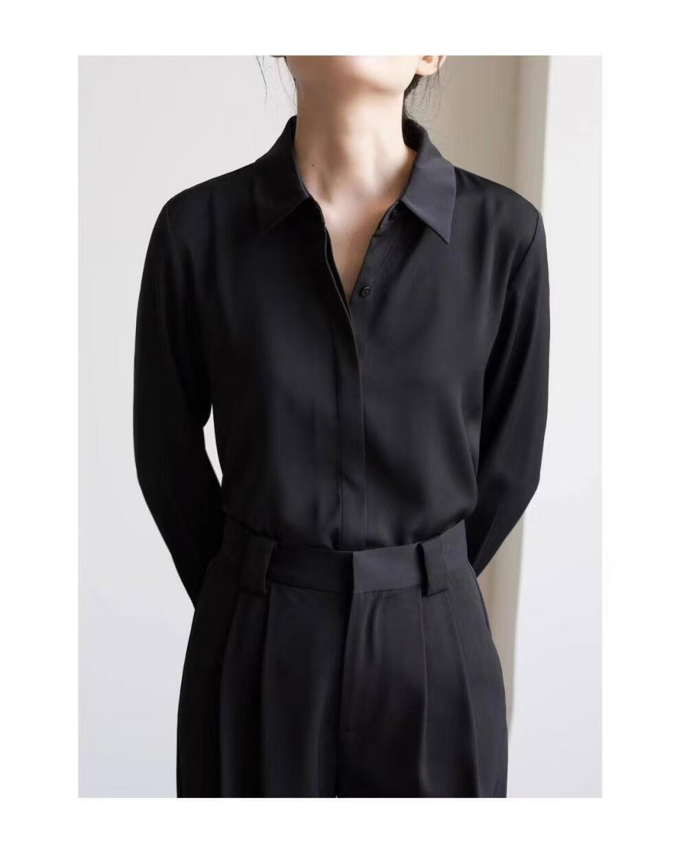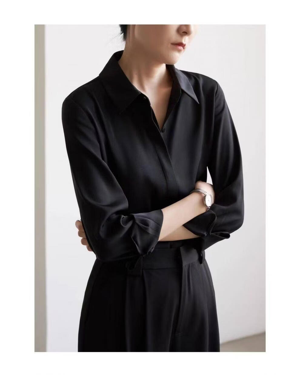 ROMON temperament black chiffon shirt early autumn French commuter long-sleeved shirt women's professional quality shoulder shirt top V-neck exposed button white long sleeve 7XL recommended 170-190Jin Jin equals 0.5 kg