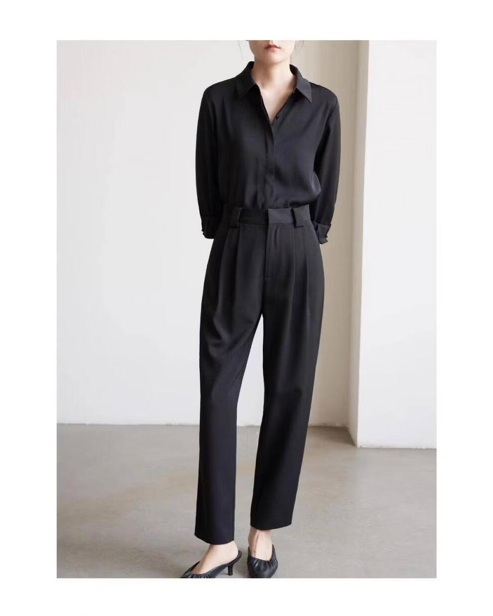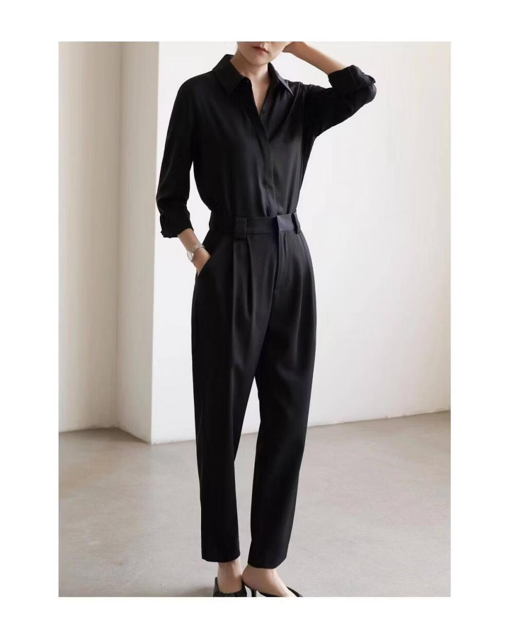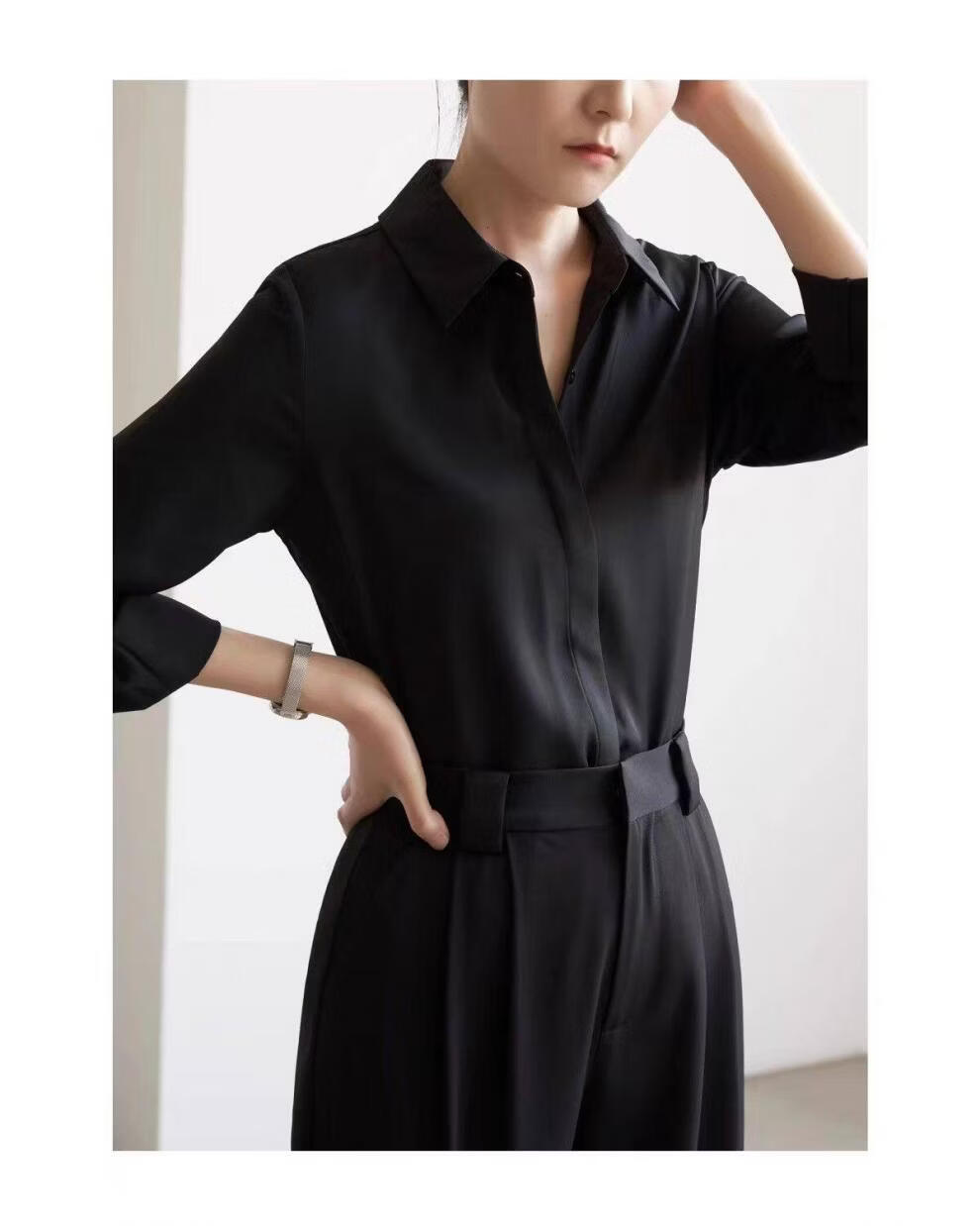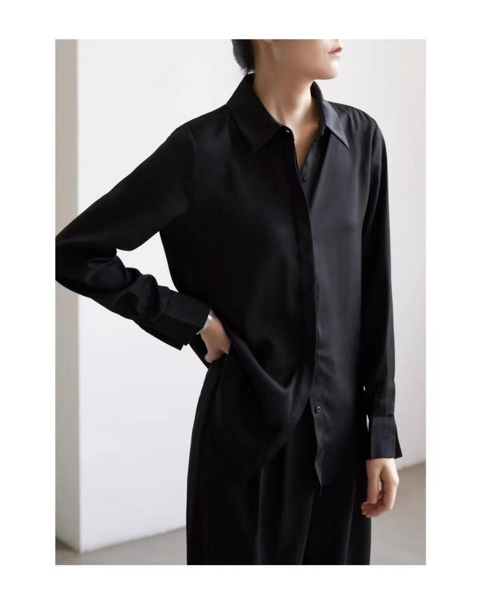 ROMON temperament black chiffon shirt early autumn French commuter long-sleeved shirt women's professional quality shoulder shirt top V-neck exposed button white long sleeve 7XL recommended 170-190Jin Jin equals 0.5 kg