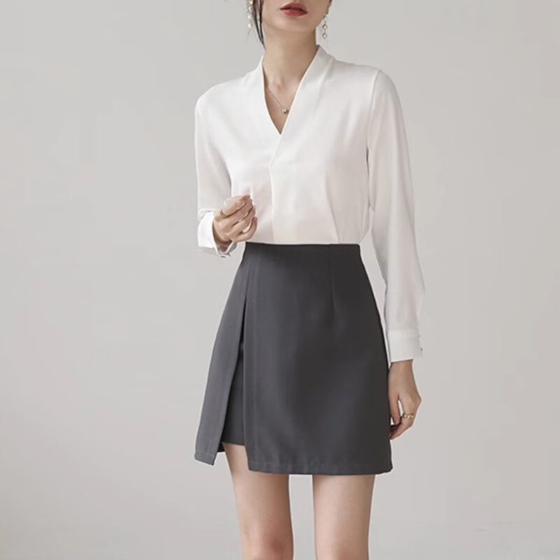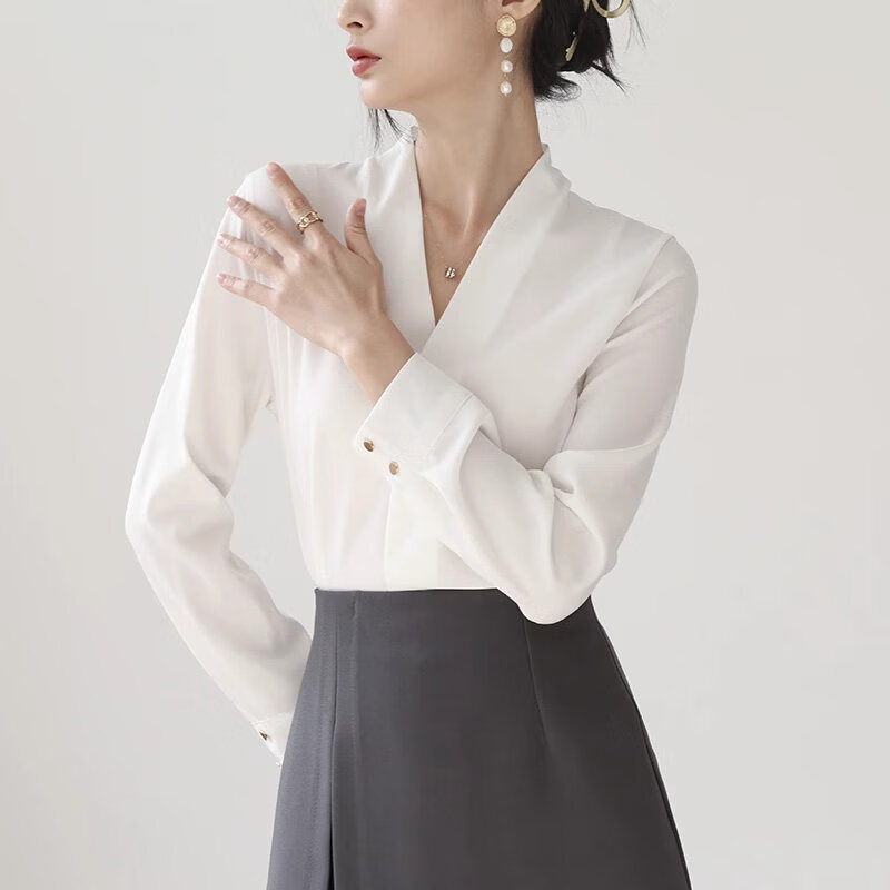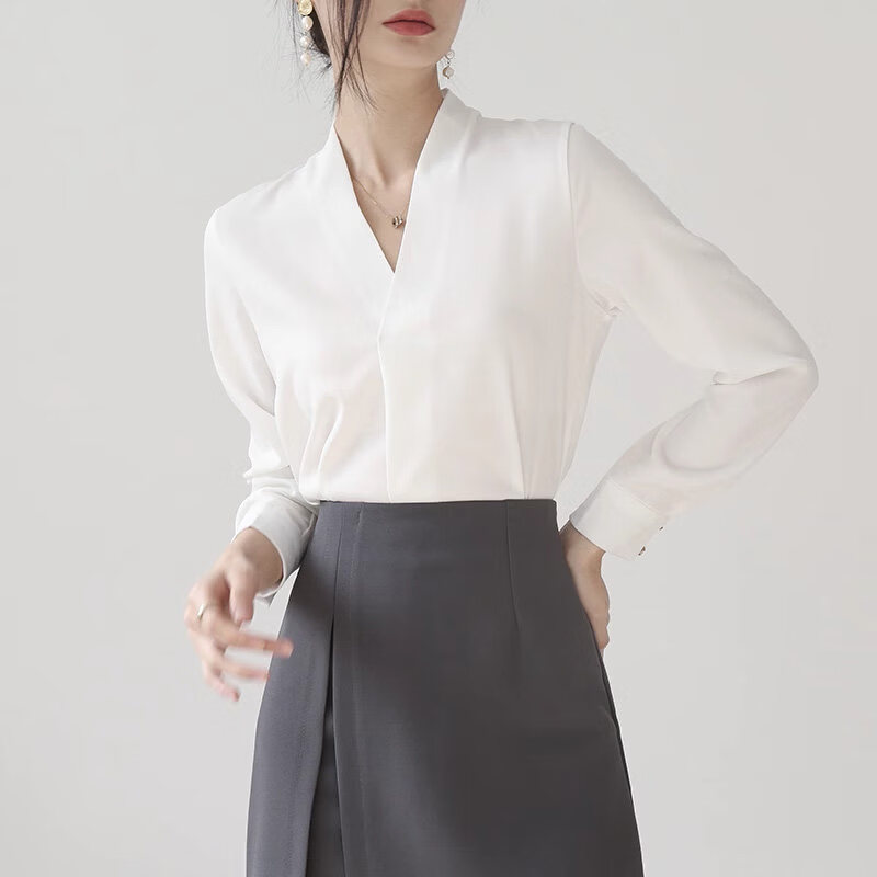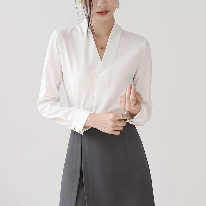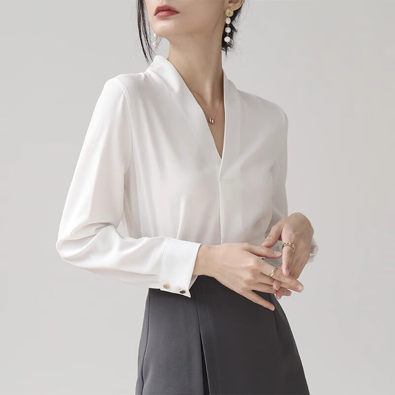 Woodpecker high-end collarless white shirt women's work clothes top autumn style temperament chiffon v-neck professional long-sleeved shirt white L