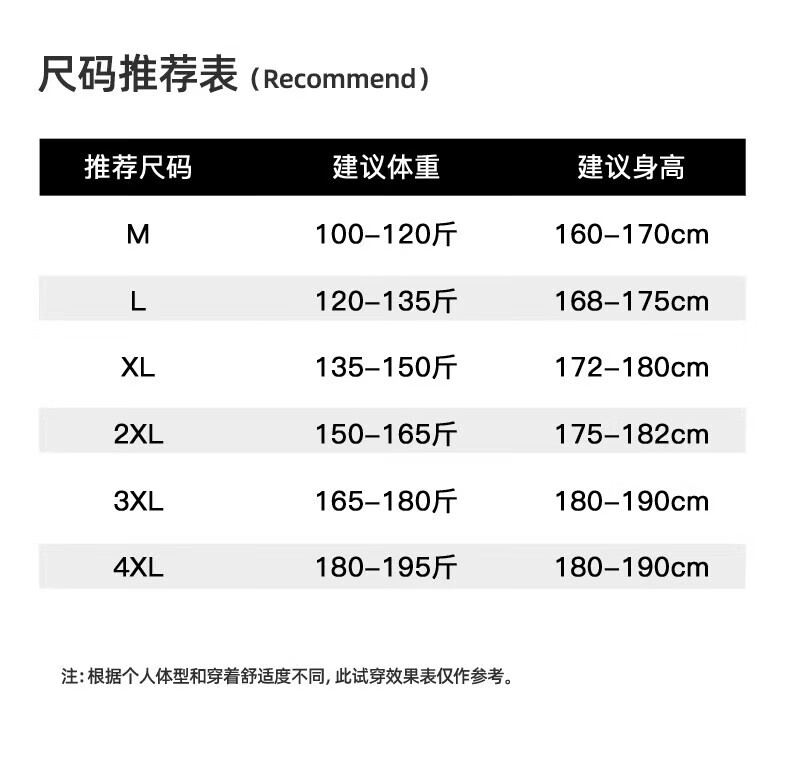 China (cm) 165 / 88-90 170 / 96-98 175 / 108-110 180 / 118-122 185 / 126-130